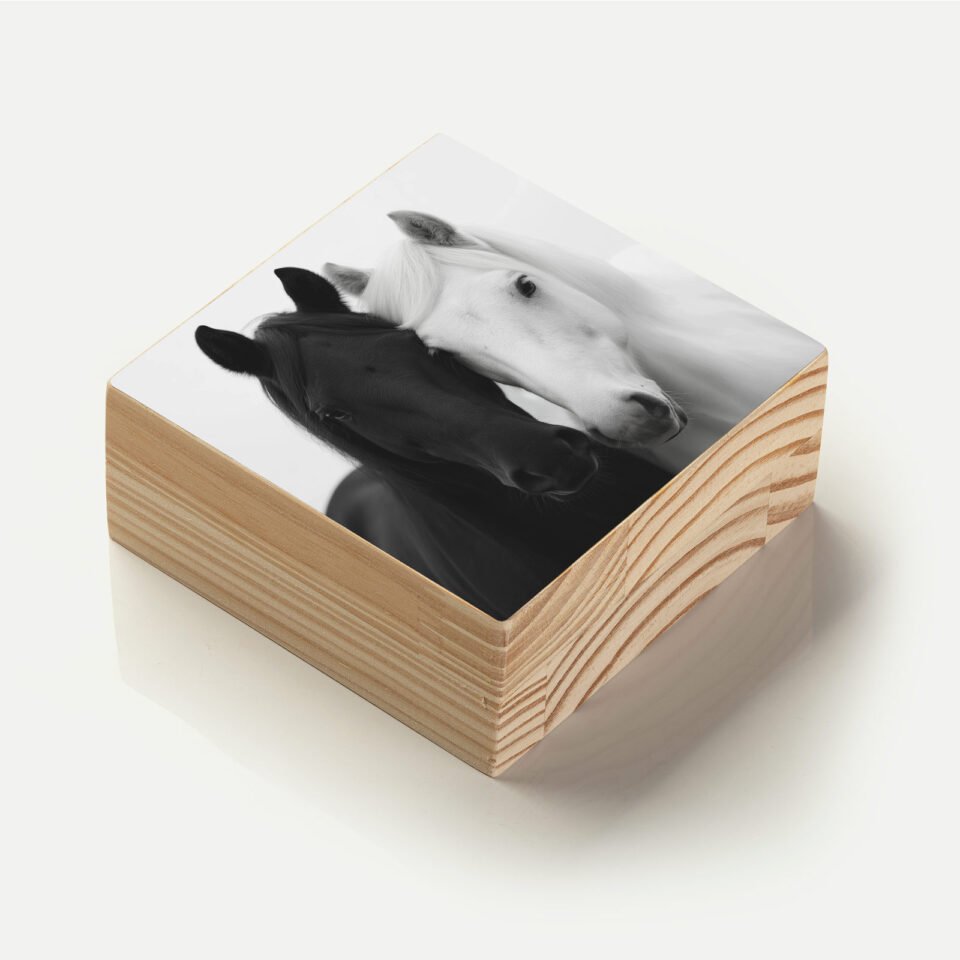 Um totem com arte monocromática de cavalo branco, simbolizando liberdade e força. Ideal para espaços sofisticados e cheios de personalidade.