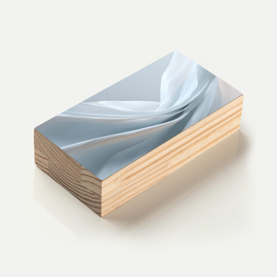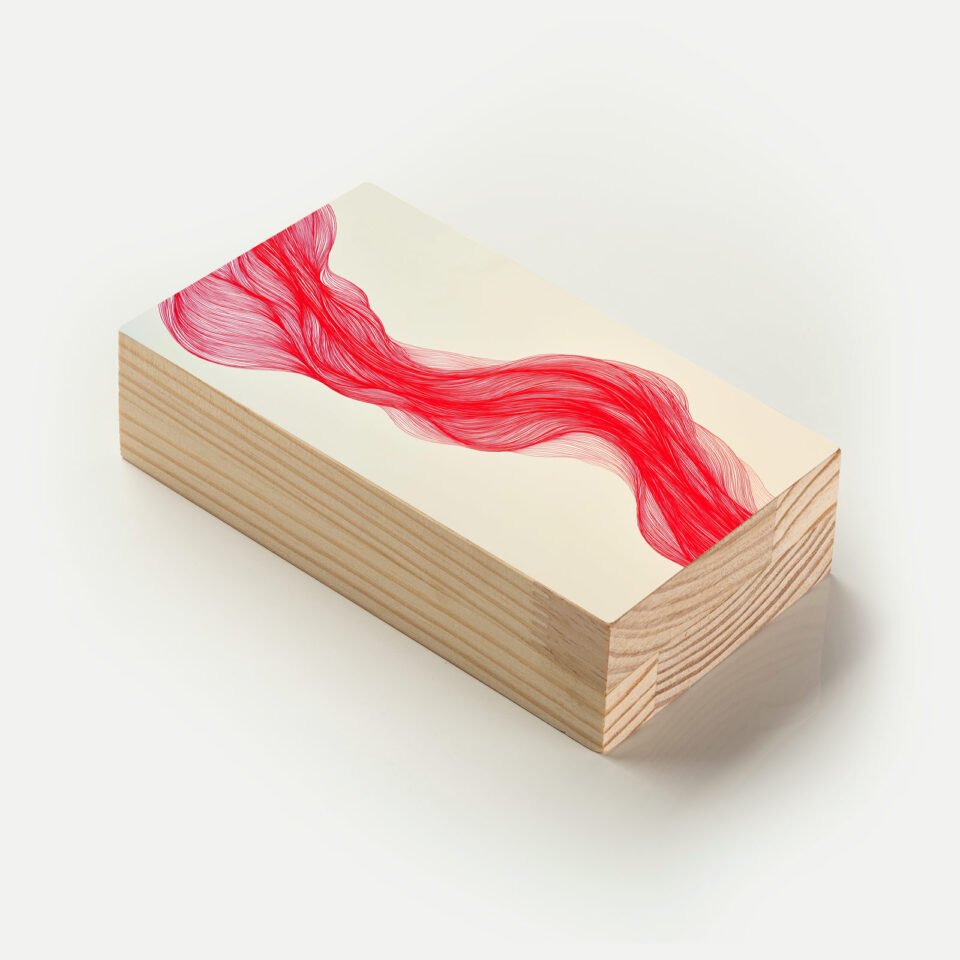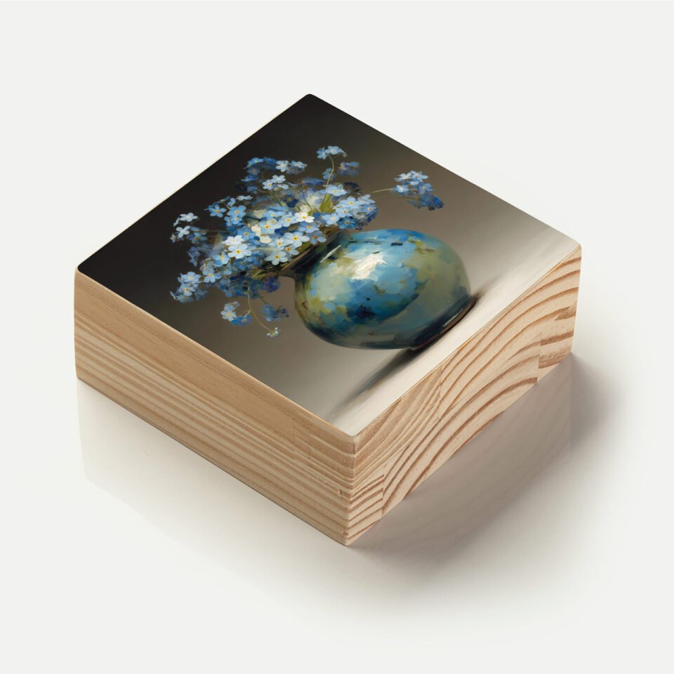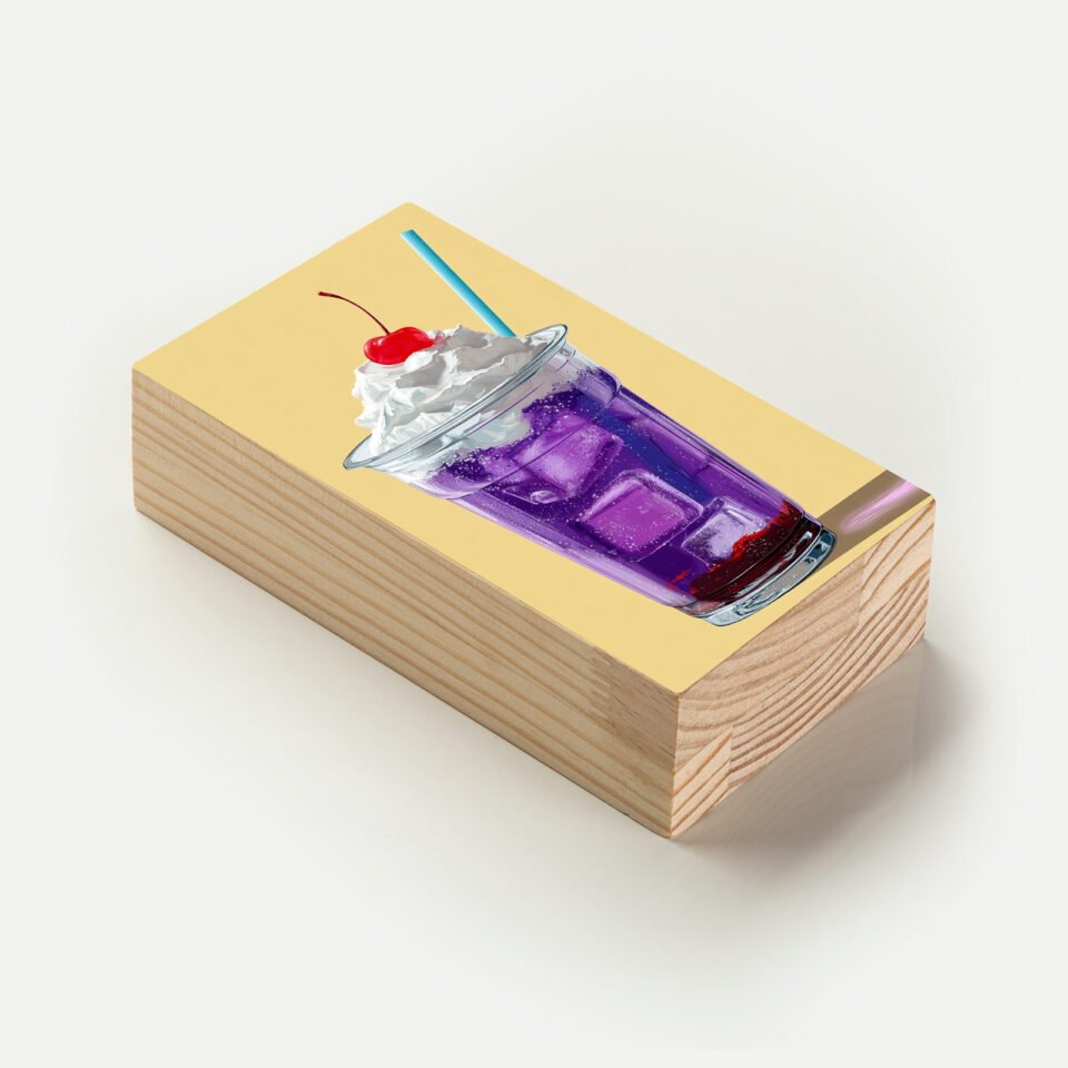 Totem em madeira com imagem vibrante de pigmentos em explosão. Ideal para ambientes criativos ou como presente cheio de expressividade.