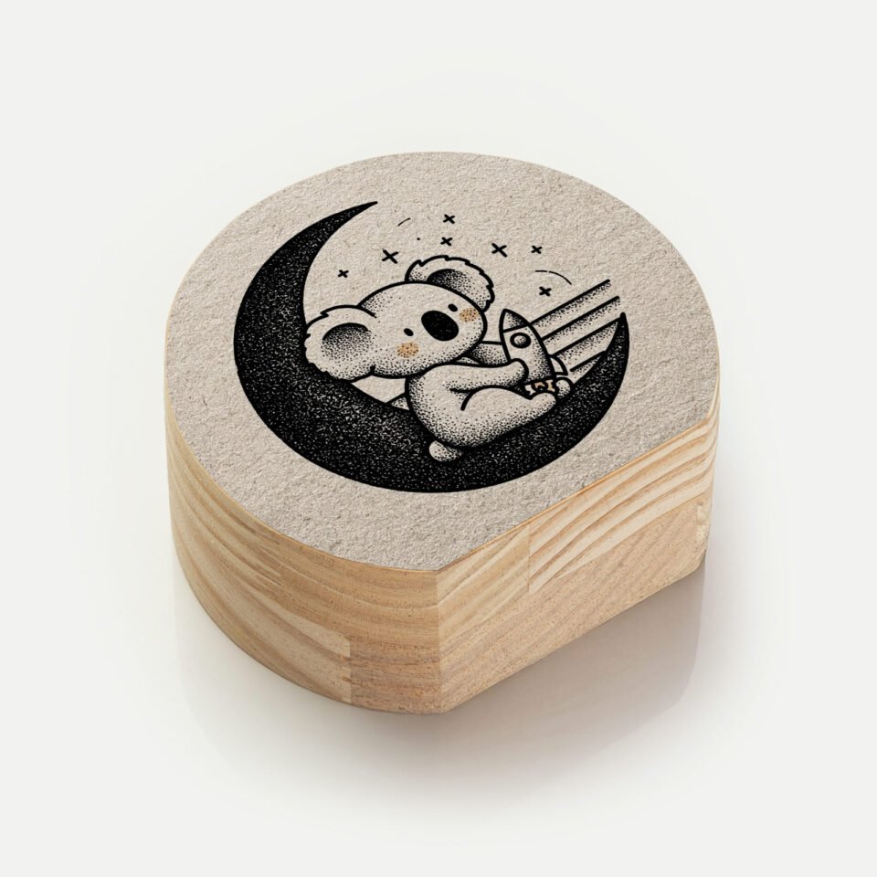 Totem de madeira com arte vibrante de foguete decolando rumo ao espaço, ideal para decorações modernas, criativas e inspiradoras.