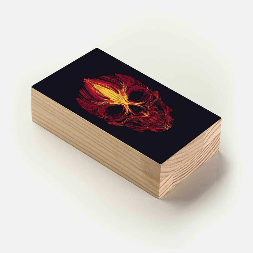 Um totem que transforma o símbolo da morte em força viva, onde o fogo representa a alma eterna em combustão criativa.