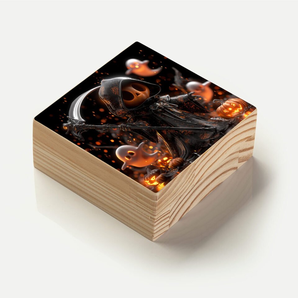 Entre abóboras e fantasmas brilhantes, a caveirinha sombria transforma o mistério do Halloween em uma cena divertida e encantadora.