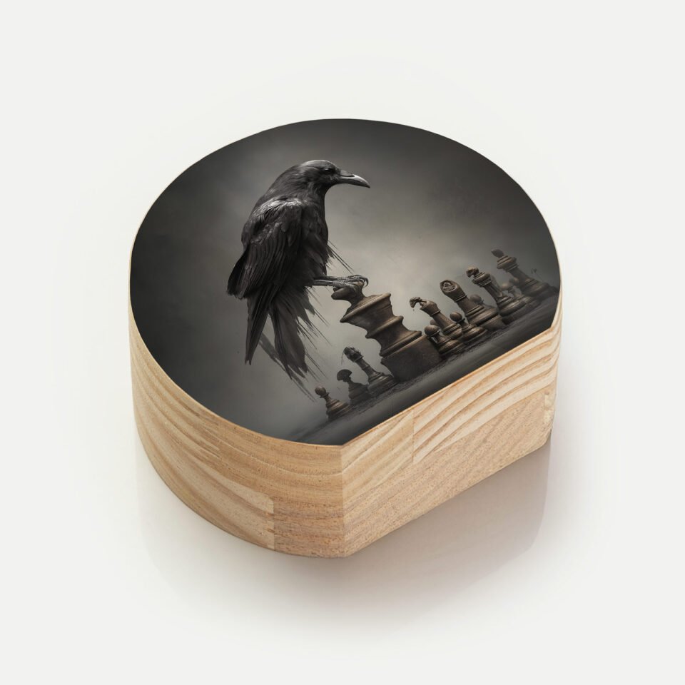 Um corvo imponente repousa sobre peças de xadrez, simbolizando estratégia, mistério e o poder silencioso das decisões.