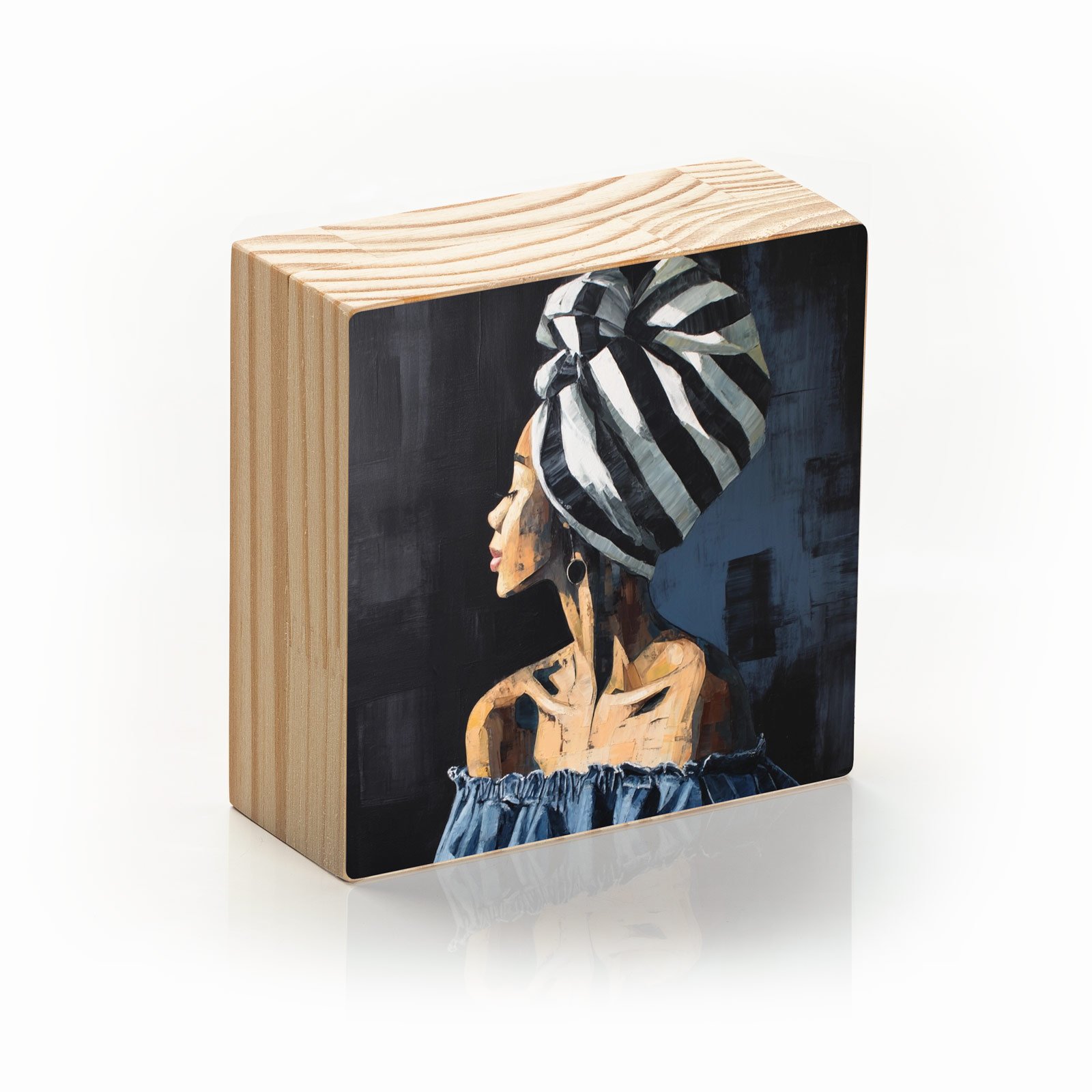 Com um turbante listrado que emoldura a cabeça erguida, a figura retratada em “Altivez Serena” da Linha Square, exala força, elegância e dignidade. Seu olhar suave revela introspecção, enquanto sua postura transmite orgulho silencioso. Uma obra que celebra a beleza da identidade com expressão contemporânea e ancestral.