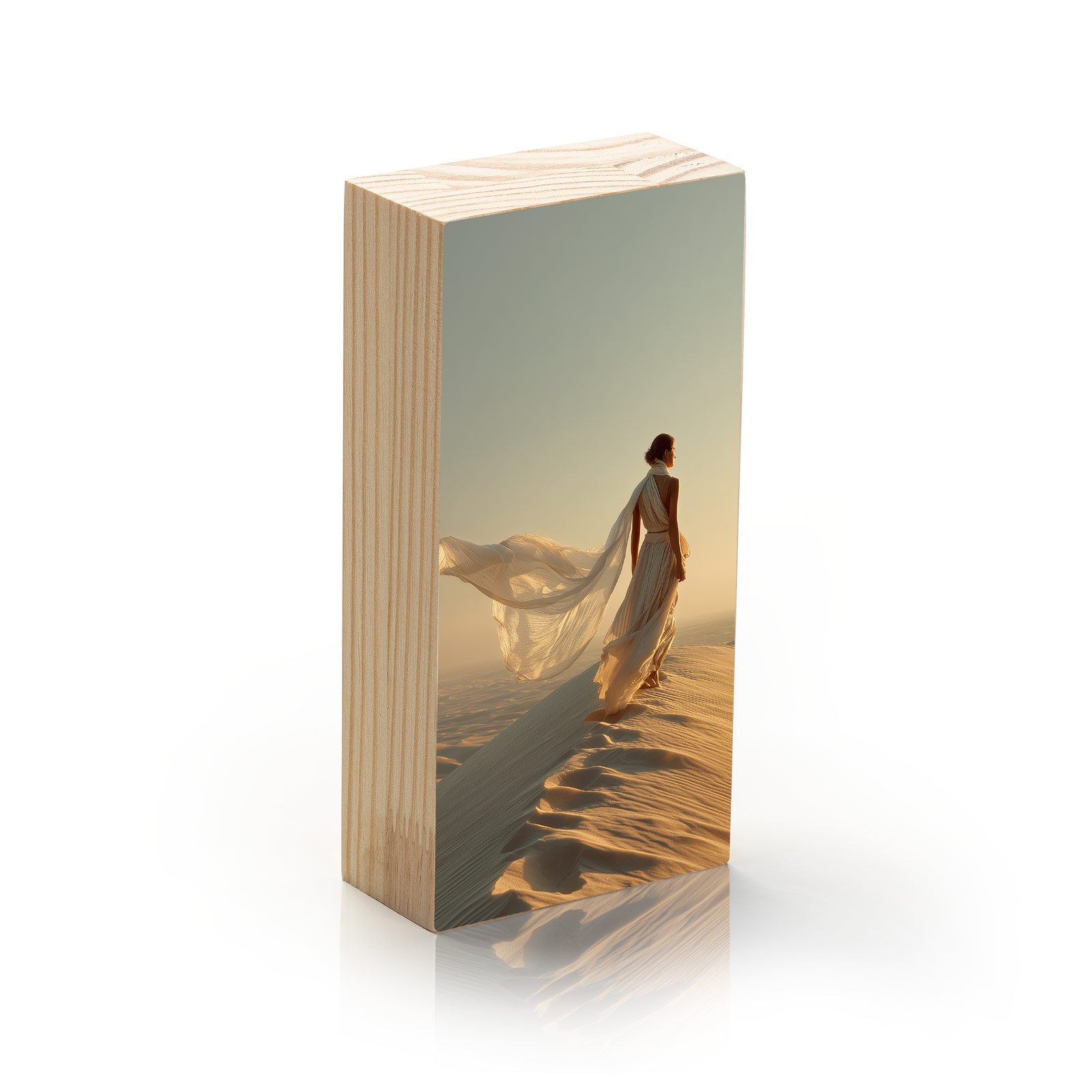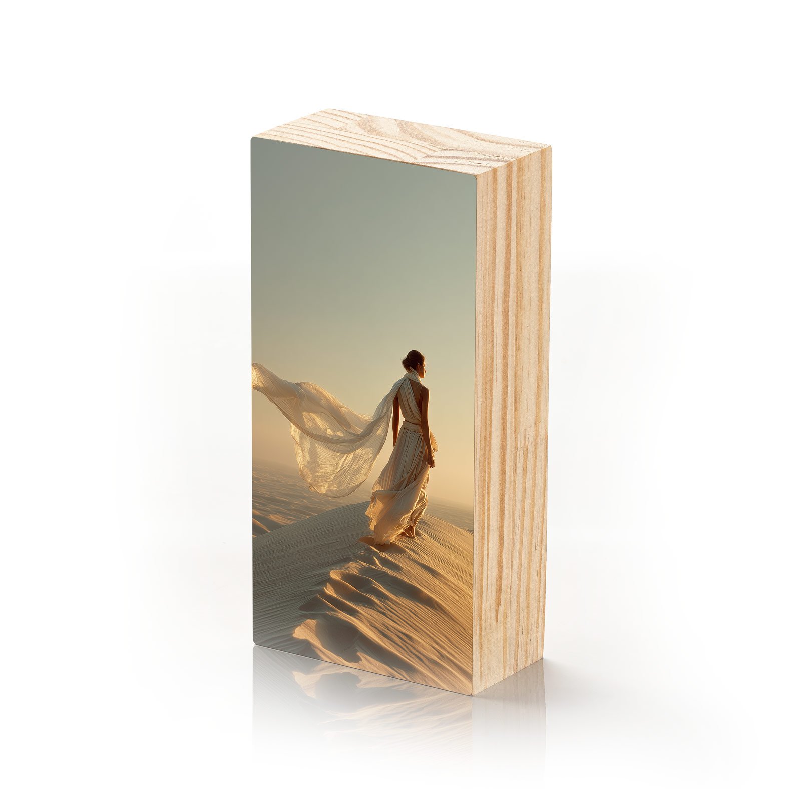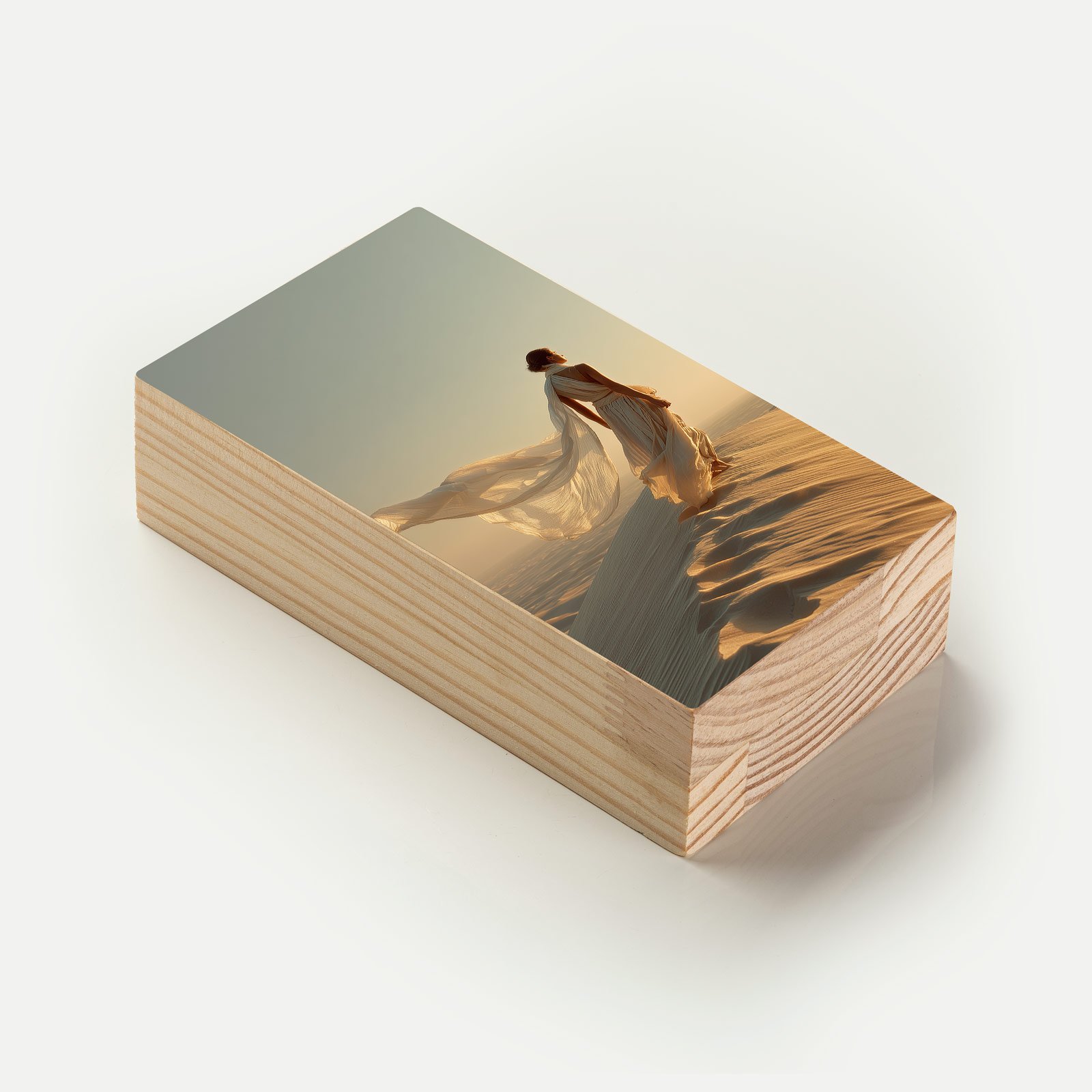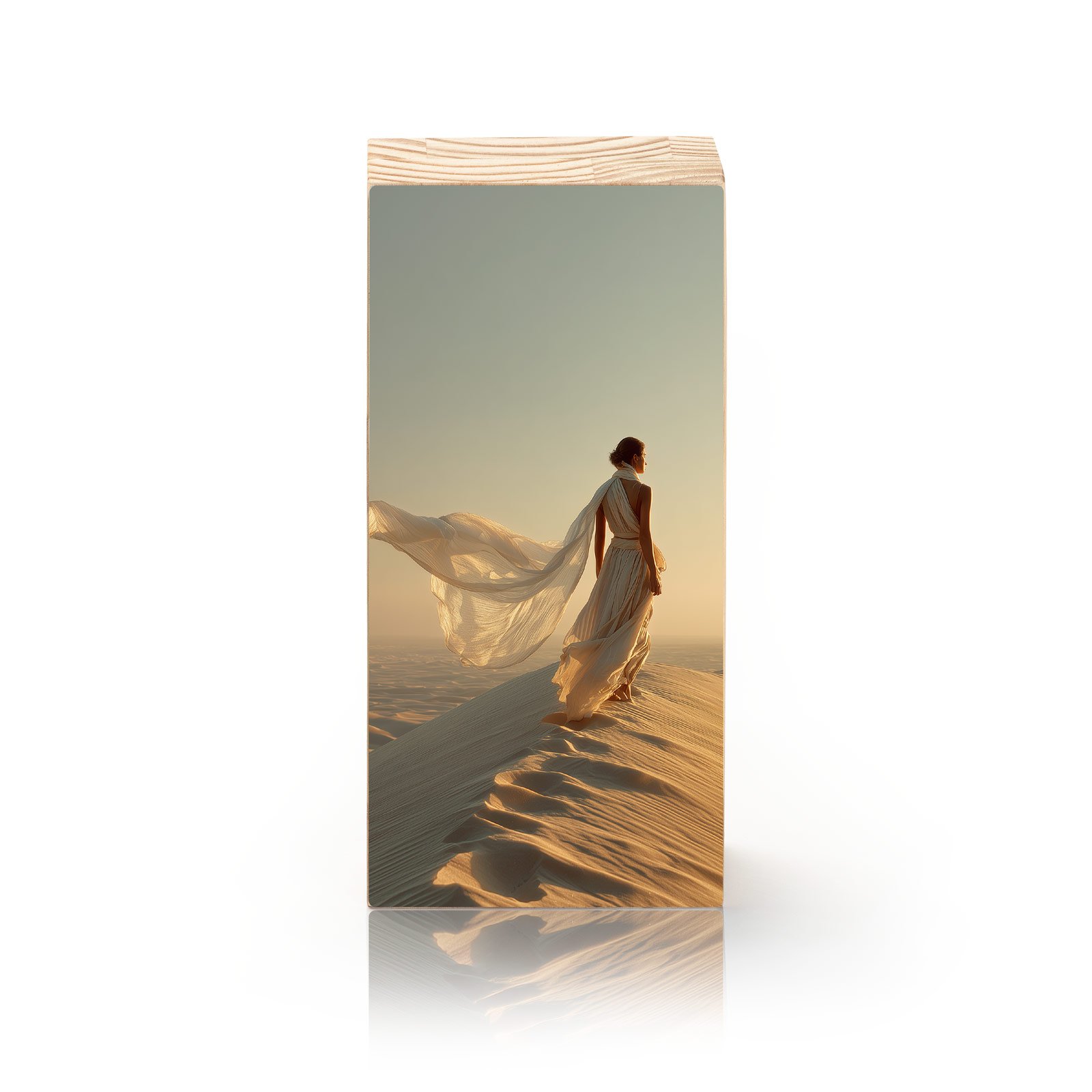 No silêncio dourado das dunas, “Areia Eterna” retrata a figura feminina em harmonia com o vento e a imensidão do deserto. O vestido esvoaçante se mistura à luz do sol, criando uma cena de liberdade, força e contemplação. Uma peça que transmite elegância e intensidade, transformando o espaço em poesia visual.