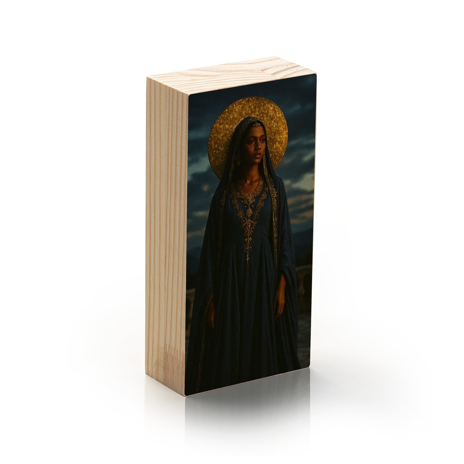 Sob um céu crepuscular e envolta em vestes azul profundo, ela se ergue com majestade serena. “Aurea Nocturna” da Linha Vert, é um ícone de força silenciosa e espiritualidade ancestral, com um halo dourado que evoca luz interior, divindade e reverência ao sagrado feminino.