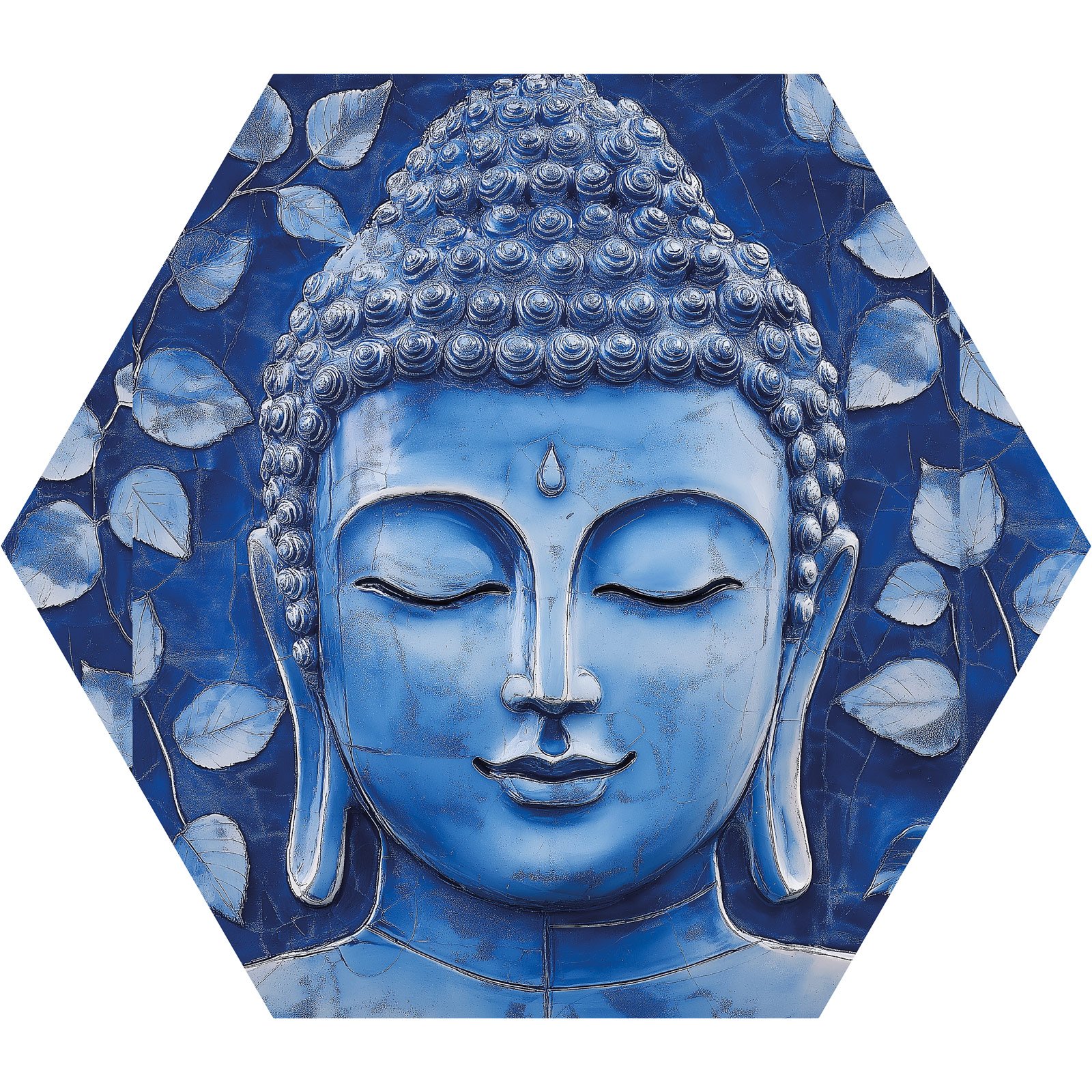 A imagem central apresenta o rosto sereno do Buda em um azul profundo, rodeado por folhas em tons prateados que remetem ao despertar e à leveza. A textura visual da obra transmite calma e introspecção, tornando-a ideal para quem busca transformar o lar em um espaço de contemplação, beleza e equilíbrio.