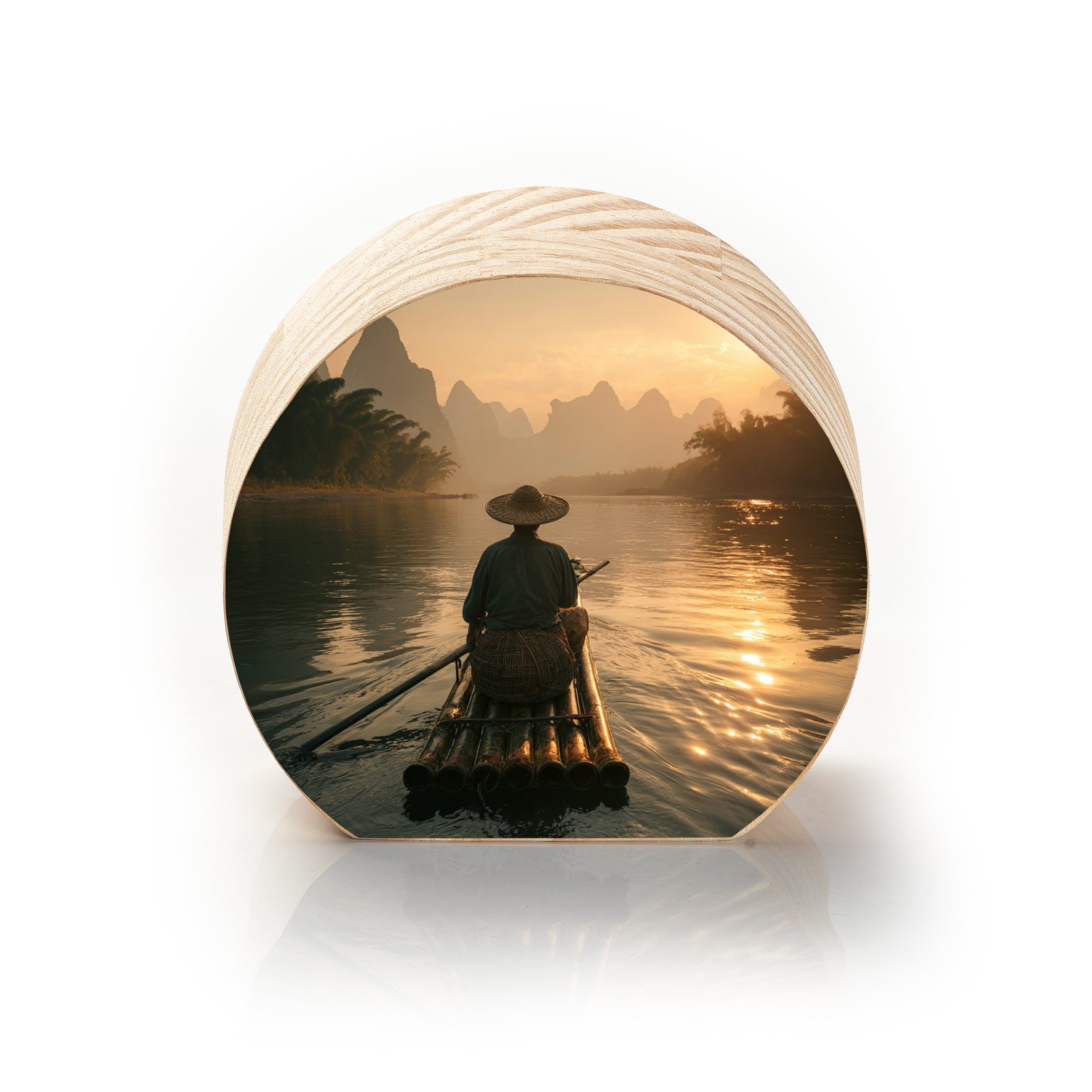Entre reflexos dourados e montanhas distantes, “Caminho das Águas” captura a serenidade de um barqueiro que, em sua simplicidade, conduz não apenas a jangada, mas também histórias, silêncios e tradições que atravessam gerações. A cena traduz o equilíbrio entre homem e natureza, revelando que cada remada é também um ato de contemplação e sabedoria.