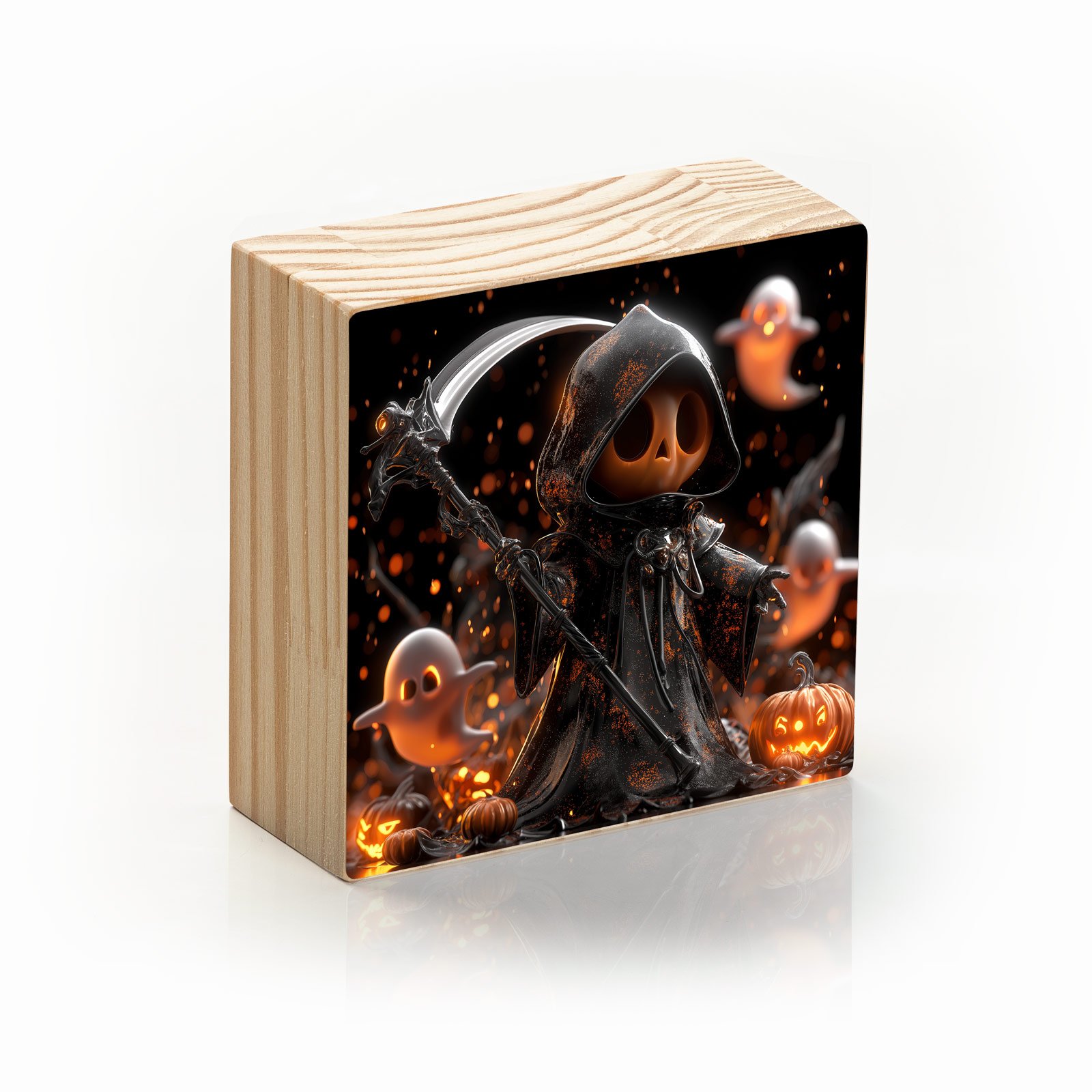 Entre abóboras iluminadas e pequenos fantasmas brincalhões, “Ceifador Encantado” traz um olhar lúdico e mágico sobre o universo do Halloween. A figura sombria, em sua capa escura e foice reluzente, mistura mistério e fofura, transformando o símbolo da noite das bruxas em um personagem encantador. Uma obra que equilibra o clima enigmático com a leveza de um conto visual cheio de fantasia.