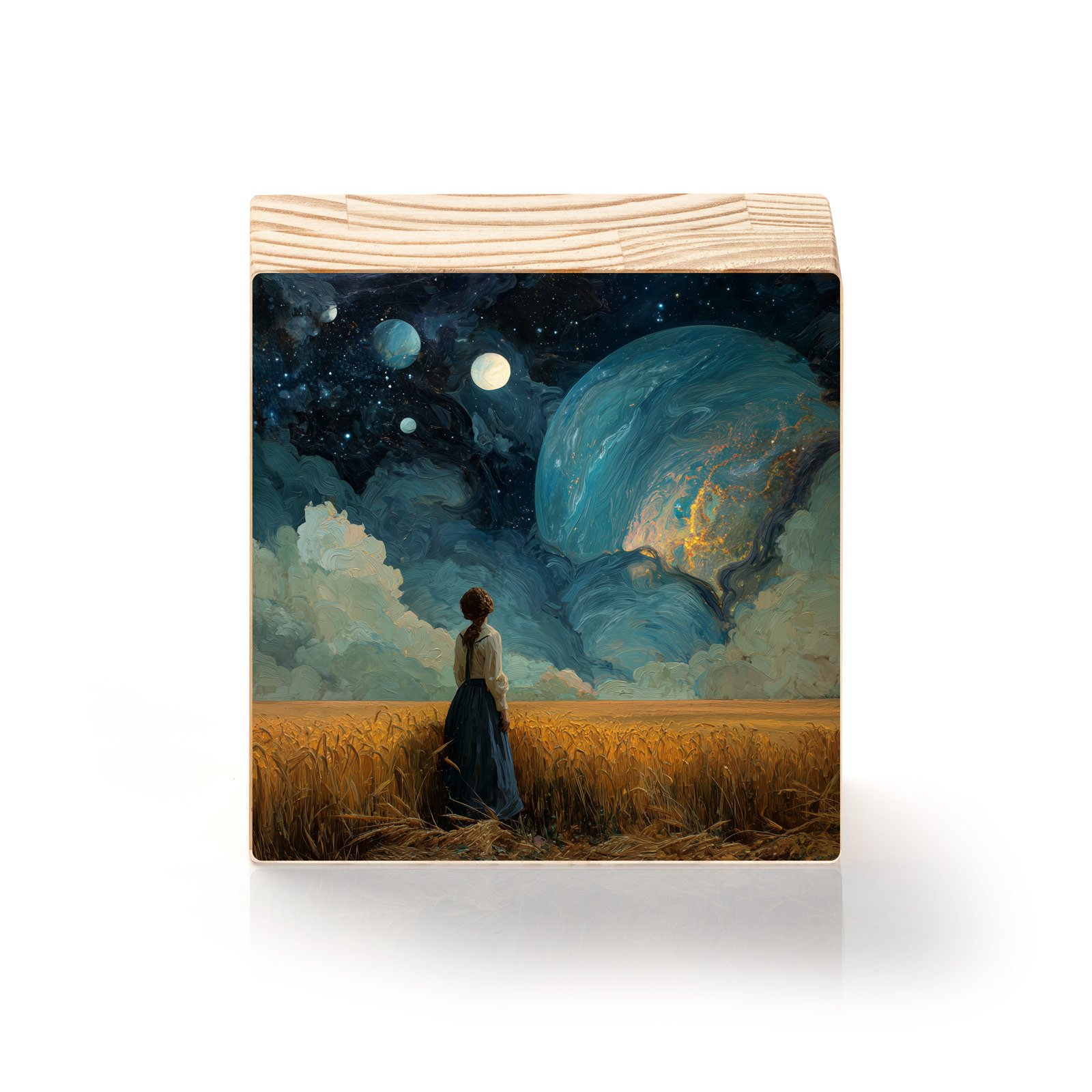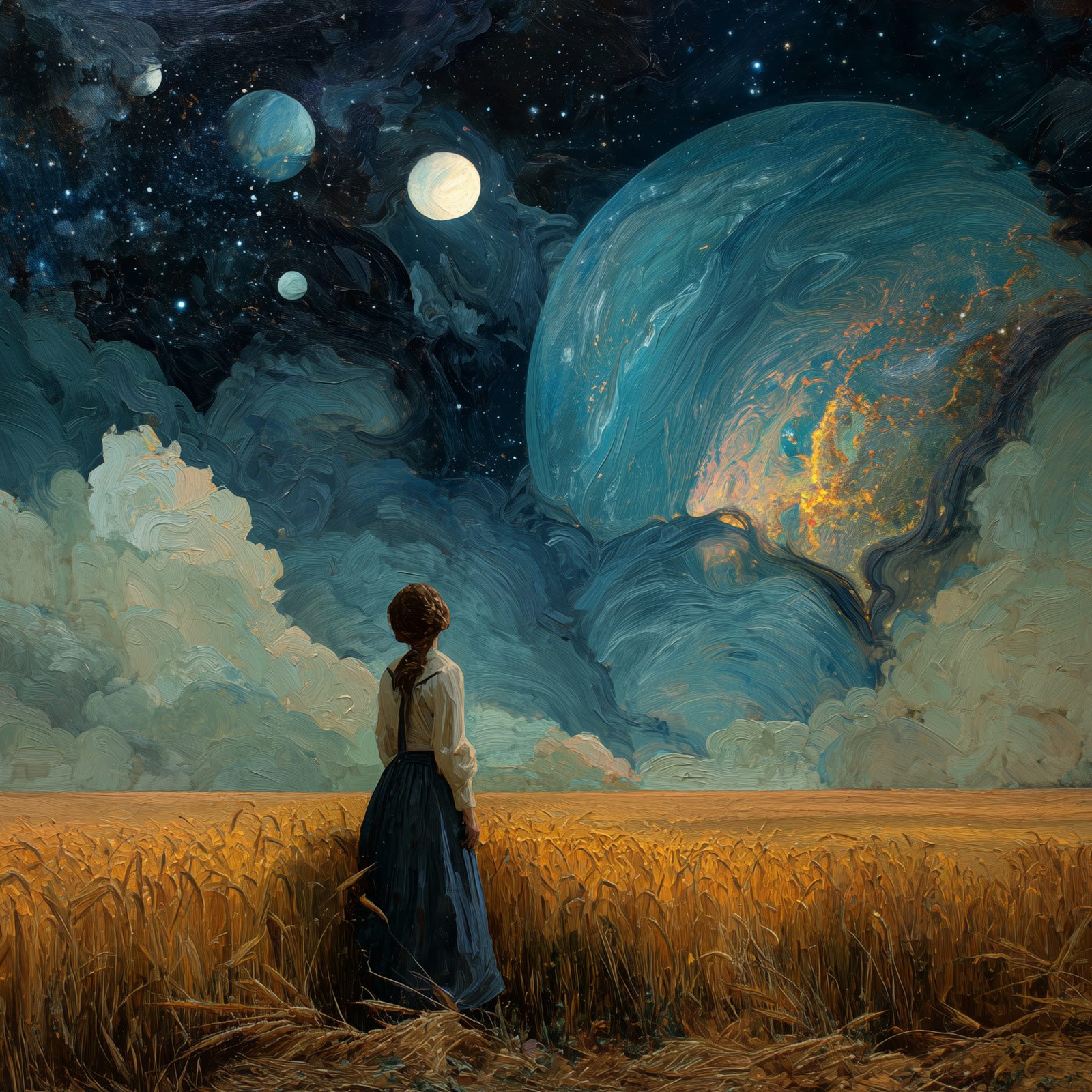Entre campos dourados e céus infinitos, “Céu de Dois Sóis” revela a figura serena de uma mulher que contempla um universo expandido diante de seus olhos: planetas imensos, luas múltiplas e nuvens etéreas que se misturam ao espaço. A cena une a simplicidade terrena à imensidão do desconhecido, evocando sentimentos de fascínio, introspecção e esperança.