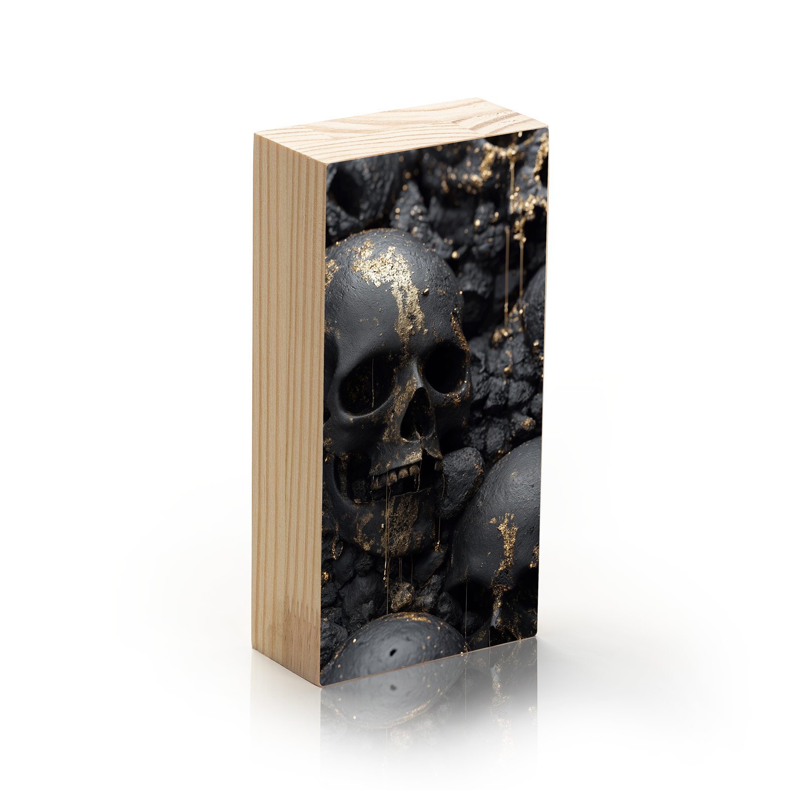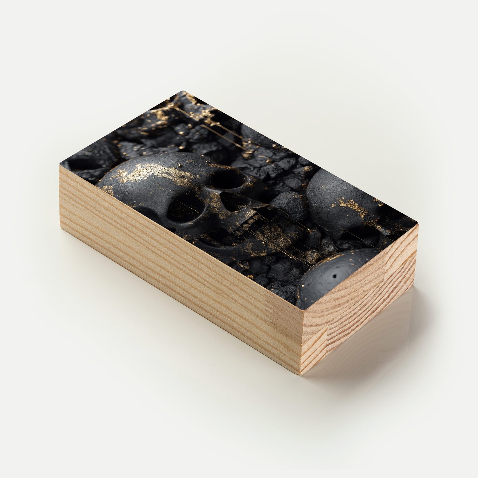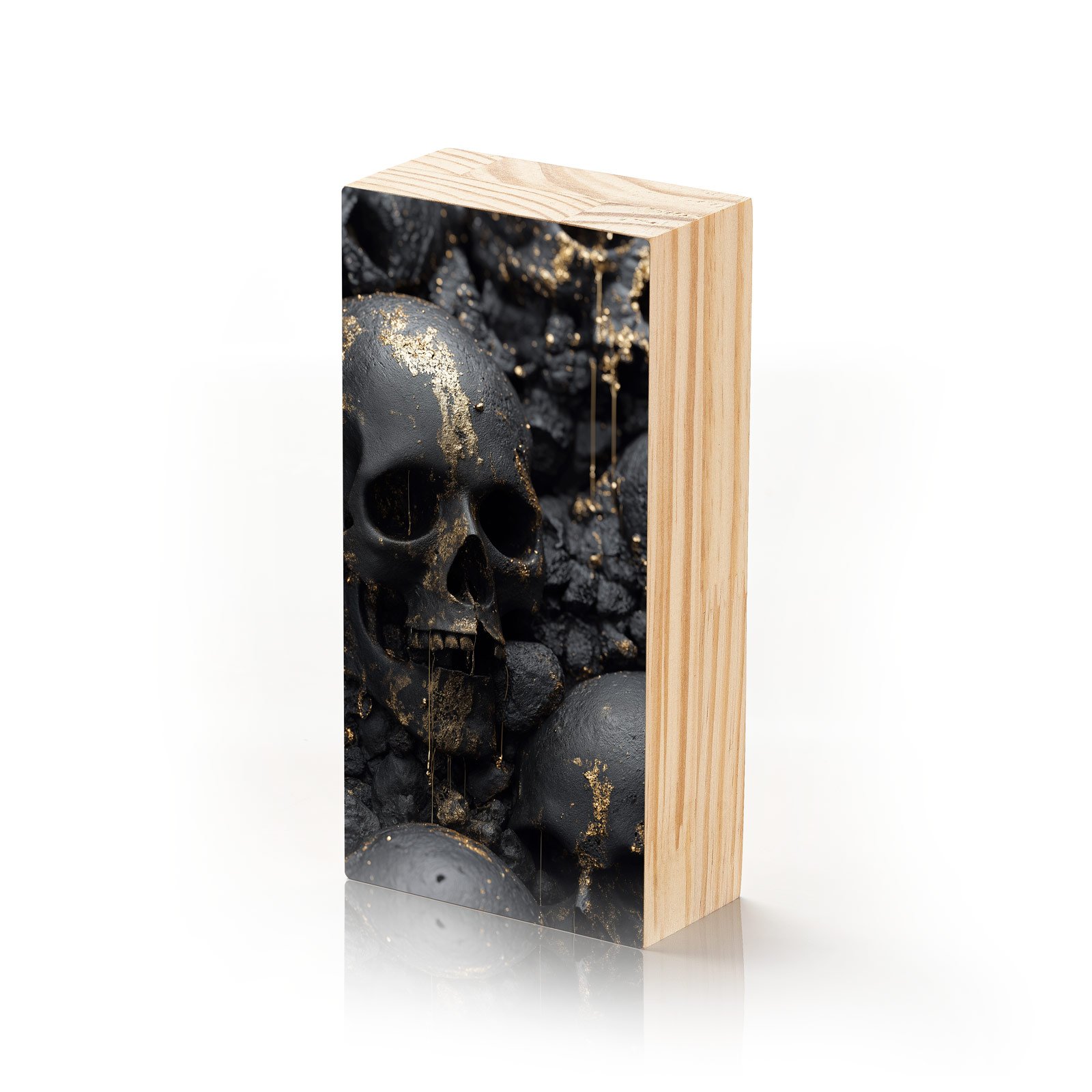 Do abismo à arte. O totem “Cinzas e Ouro” da Linha Vert, resgata a beleza do sombrio, unindo caveiras negras ao brilho do dourado bruto como um manifesto visual da finitude e do valor que emerge da destruição. Uma peça que confronta, questiona e exalta a eternidade da presença.
