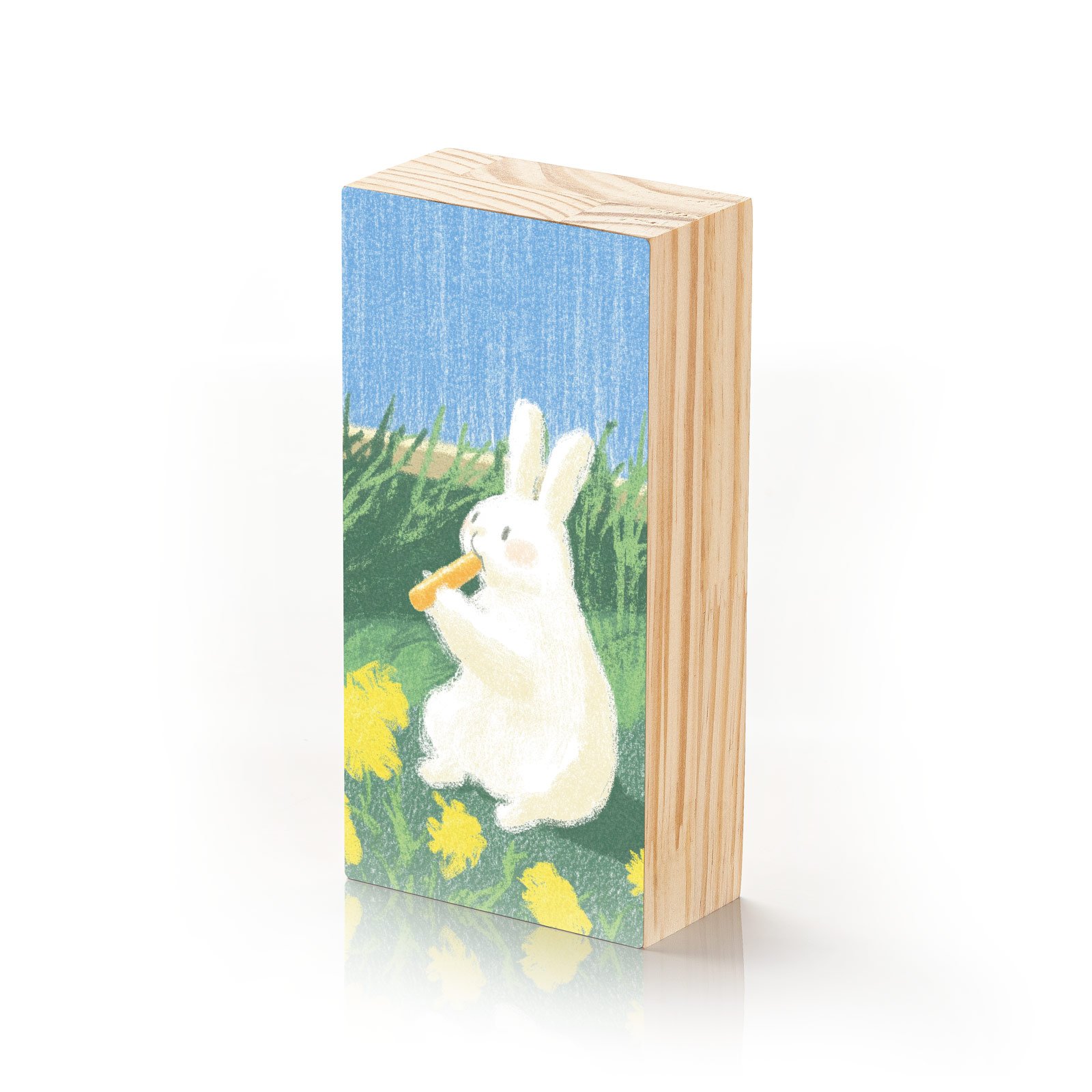 A ilustração apresenta um coelho branco sentado sobre a grama, saboreando uma cenoura em meio a um campo de flores amarelas sob um céu azul radiante. Os traços lembram giz de cera ou lápis de cor, criando um efeito infantil e artístico ao mesmo tempo. A combinação entre os tons vibrantes e o personagem singelo forma uma cena harmoniosa que remete à infância, à liberdade e ao contato com a natureza. É como uma página de livro ilustrado transformada em arte decorativa.