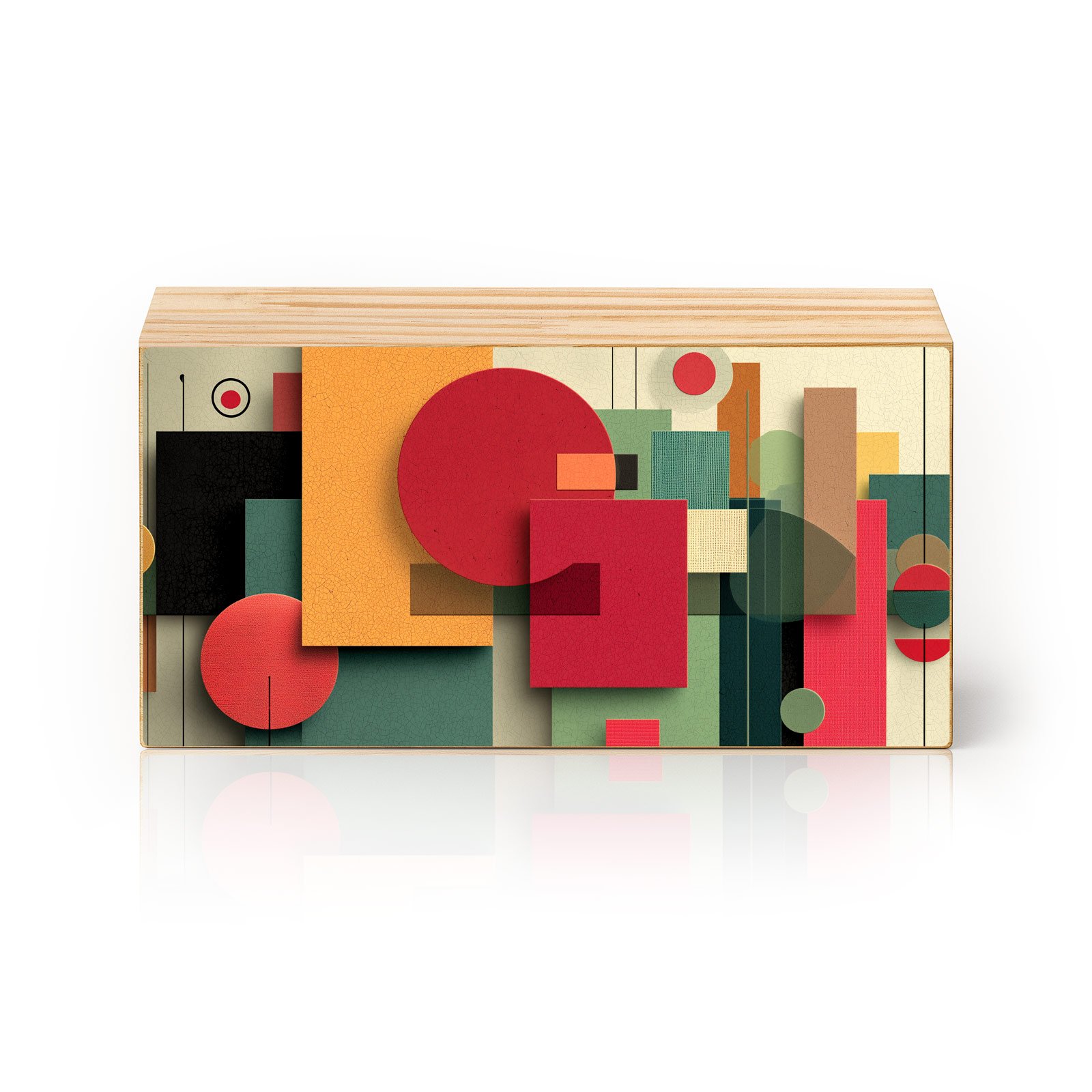“Cores em Ordem” da Linha Horizon, é uma celebração do equilíbrio através do contraste. Quadrados, círculos e retângulos se alinham em camadas visuais que lembram um jogo de construção moderno. Cada forma parece ocupar seu lugar com intenção como se a arte sussurrasse que existe beleza na organização do caos.