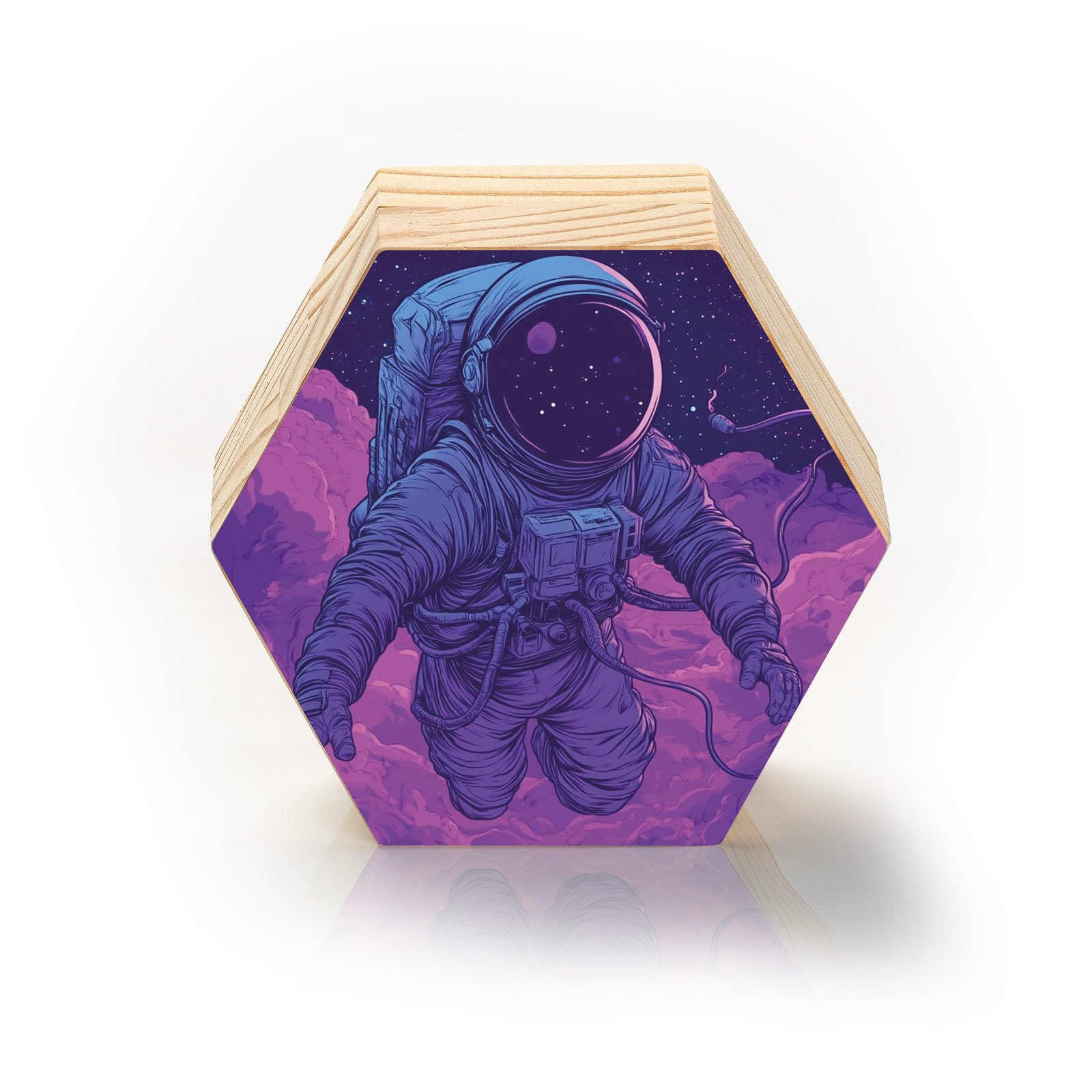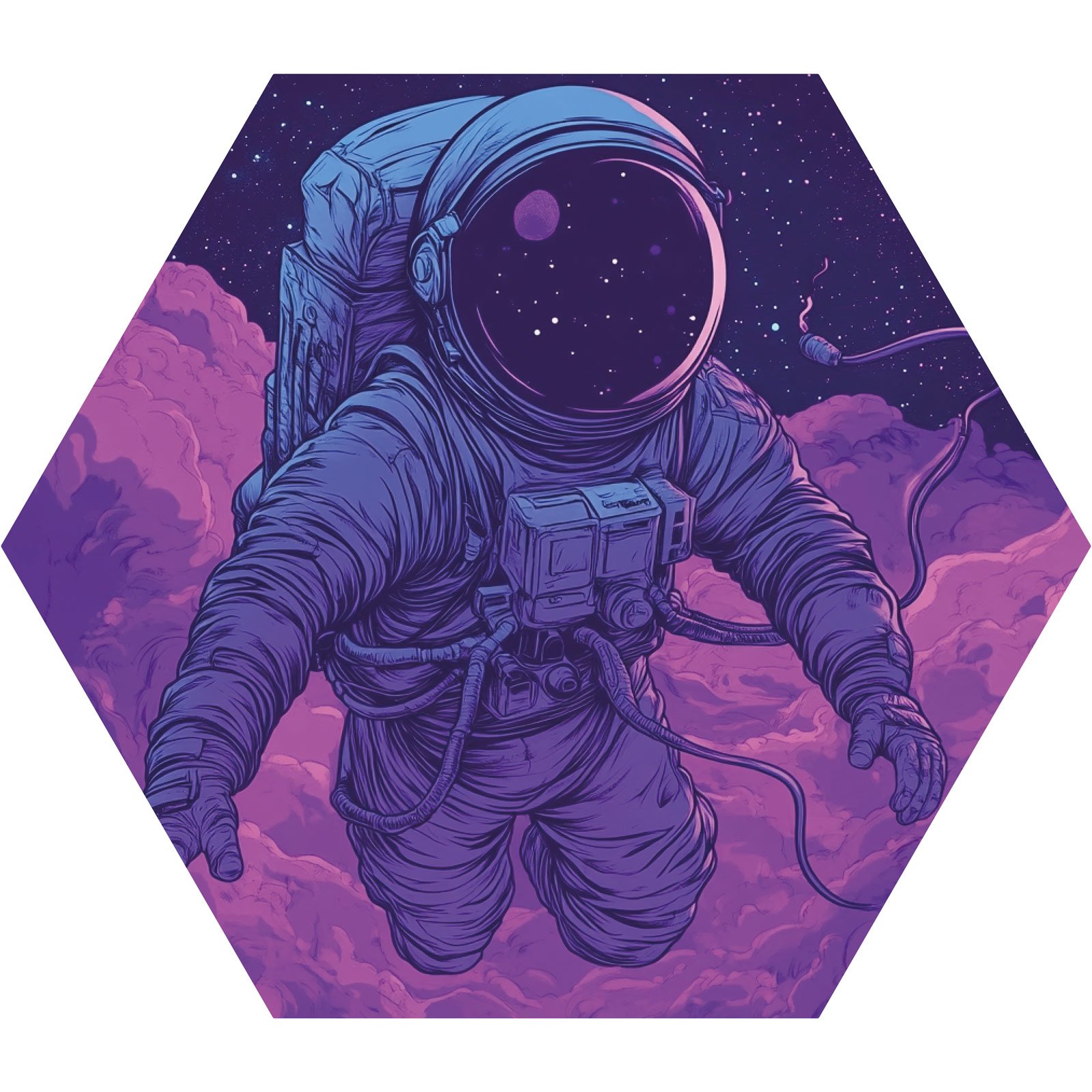 Deixe sua decoração alcançar o infinito com o Totem Decorativo ‘Cosmo Flutuante’ da linha Hezag. Esta peça traz a imagem de um astronauta em meio ao universo estrelado, flutuando sobre nuvens em tons roxos e lilás, evocando uma sensação de liberdade, contemplação e vastidão.