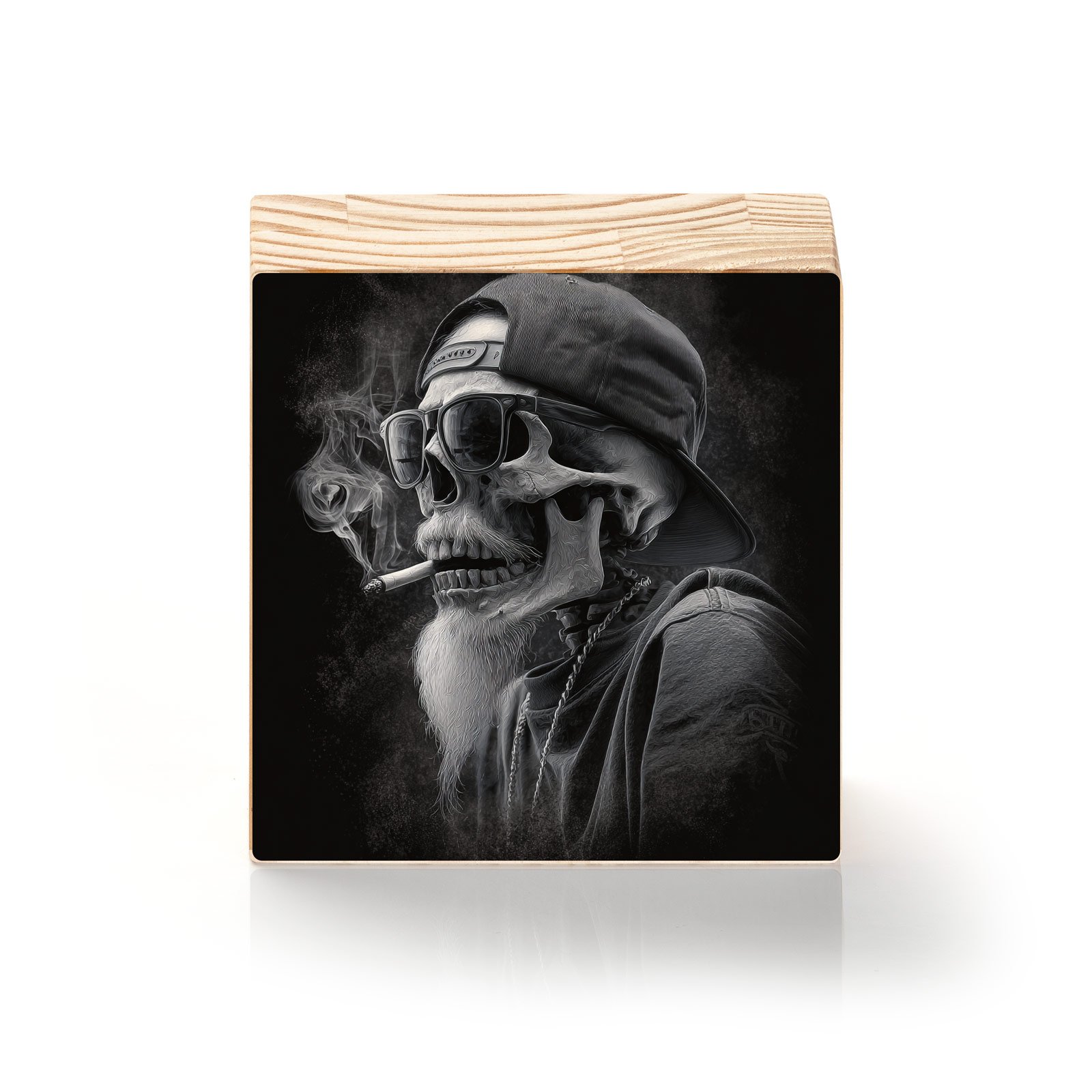 Entre traços sombrios e um estilo carregado de irreverência, “Crânio Urbano” é uma obra que mistura o místico e o moderno. A figura do esqueleto humanizado, com óculos escuros e boné para trás, transmite a ideia de rebeldia atemporal, como se a essência da rua nunca morresse. O cigarro e a fumaça ao redor intensificam o clima underground, revelando uma presença marcante e imponente.