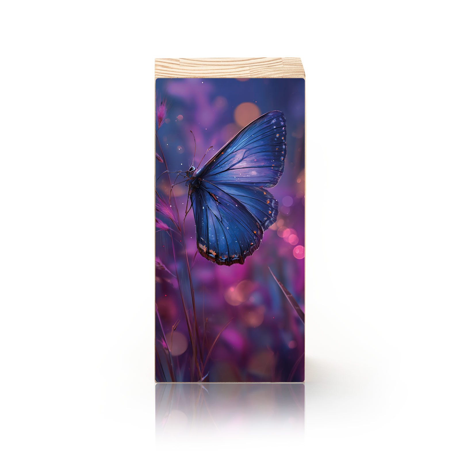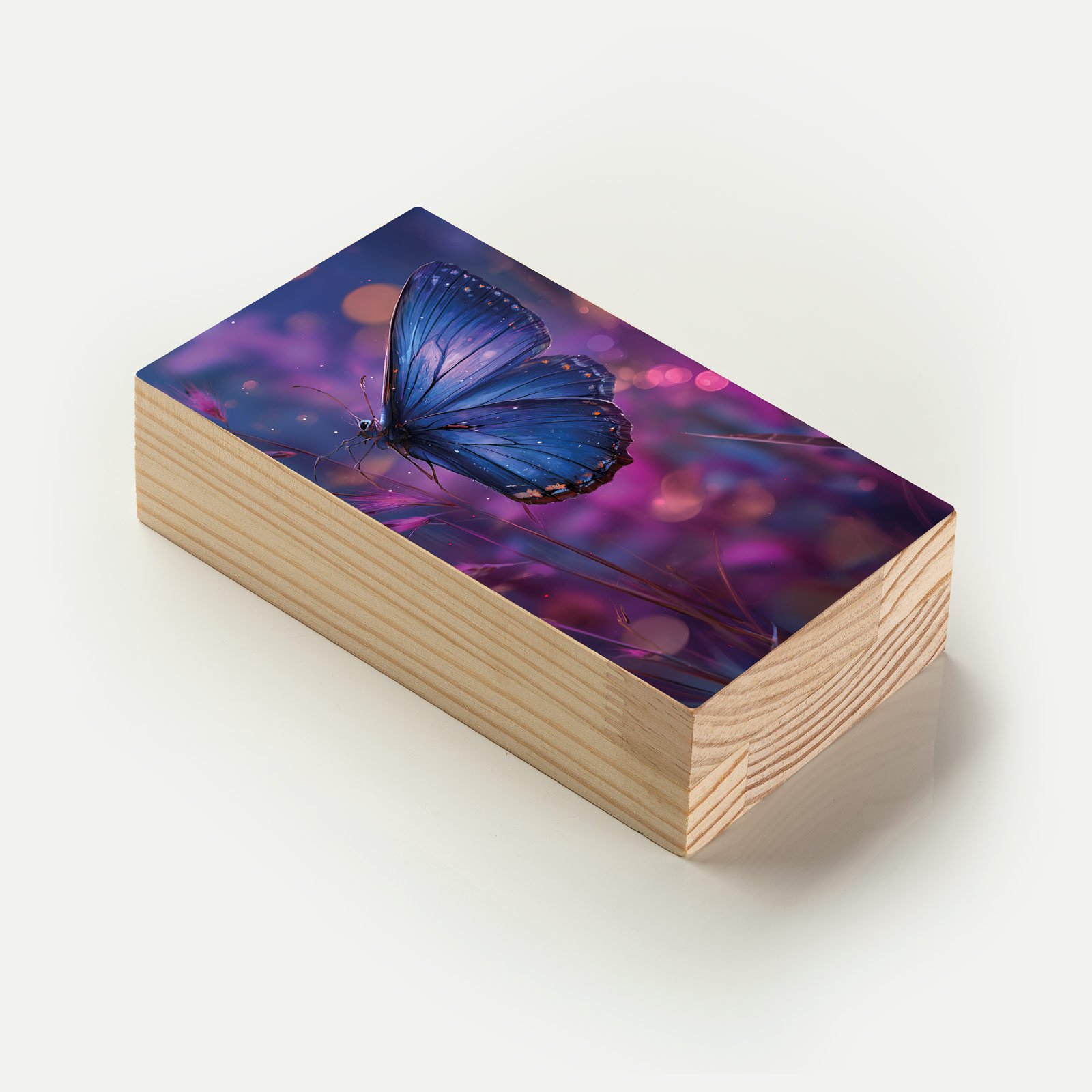 Com asas delicadas em tons de azul profundo, envoltas pelo brilho etéreo de um cenário violeta e rosado, “Ecos da Liberdade” transmite a sutileza do instante em que a natureza encontra a poesia. A borboleta, símbolo universal de transformação e esperança, repousa suavemente sobre o campo iluminado, evocando a beleza dos ciclos da vida e o poder dos recomeços.