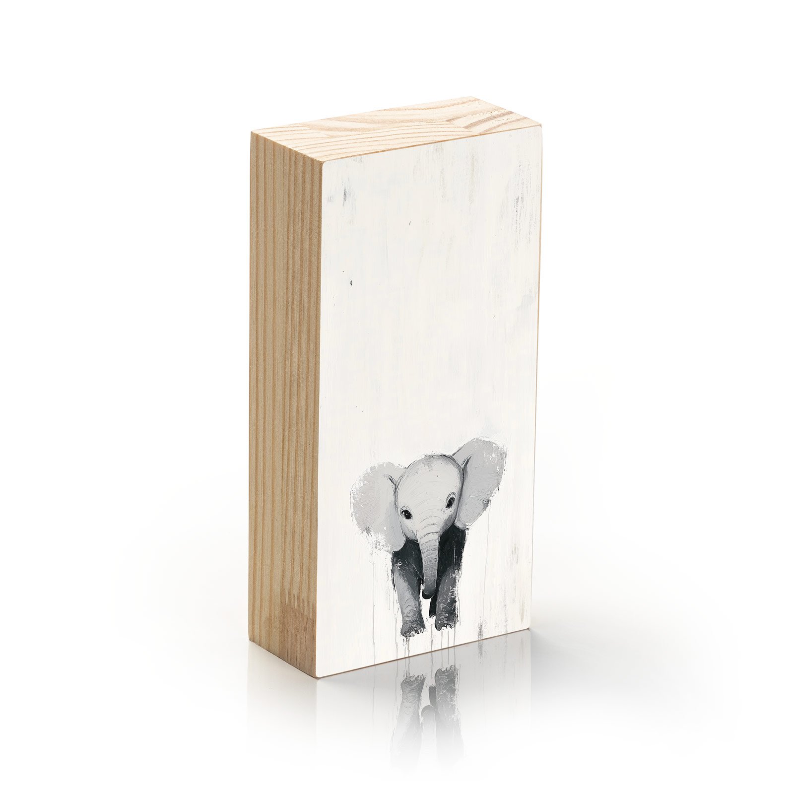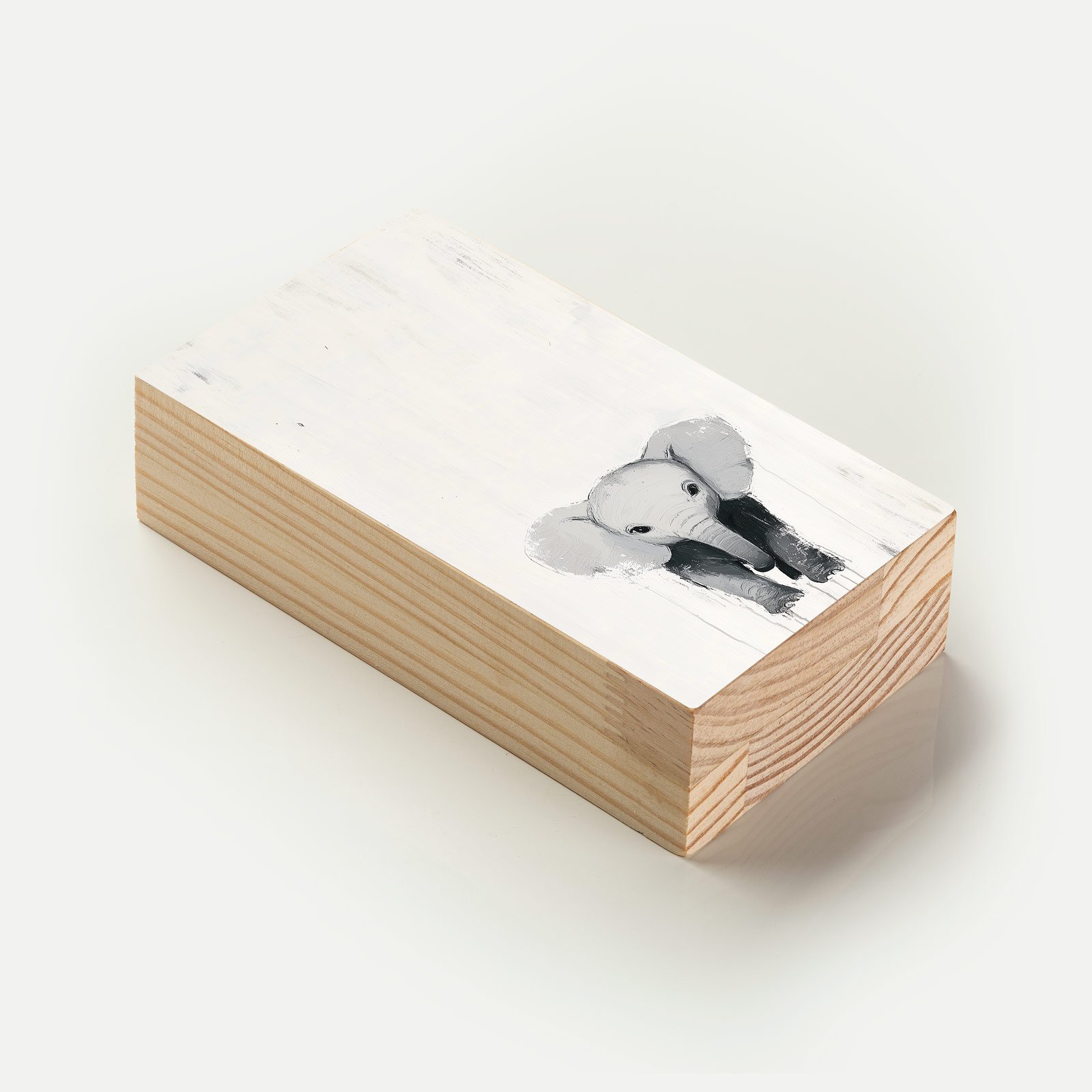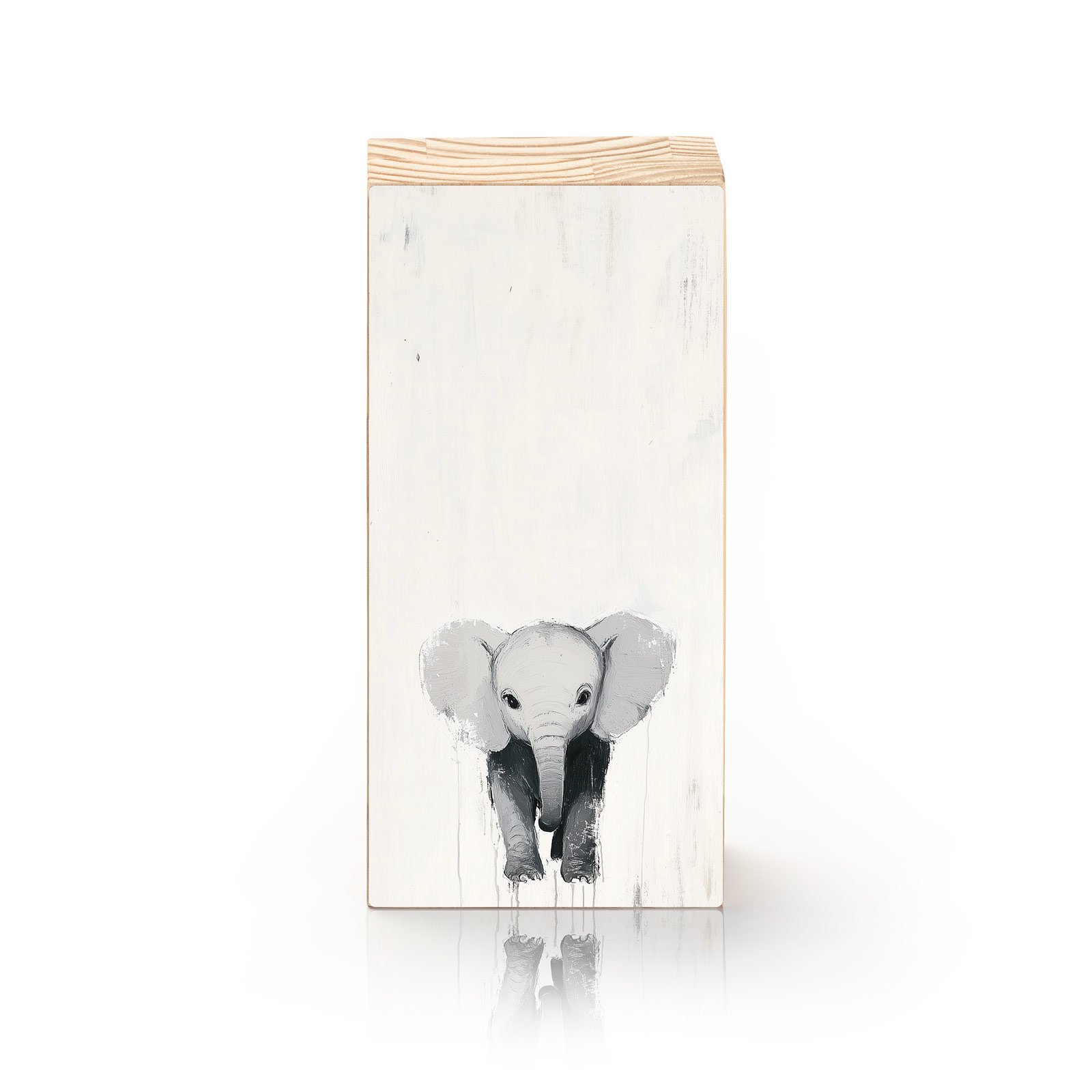 A arte apresenta um filhote de elefante em estilo aquarelado, centralizado na base da madeira, com pinceladas suaves e tons de cinza e branco. O fundo em textura clara dá a sensação de leveza e pureza, como uma tela em branco onde o elefantinho é a estrela. Os olhos grandes e expressivos, as orelhas abertas e a tromba alongada criam um visual adorável e convidativo. Há uma delicada sensação de movimento, como se o pequeno animal estivesse caminhando docemente até o observador.