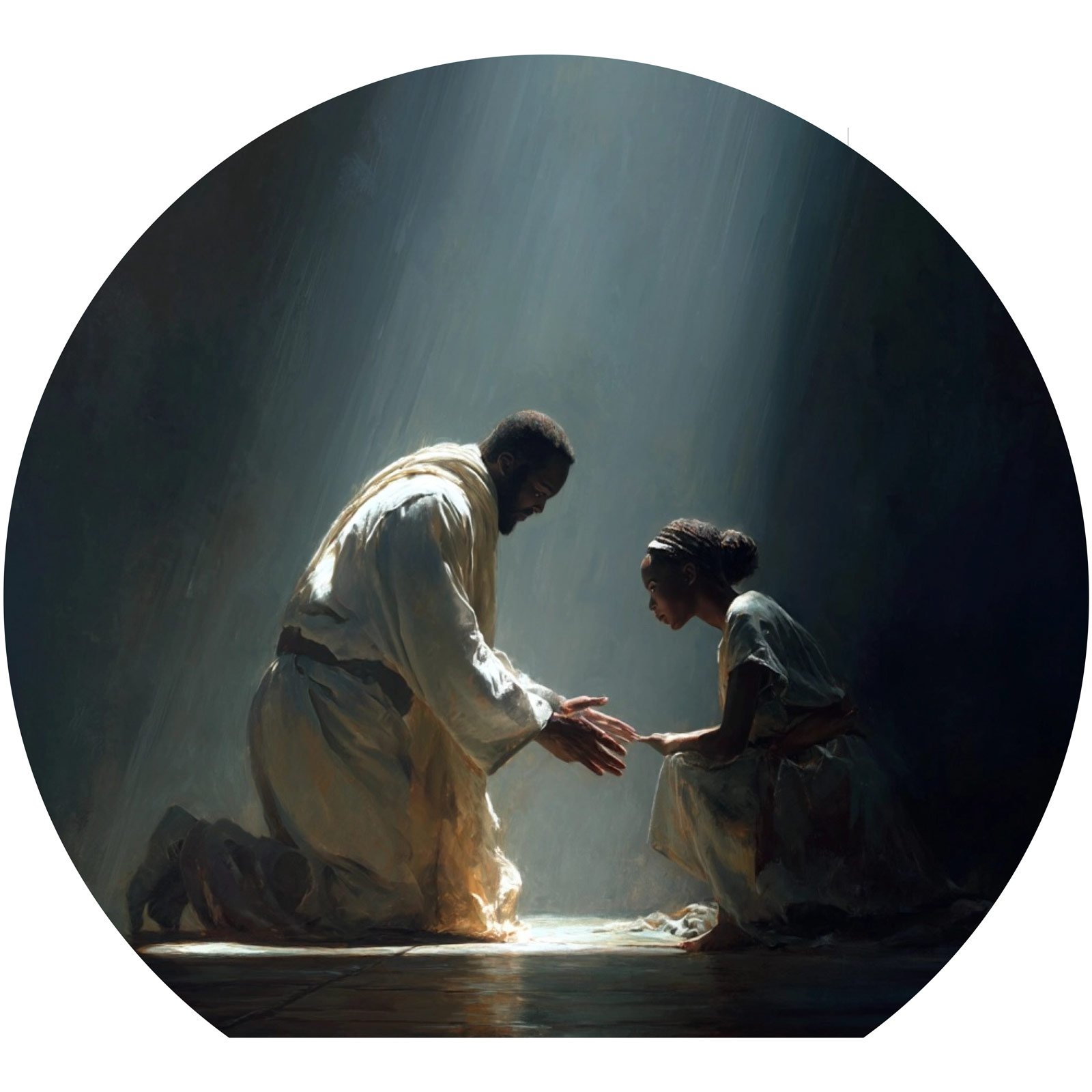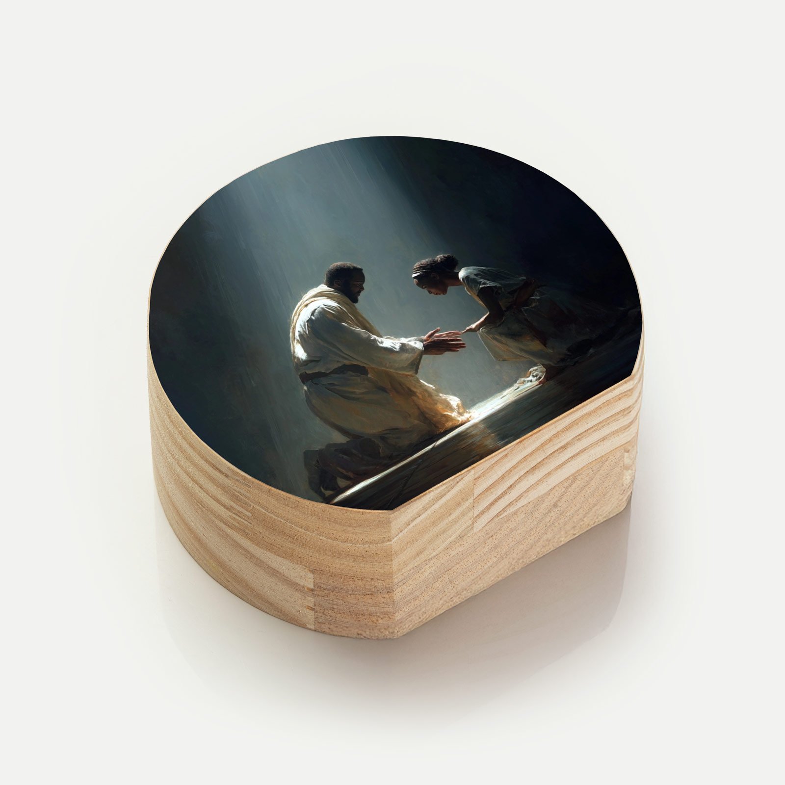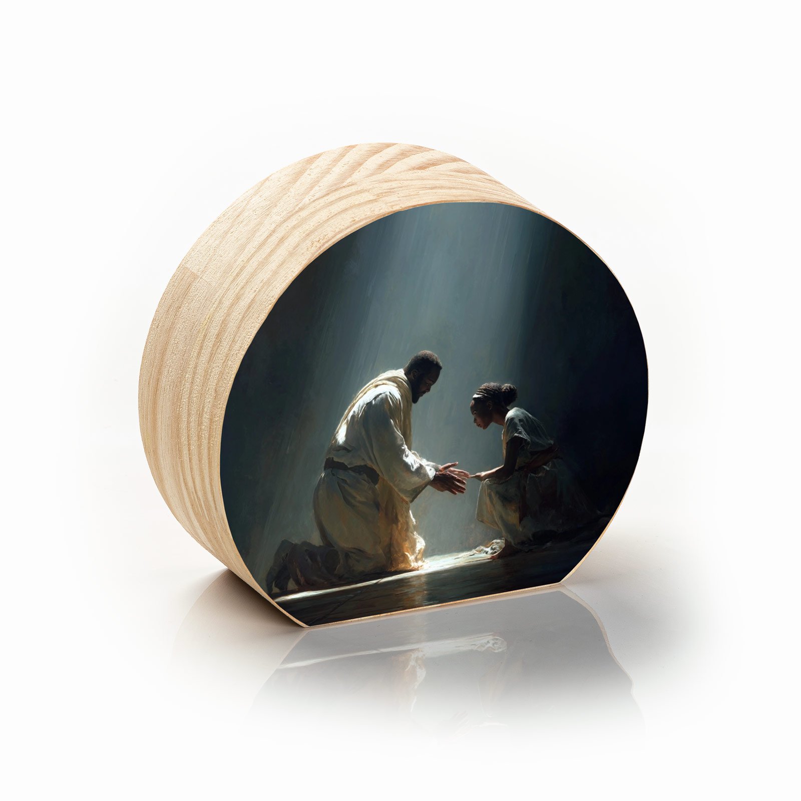 “Encontro de Luz” da Linha Luna, retrata um momento sagrado de conexão entre o divino e o humano. A imagem de Jesus ajoelhado frente a uma mulher, envoltos por um feixe de luz celestial, transmite acolhimento, perdão e amor incondicional. Um símbolo de entrega e fé profunda, envolto pela delicadeza da madeira no formato circular da linha Luna.