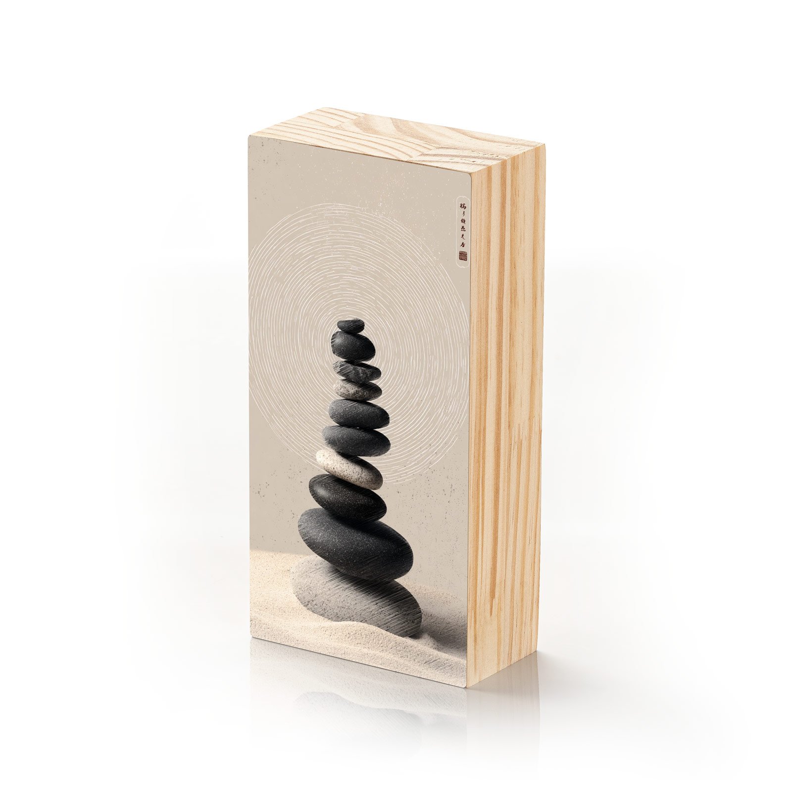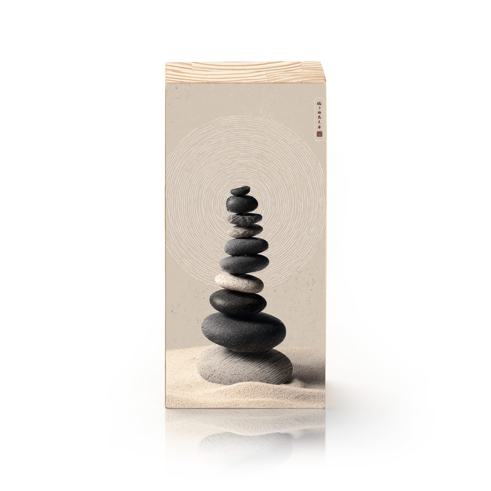 “Equilíbrio Essencial” da Linha Vert, é um tributo à harmonia natural. Cada pedra, empilhada com suavidade sobre a areia, simboliza um momento de presença plena. A obra traduz o silêncio do espírito em forma, peso e textura, revelando que o verdadeiro equilíbrio é interno.