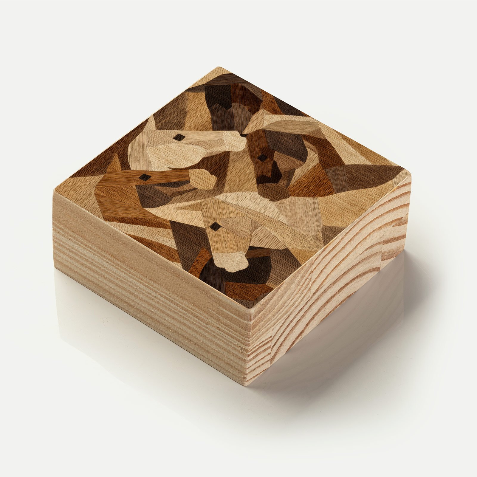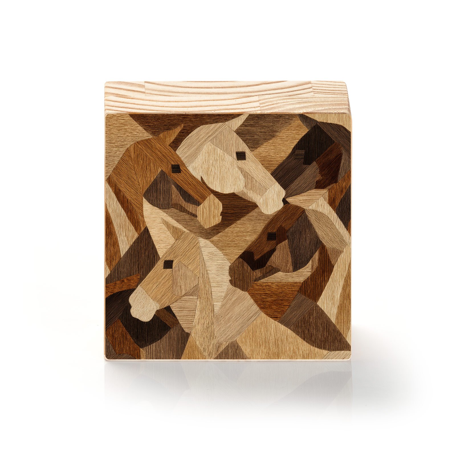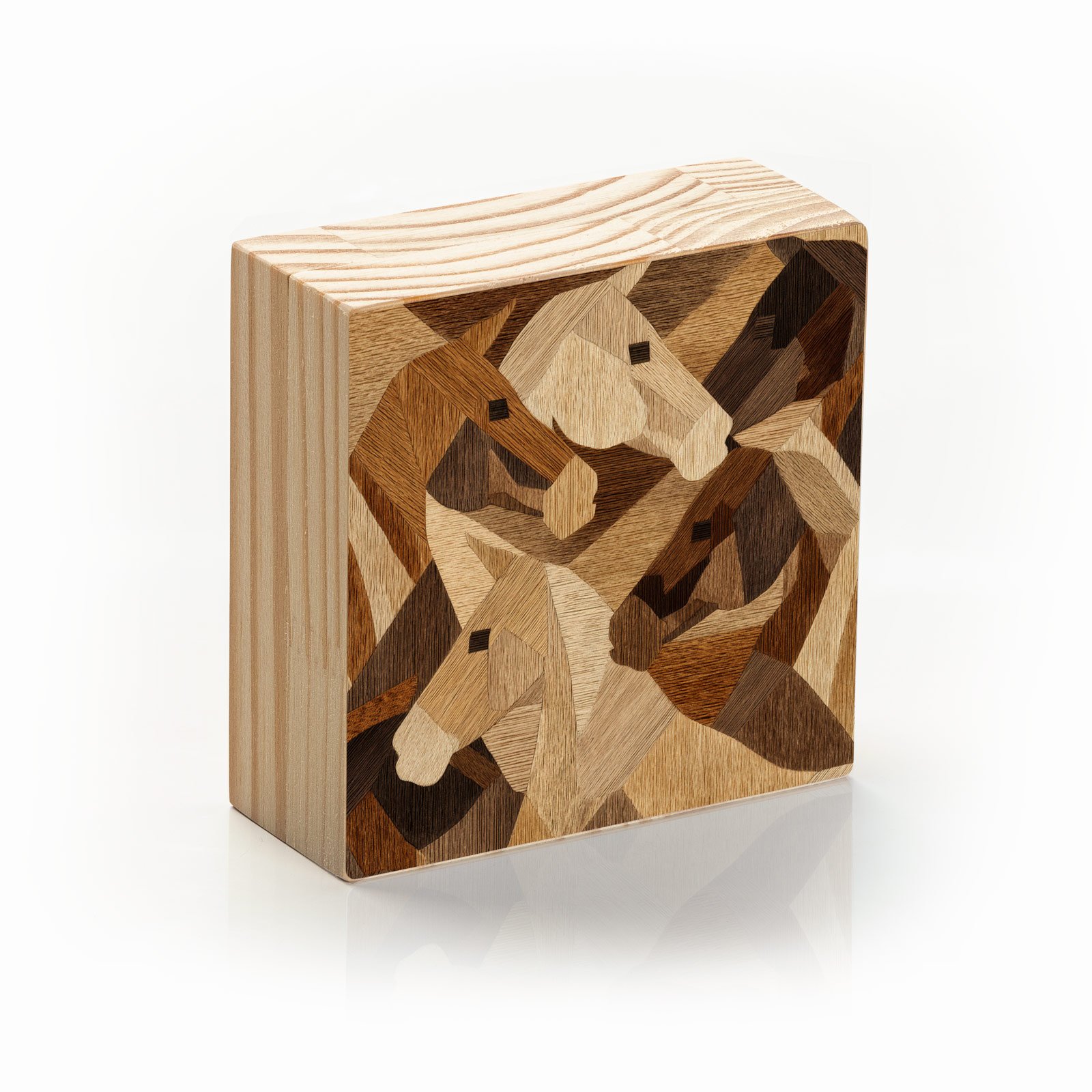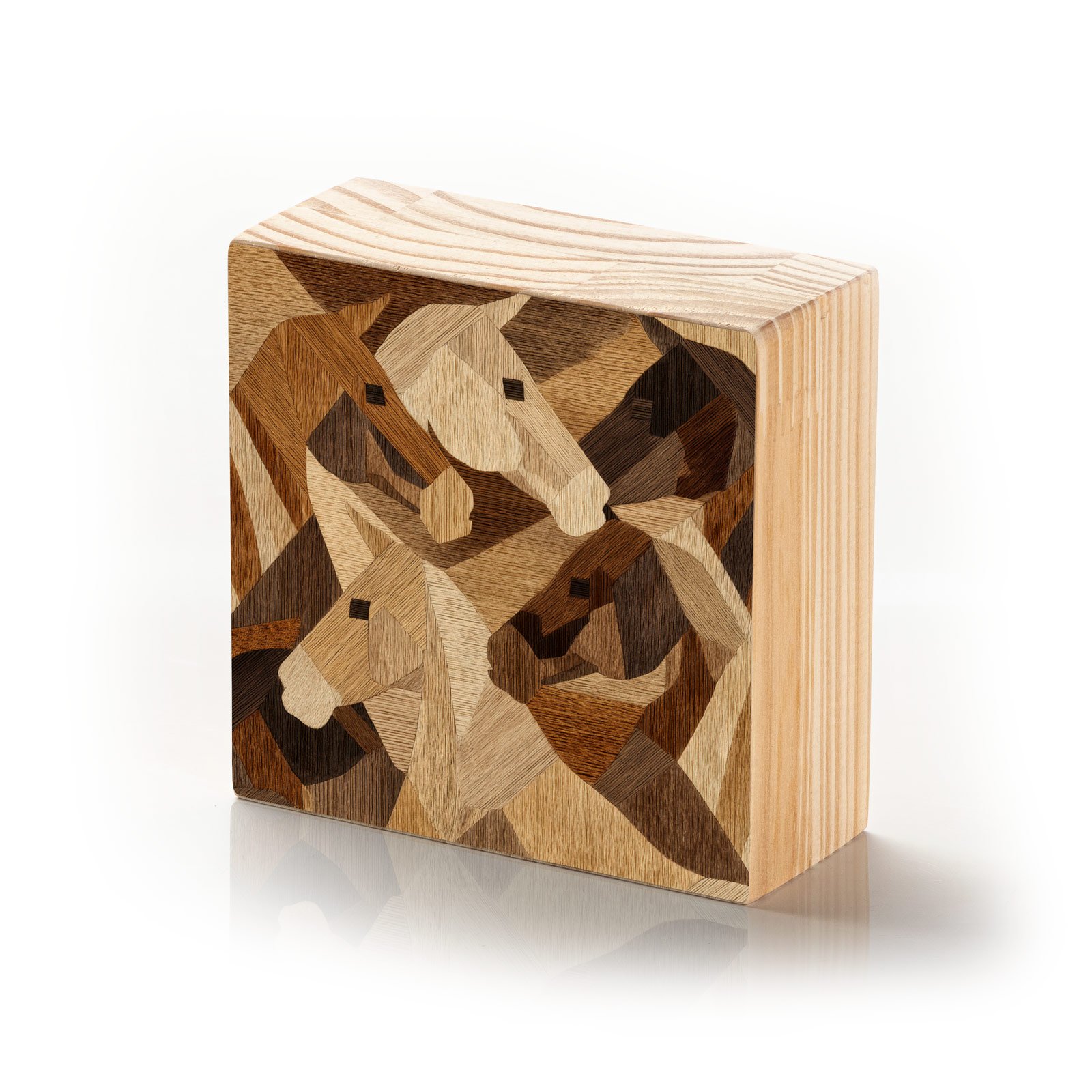 O poder e a nobreza dos cavalos ganham vida em “Essência Livre”, uma obra que une geometria, textura e intensidade. Os tons de madeira se entrelaçam em formas que sugerem velocidade, liberdade e a conexão profunda entre o homem e a natureza. Cada detalhe evoca imponência e energia, transformando o totem em uma peça de presença marcante.