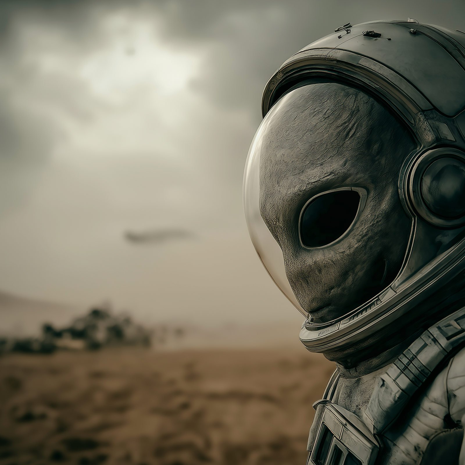 Um olhar solitário em meio a uma paisagem desértica e desconhecida: “Explorador de Outros Mundos” captura a essência da curiosidade e do mistério do cosmos. A figura alienígena em traje espacial transmite a sensação de um futuro distante, onde o encontro entre diferentes civilizações é inevitável.