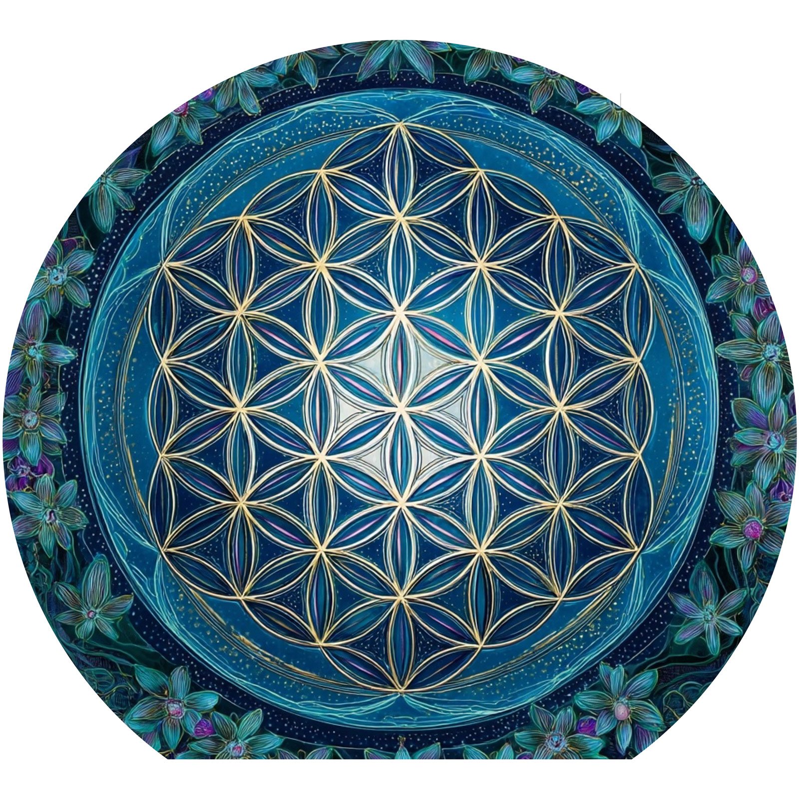 “Flor da Criação” traz à tona o símbolo sagrado da Flor da Vida, presente em culturas ancestrais como um portal de sabedoria e conexão com o todo. Seus traços dourados sobre o azul profundo evocam harmonia, geometrias cósmicas e o eterno ciclo de nascimento e renascimento.