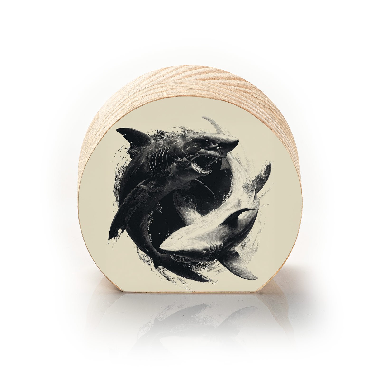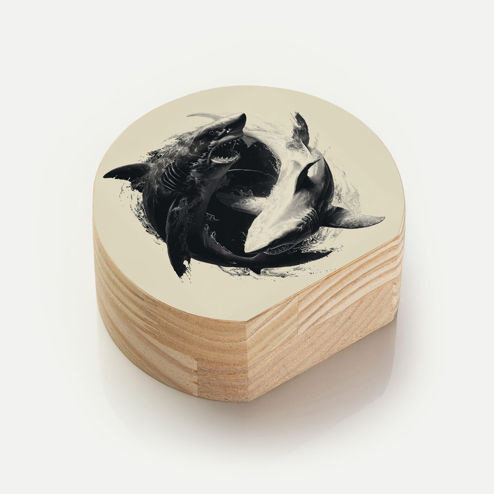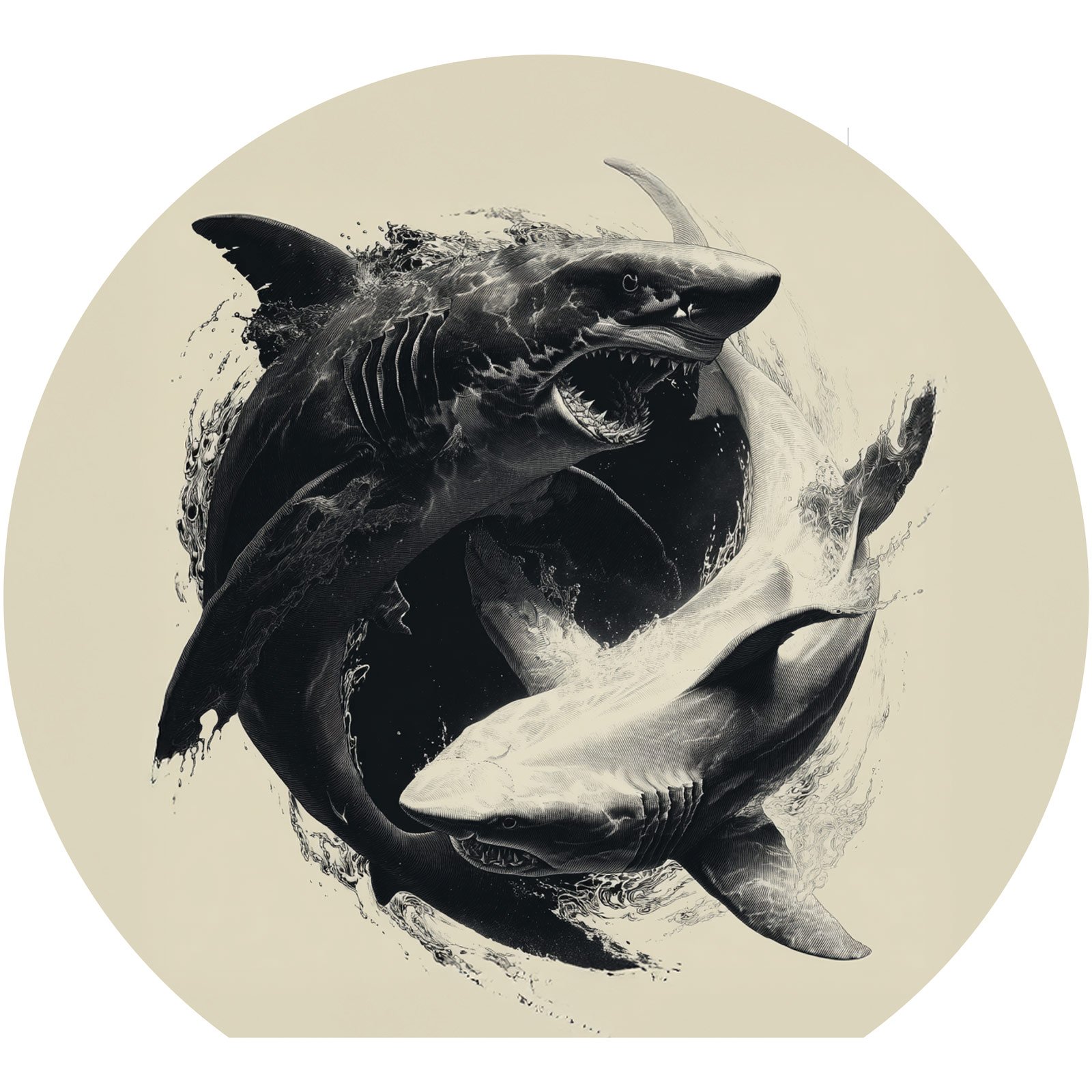 Entre contrastes intensos e formas circulares, “Força das Marés” revela o eterno duelo de poder e equilíbrio entre dois tubarões que giram como um yin-yang aquático. A obra transmite não apenas a imponência desses predadores, mas também a harmonia selvagem que governa o oceano.