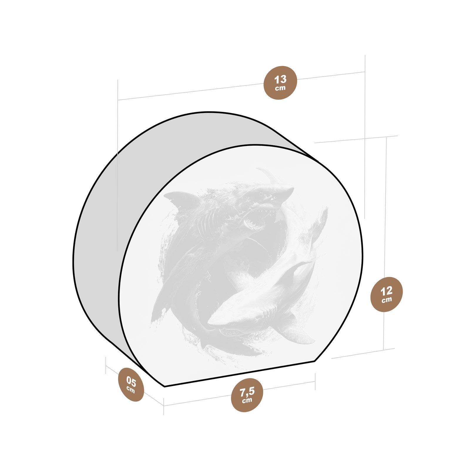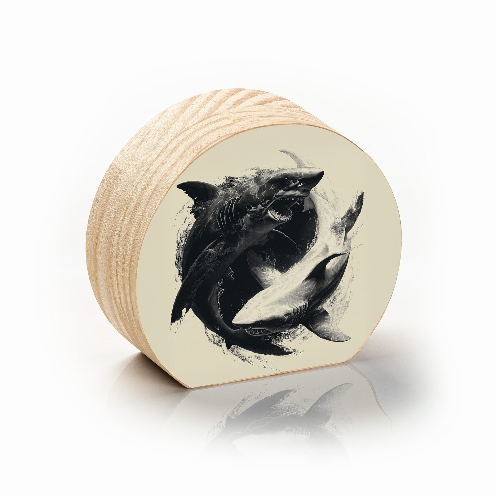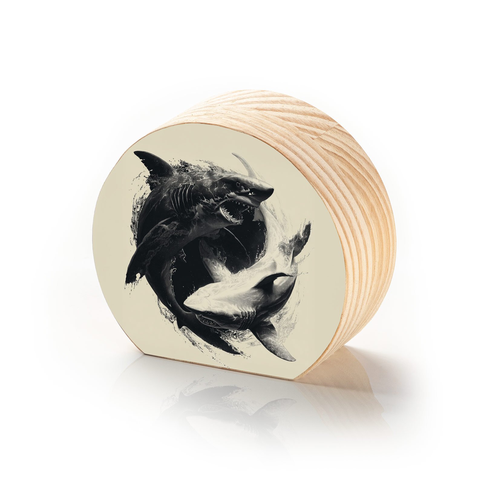 Entre contrastes intensos e formas circulares, “Força das Marés” revela o eterno duelo de poder e equilíbrio entre dois tubarões que giram como um yin-yang aquático. A obra transmite não apenas a imponência desses predadores, mas também a harmonia selvagem que governa o oceano.