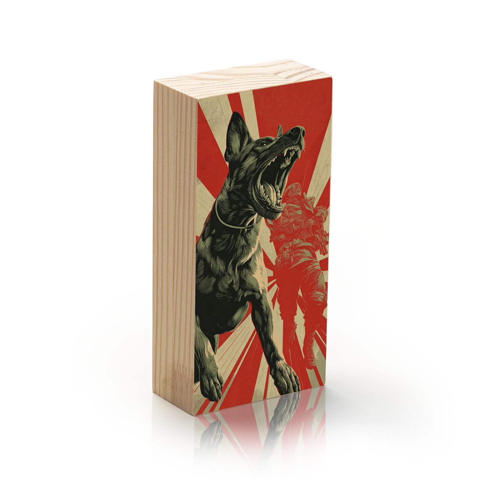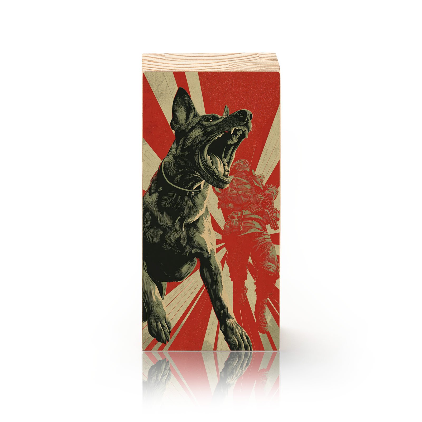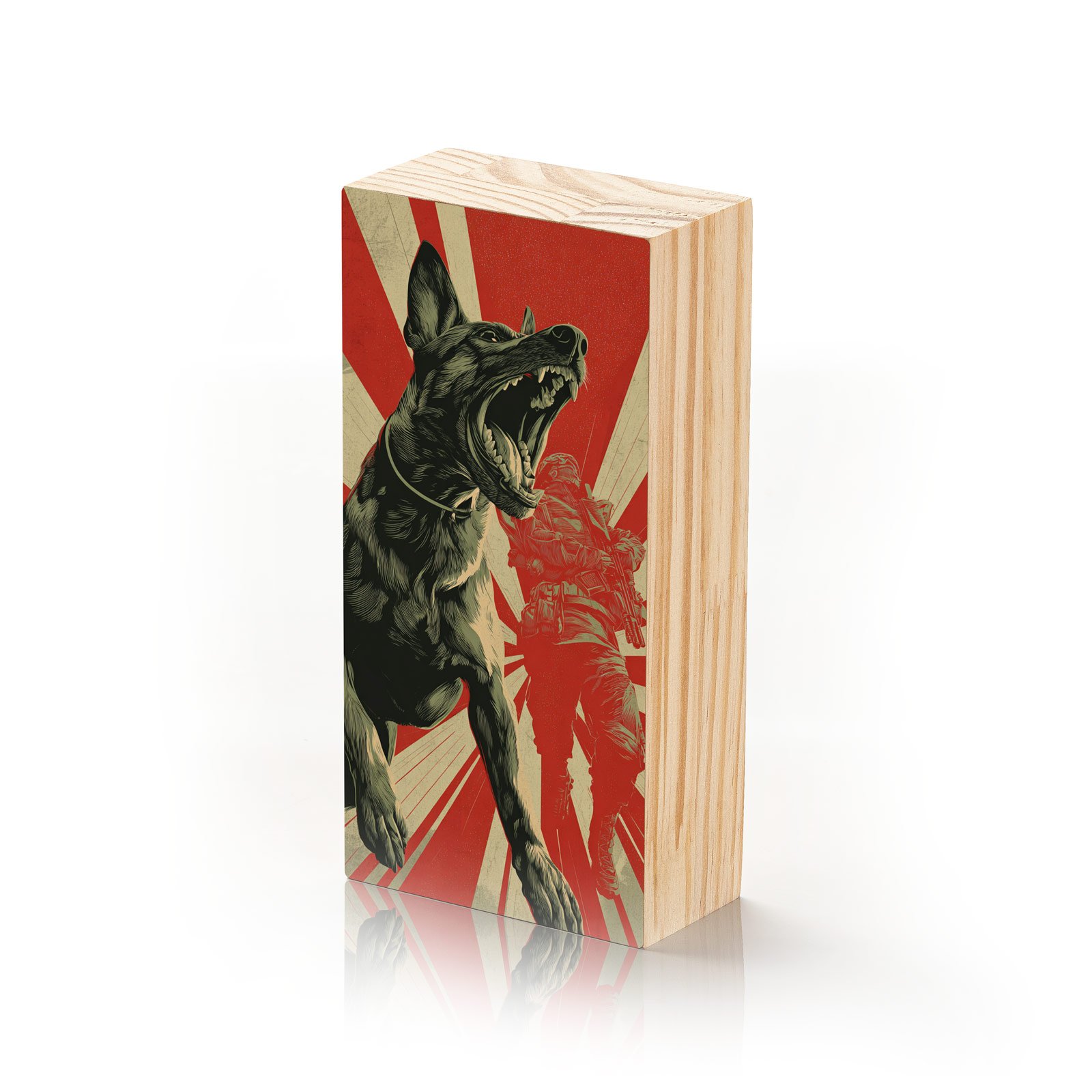 O “Força de Ataque” é um grito visual de poder e intensidade. A arte, inspirada no estilo de pôsteres de resistência e contracultura, mostra um cão de ataque avançando em primeiro plano, com a silhueta de um soldado ao fundo e raios vermelhos que explodem como energia bruta. Uma obra que transmite ação, revolta e coragem, ideal para ambientes que pedem presença marcante.