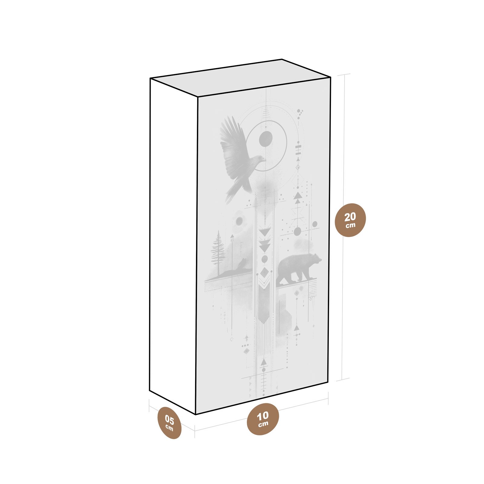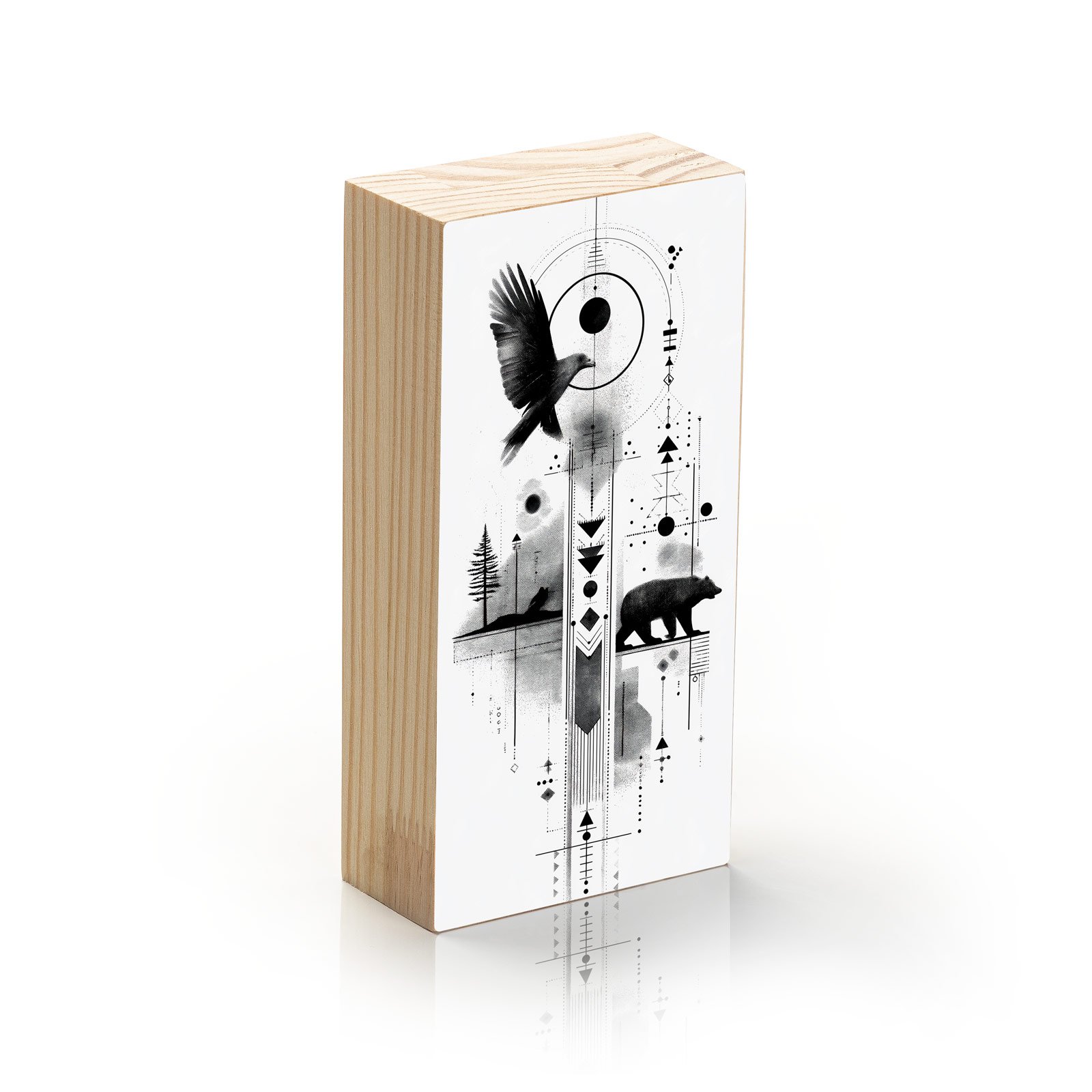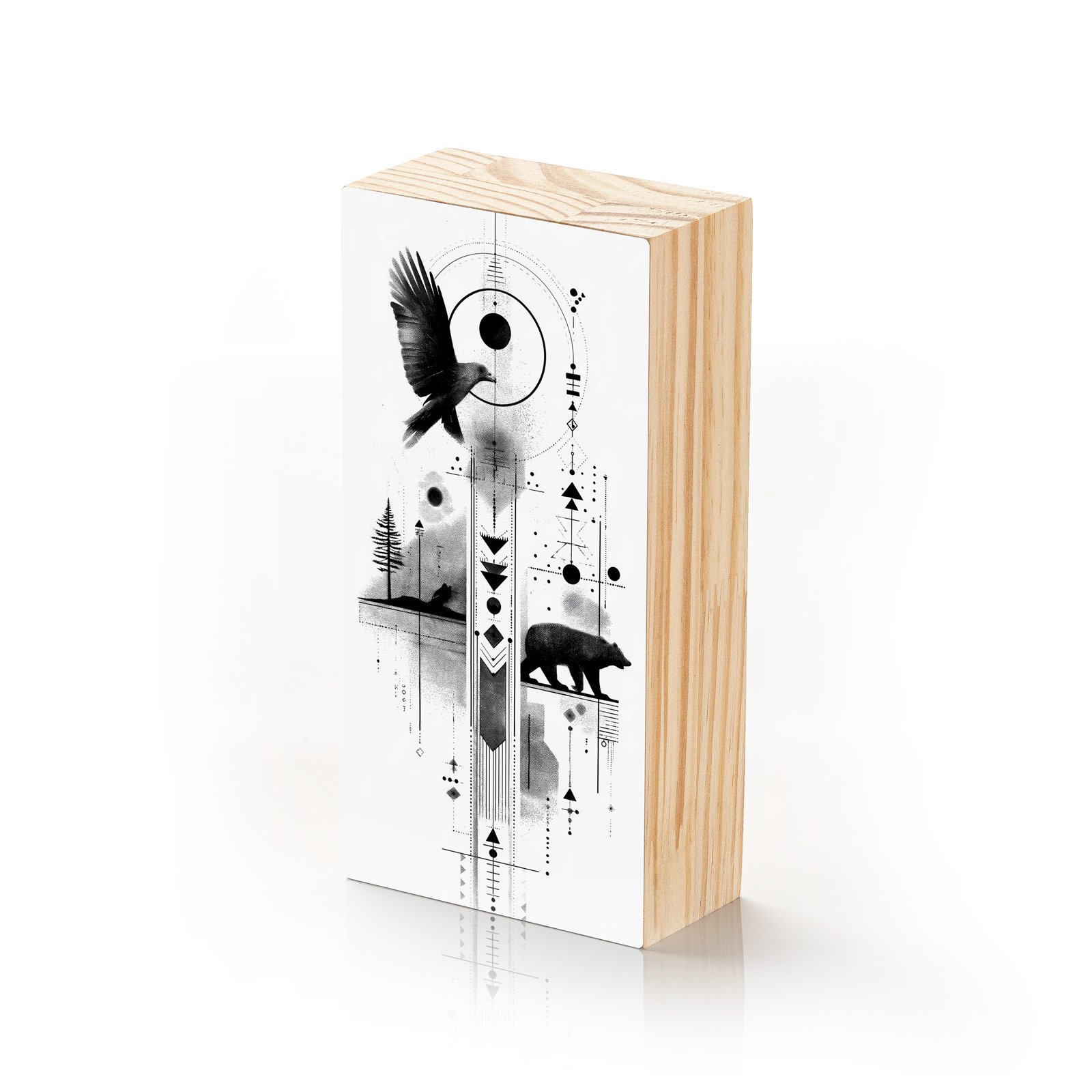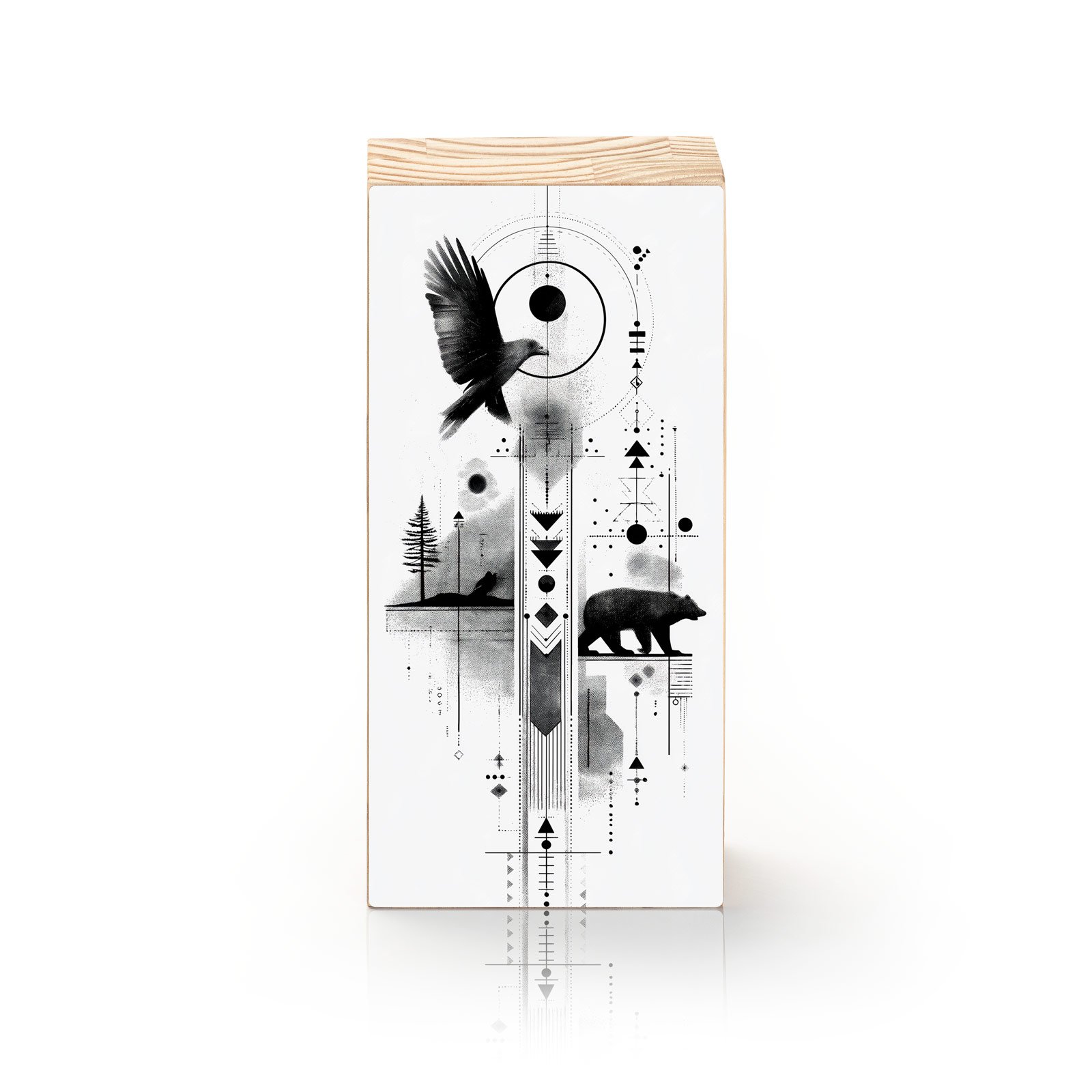 Permita-se ser guiado pelos instintos da floresta com o Totem Decorativo “Força do Norte” da Linha Vert. Esta obra monocromática une a presença sagrada do urso e o voo livre do corvo em uma composição marcada por símbolos tribais e linhas geométricas. Uma representação poderosa da conexão entre céu e terra, coragem e sabedoria.