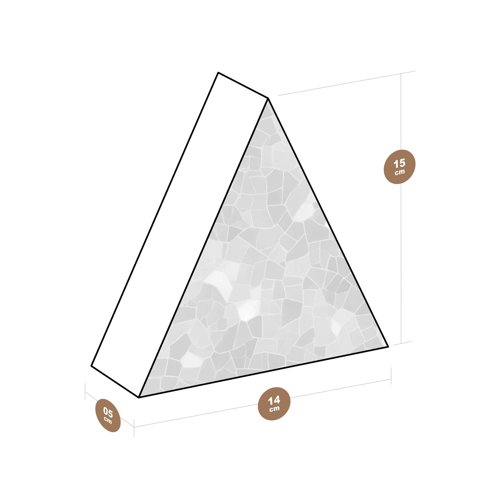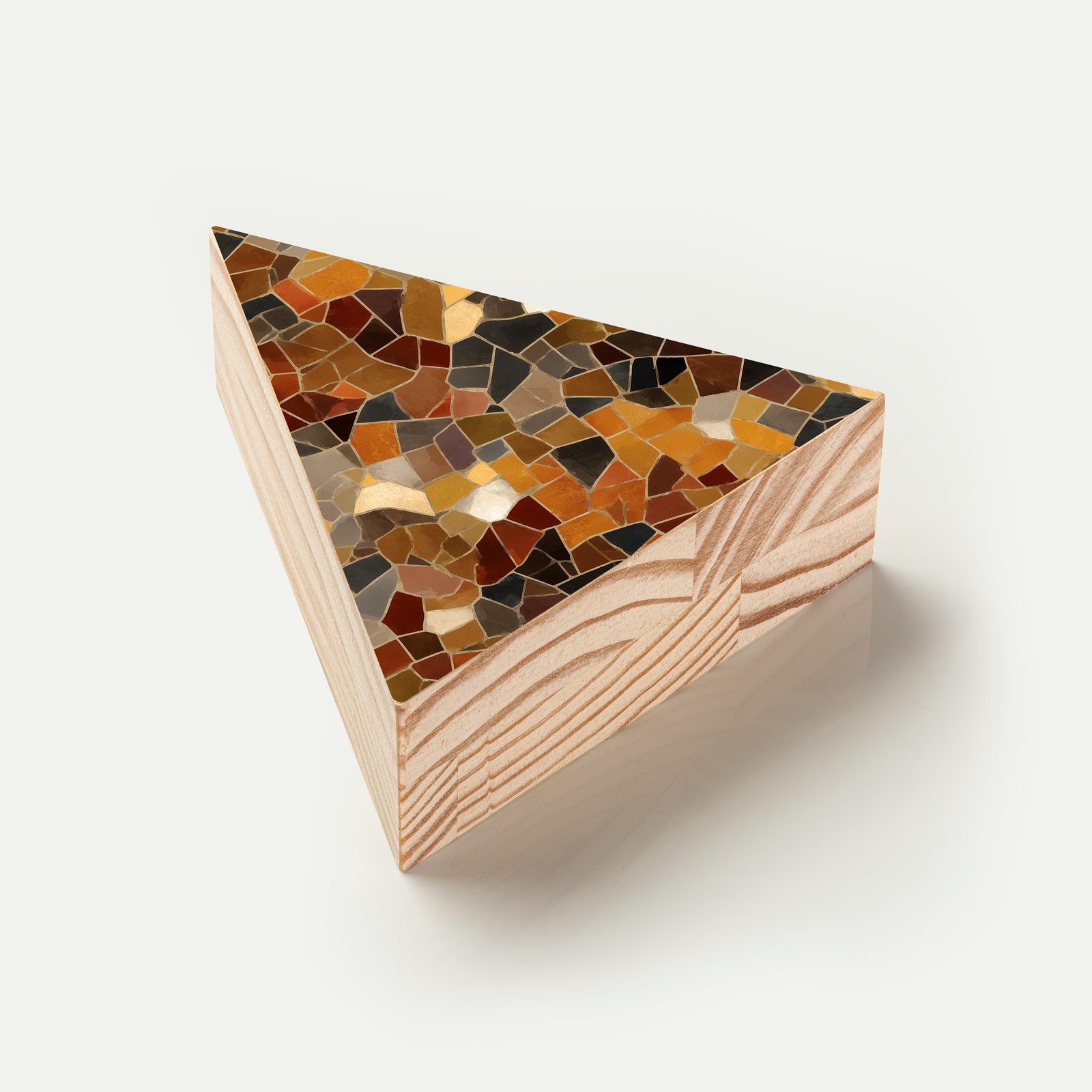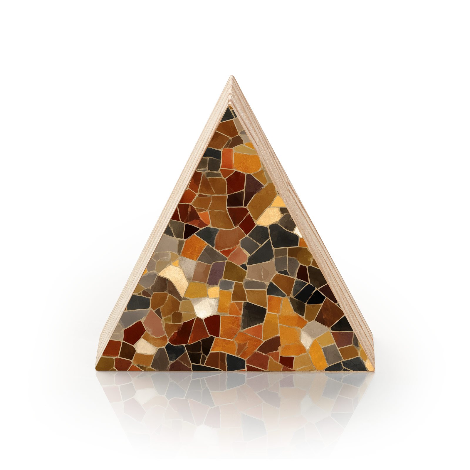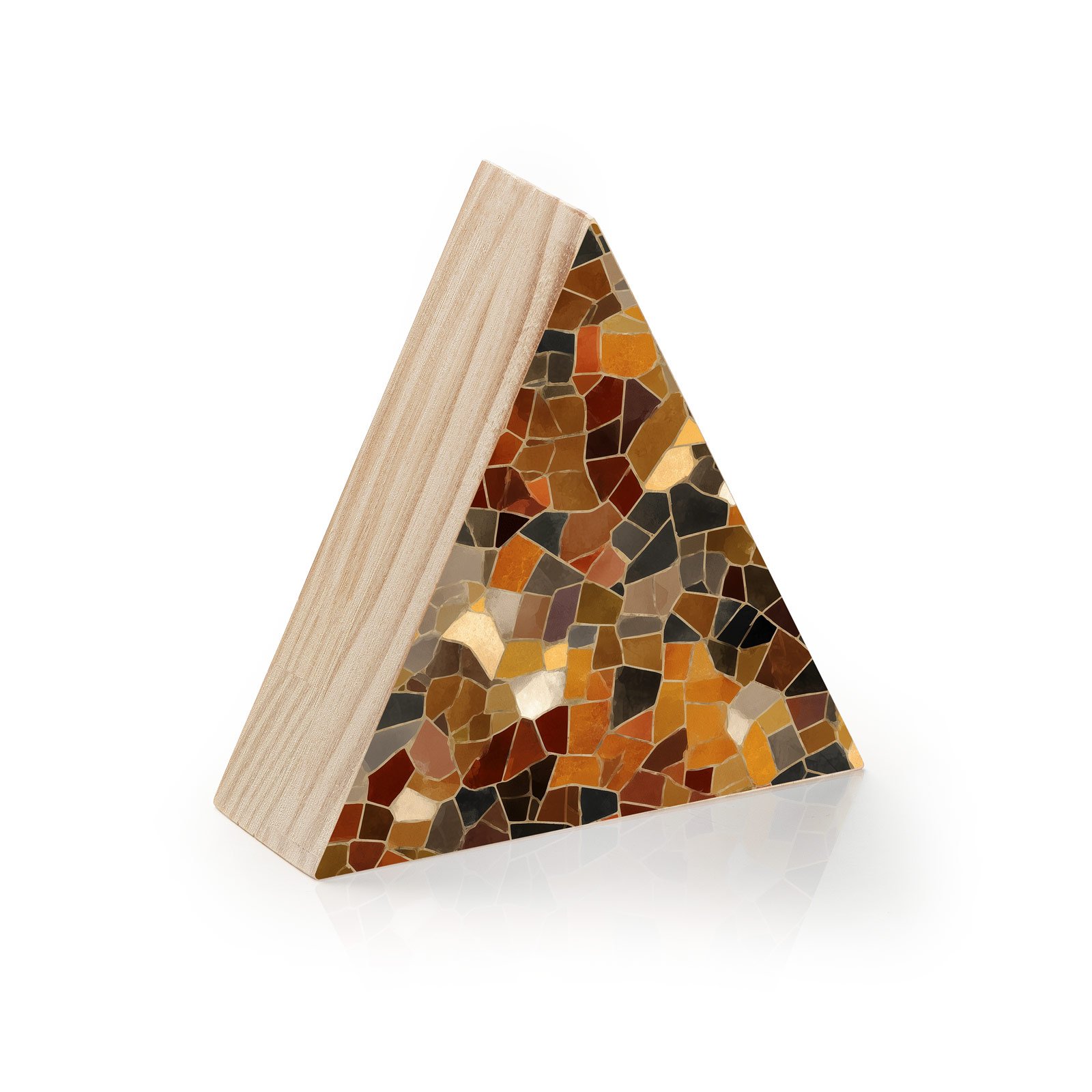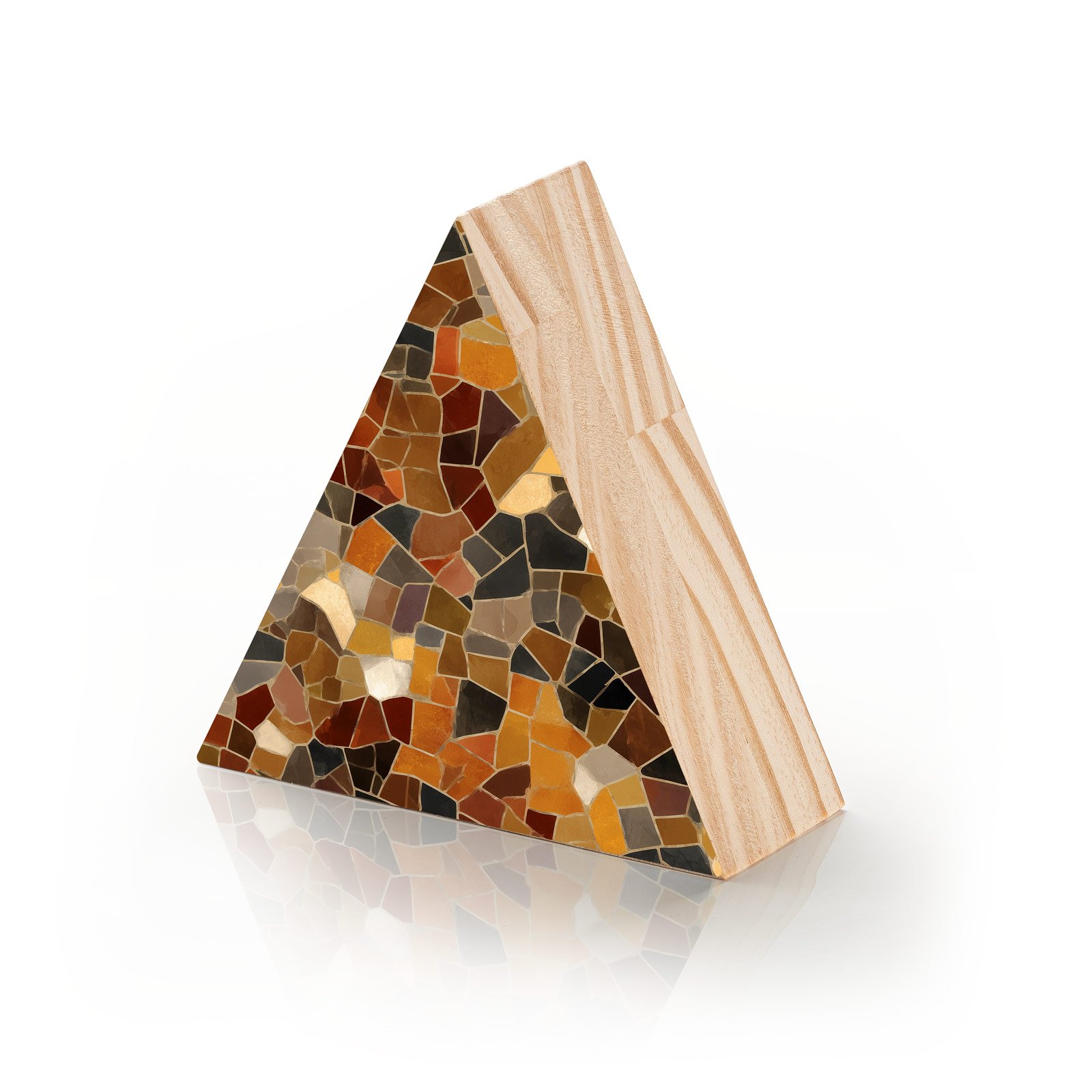 Em tons de âmbar, cobre e dourado, as pequenas peças se unem em um padrão quente e vibrante como brasas prestes a acender. “Fragmentos de Fogo” da Linha Trion, é uma obra abstrata em formato triangular que exala calor visual, energia criativa e força ancestral como se cada pedaço contasse a história de um elemento primordial.