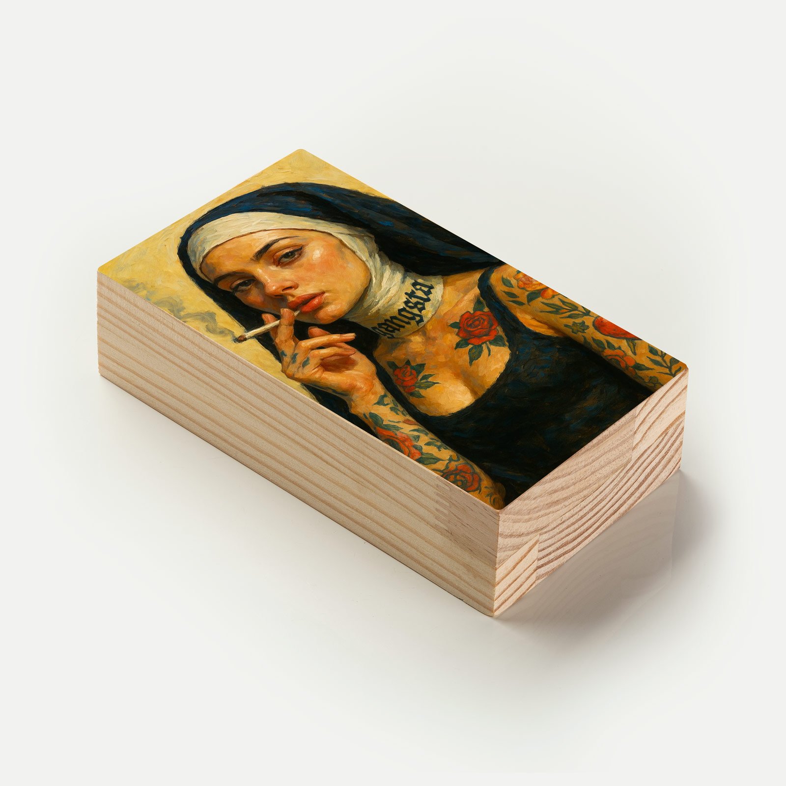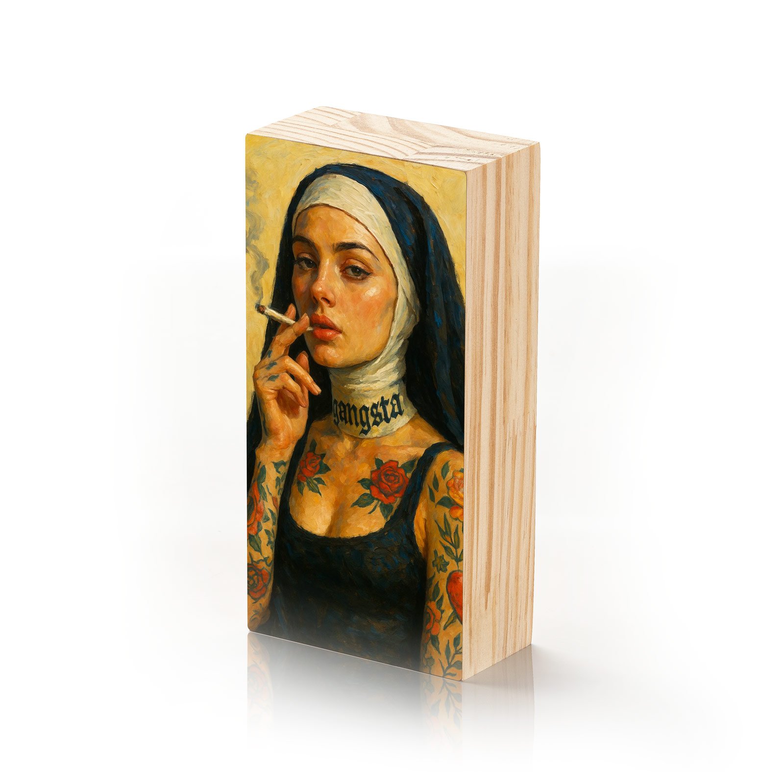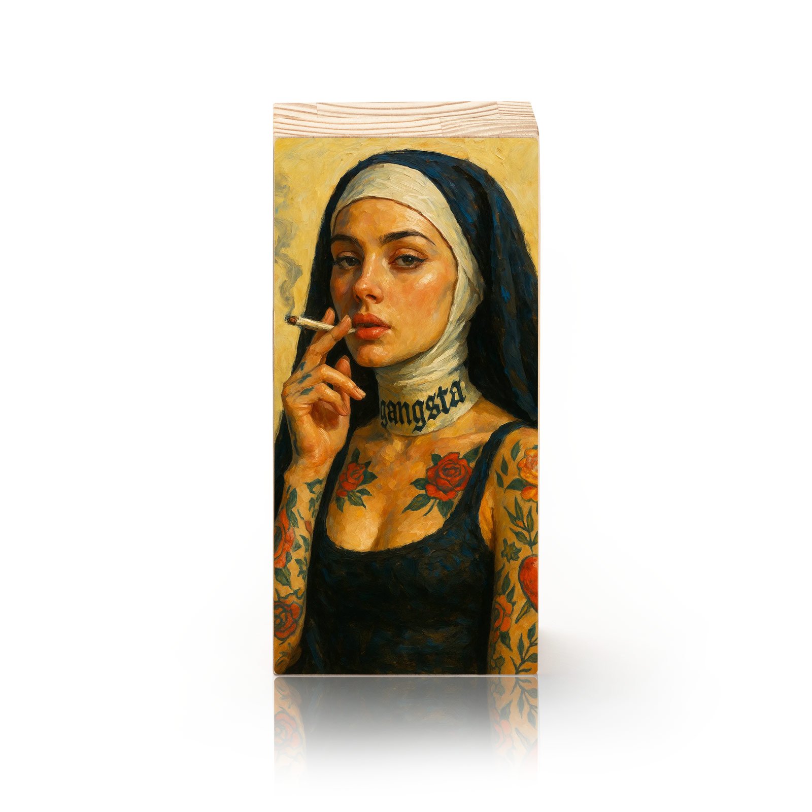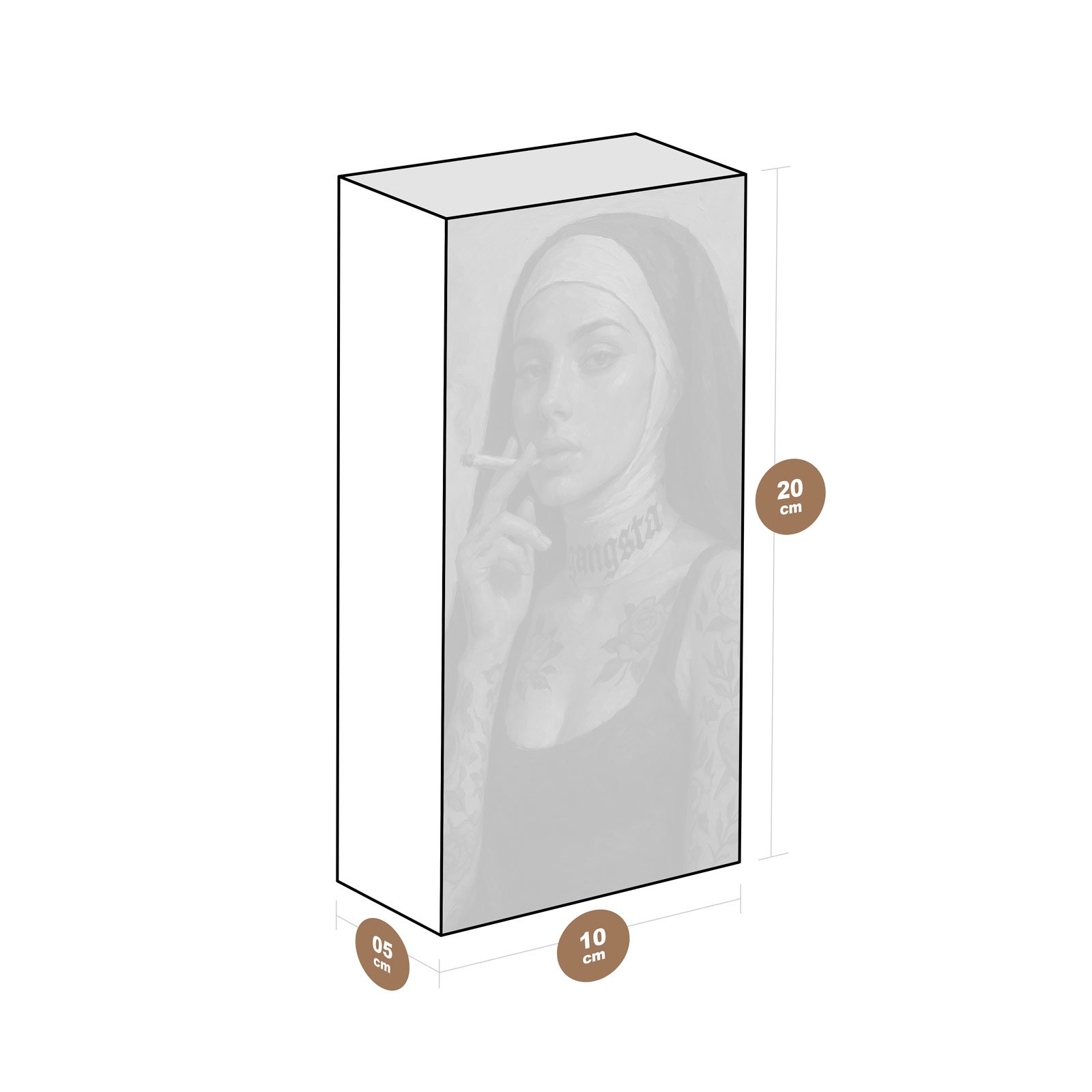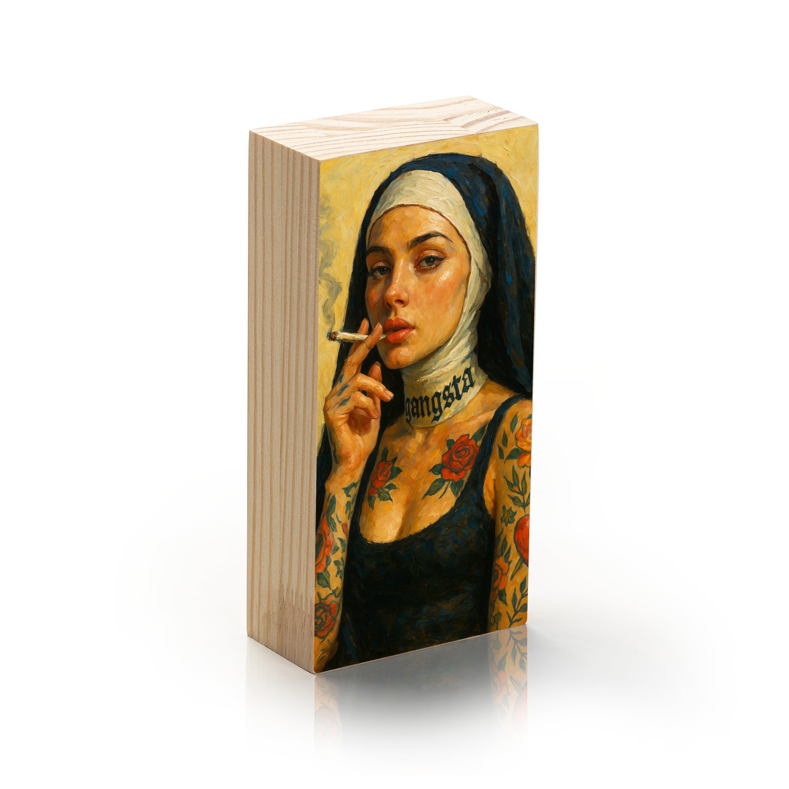 Entre o sagrado e o profano, nasce um ícone de rebeldia e poder feminino. O Totem Decorativo “Gangsta Santa” da Linha Vert apresenta uma freira contemporânea com tatuagens marcantes, olhar firme e cigarro na mão. Uma obra que rompe barreiras, questiona padrões e evoca a força das escolhas autênticas.