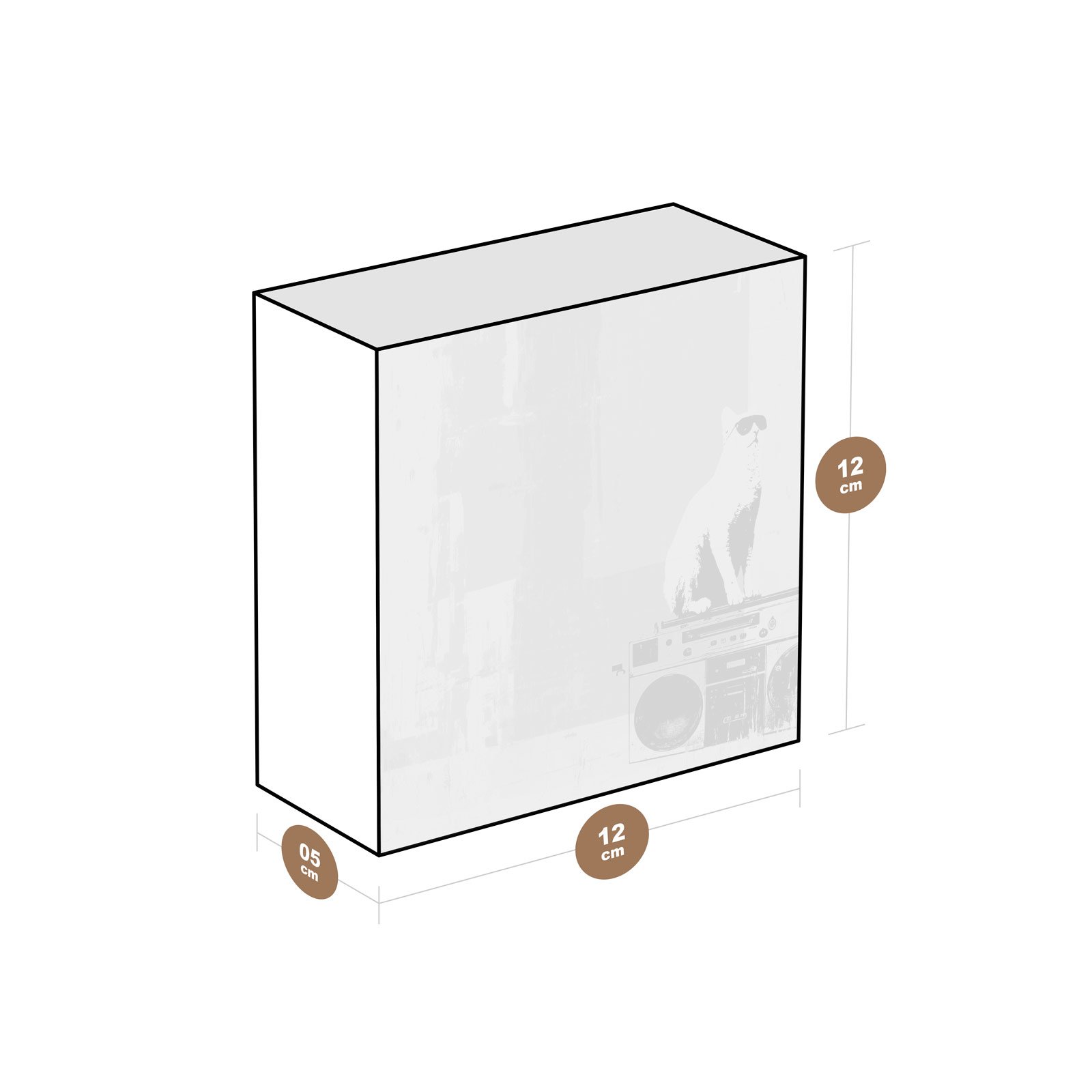 - Dimensões: 12 cm (altura) x 12 cm (largura) x 5 cm (profundidade);