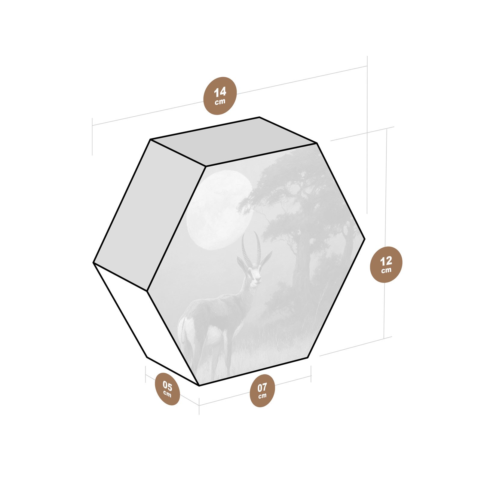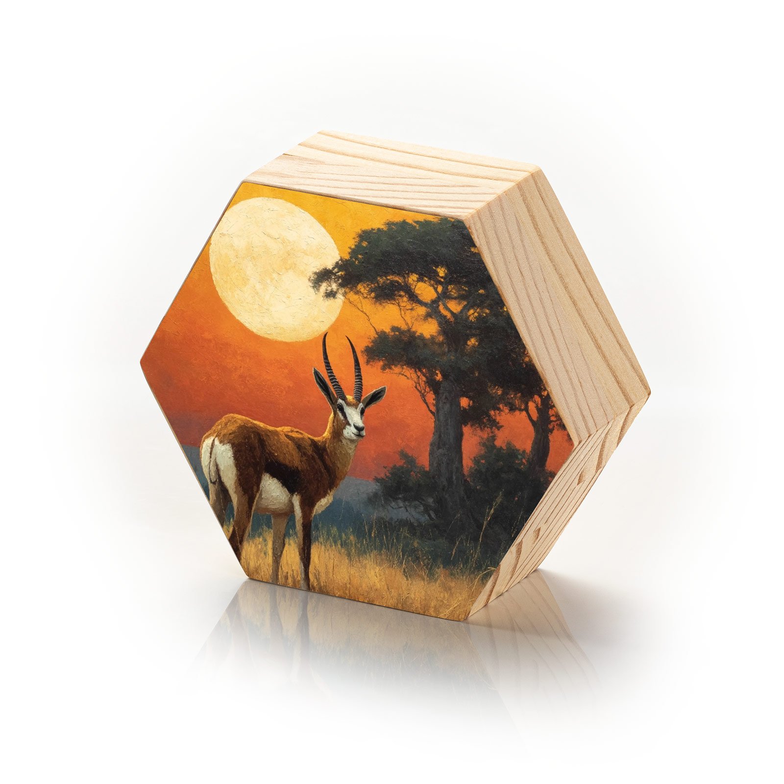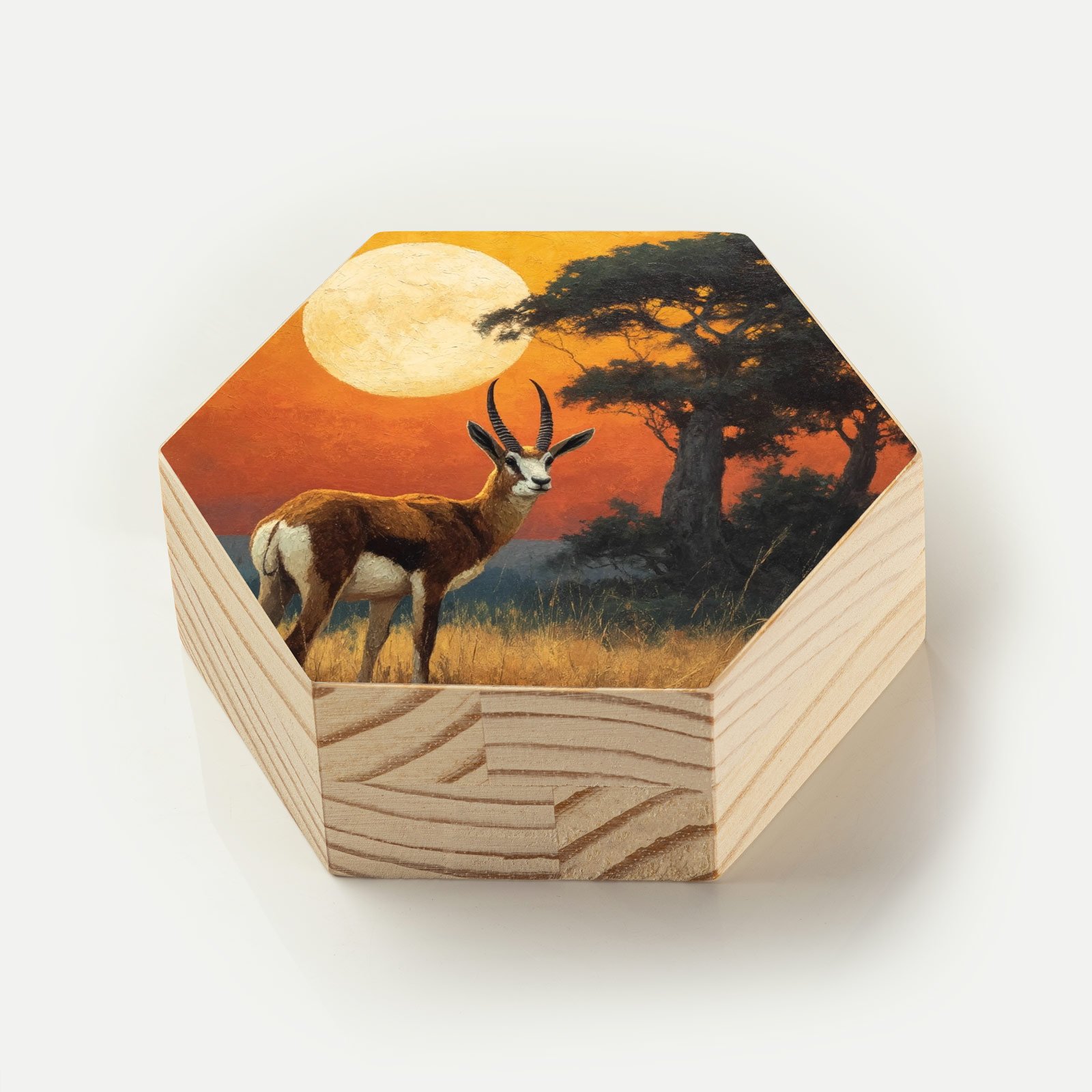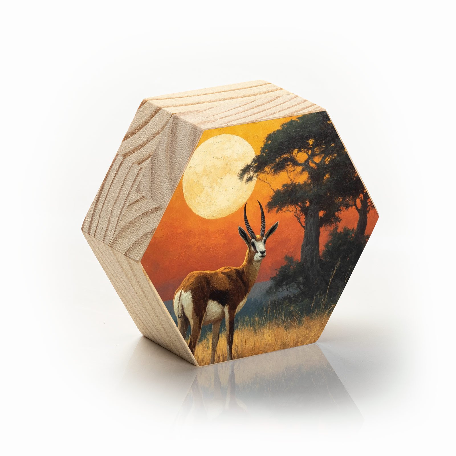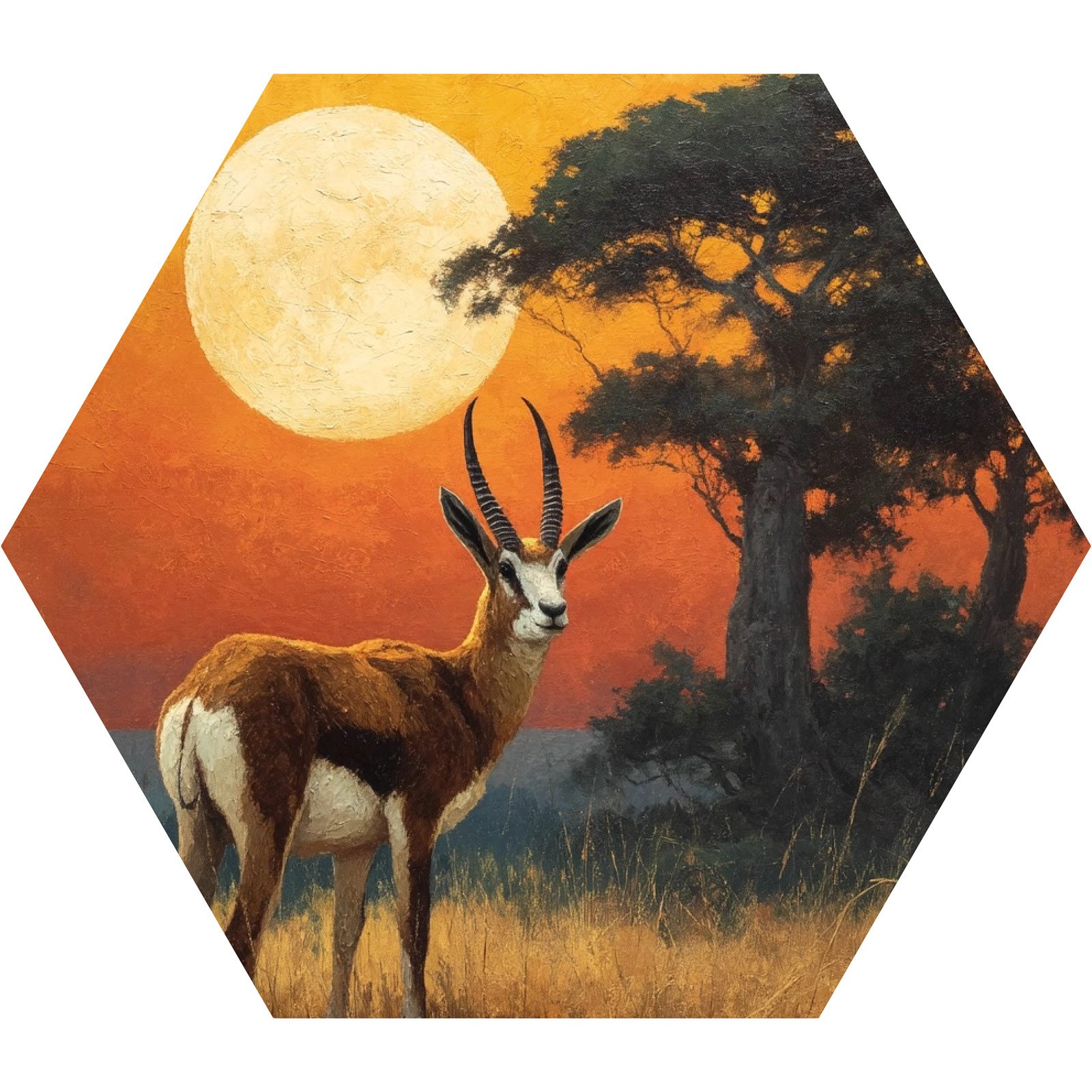 Diante da vastidão dourada e do sol imenso que repousa no horizonte, um antílope ergue-se sereno, como símbolo de presença, elegância e conexão com a natureza selvagem. O Totem Decorativo “Guardião da Savana” da Linha Hezag, é um tributo à beleza da vida em equilíbrio com a terra.