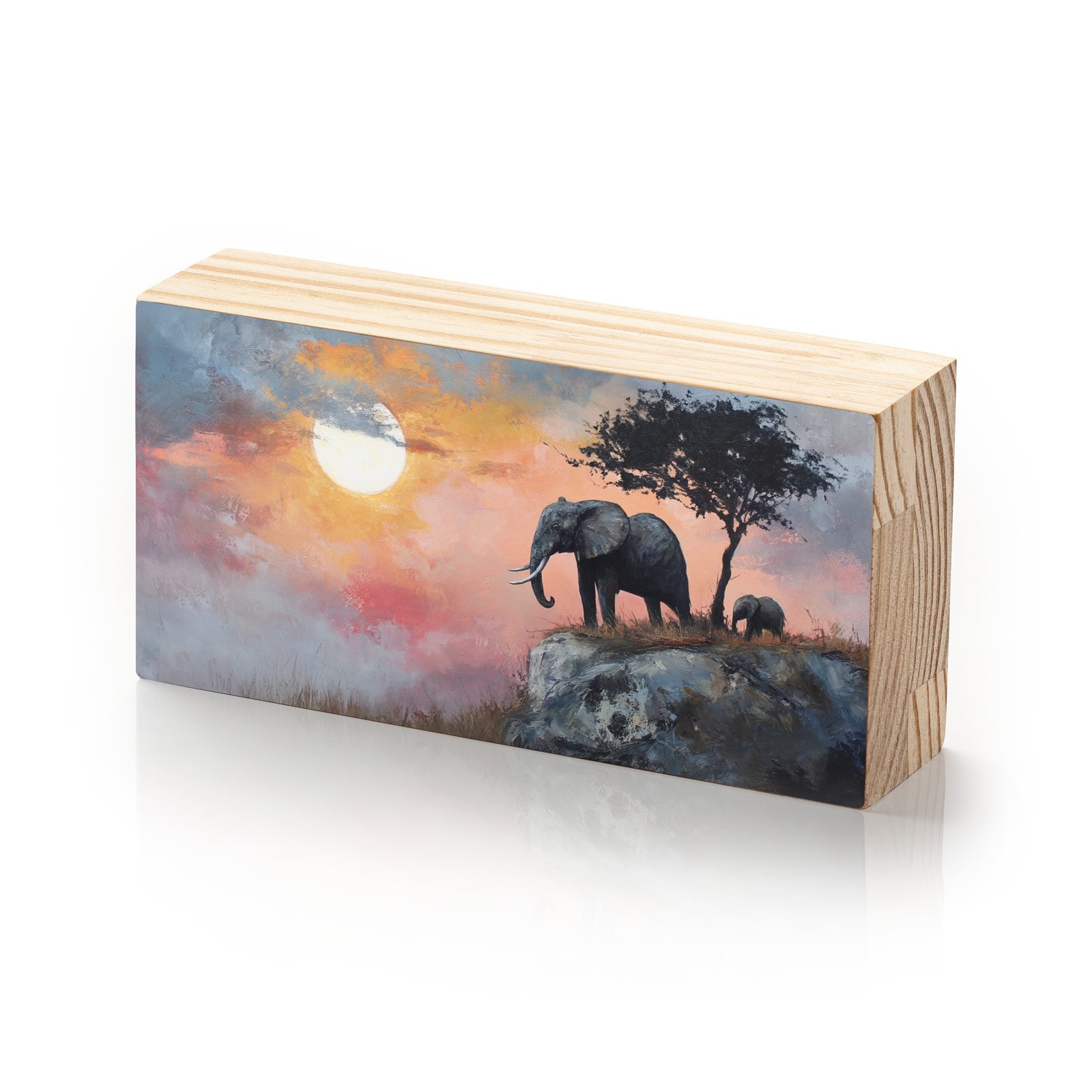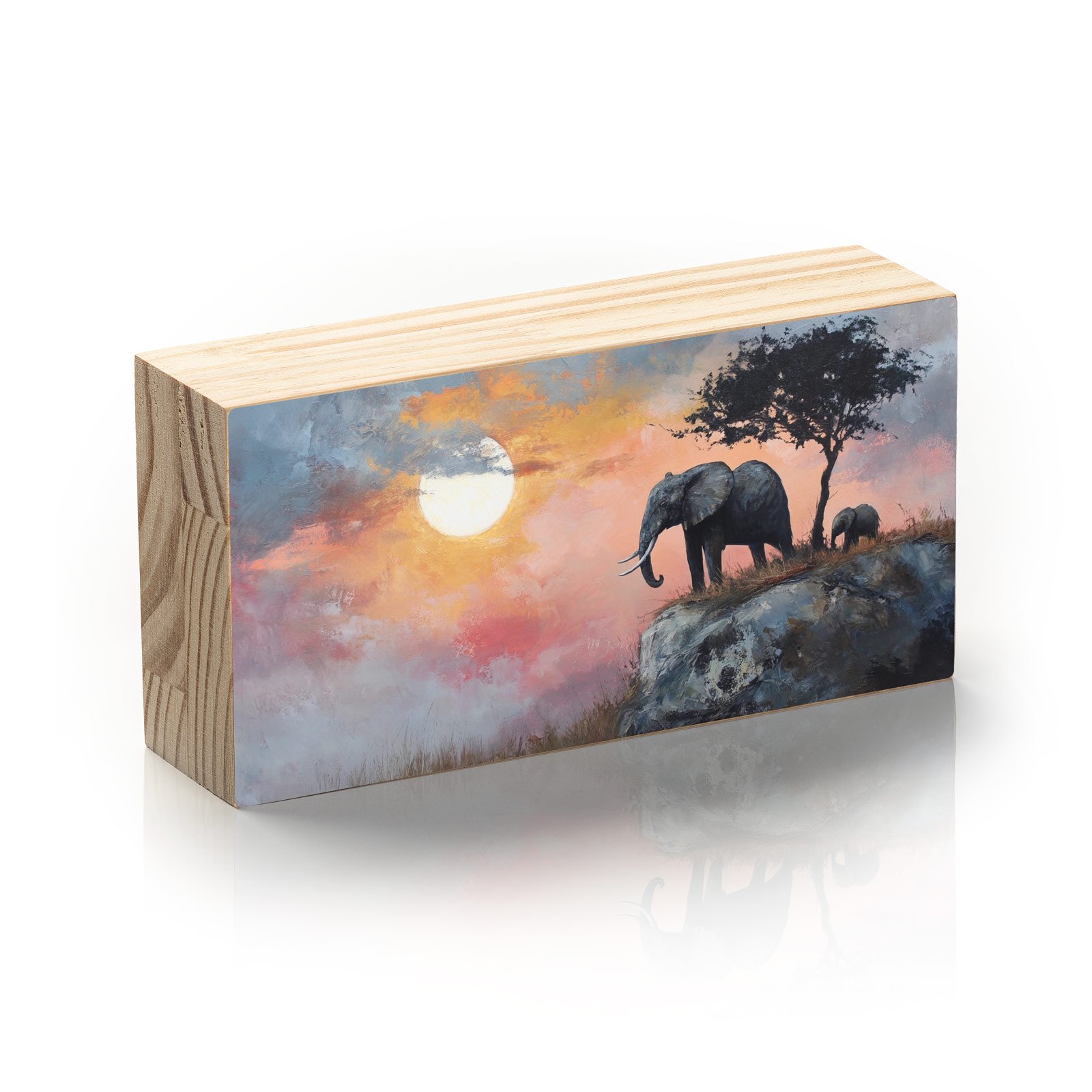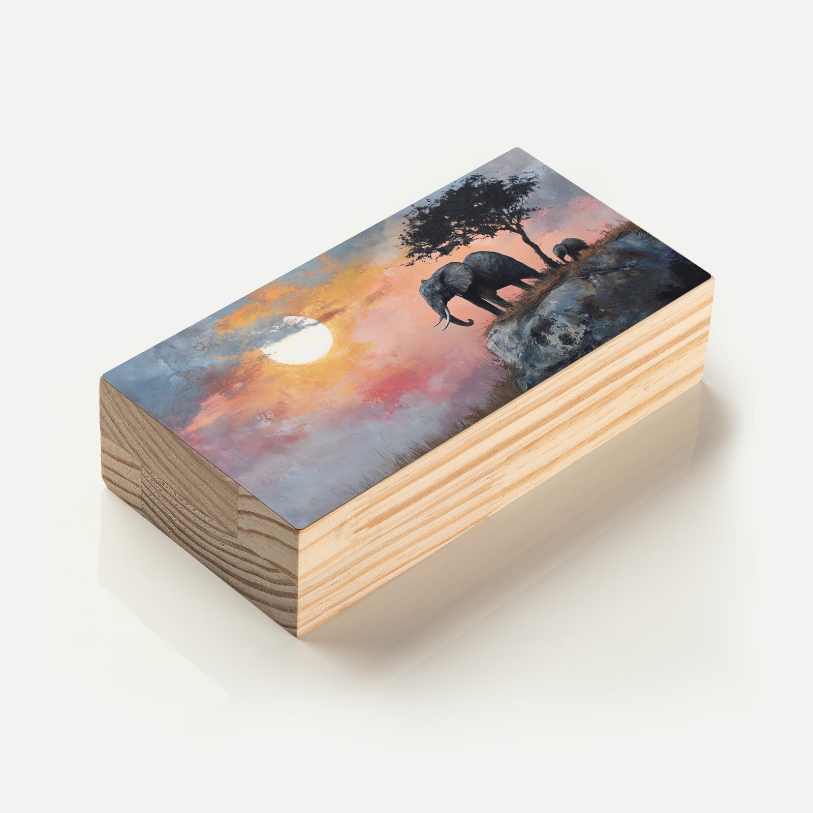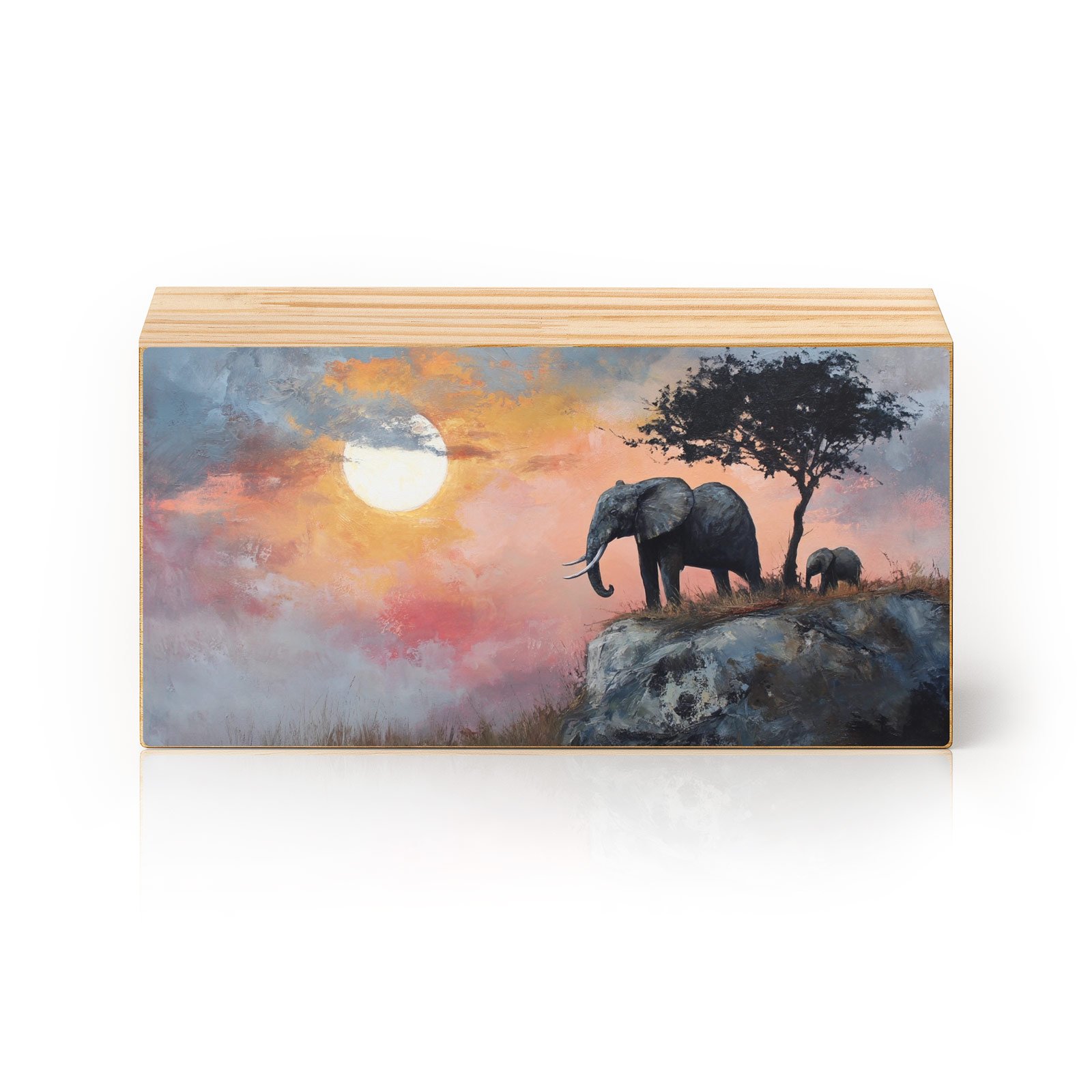 Do alto de um penhasco, um elefante majestoso observa o horizonte tingido de laranja, rosa e violeta, enquanto o sol se despede do céu. Ao lado, um pequeno elefante inicia seus passos. O Totem Decorativo “Guardião do Poente” da Linha Horizon, é um símbolo de força ancestral, proteção e conexão entre gerações.