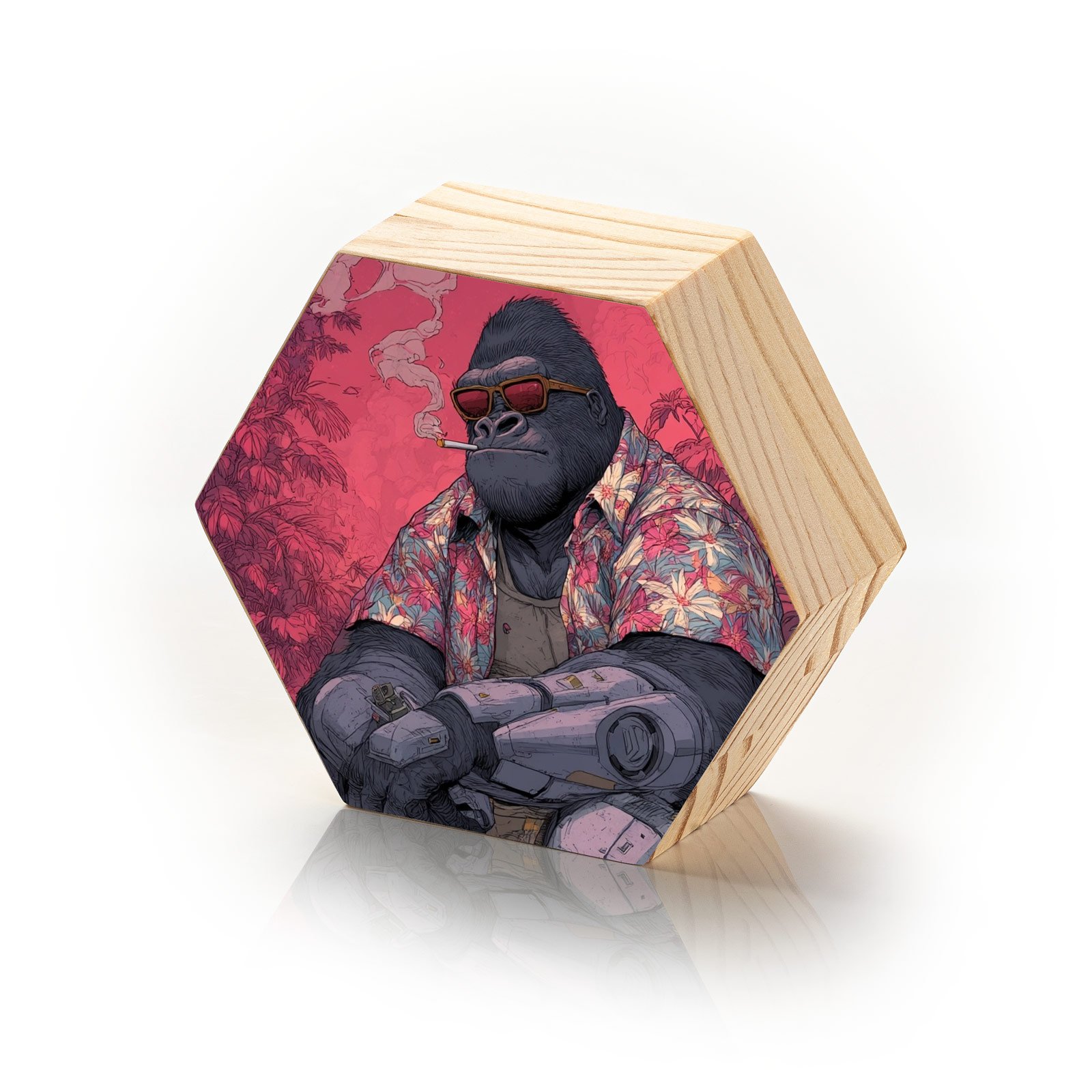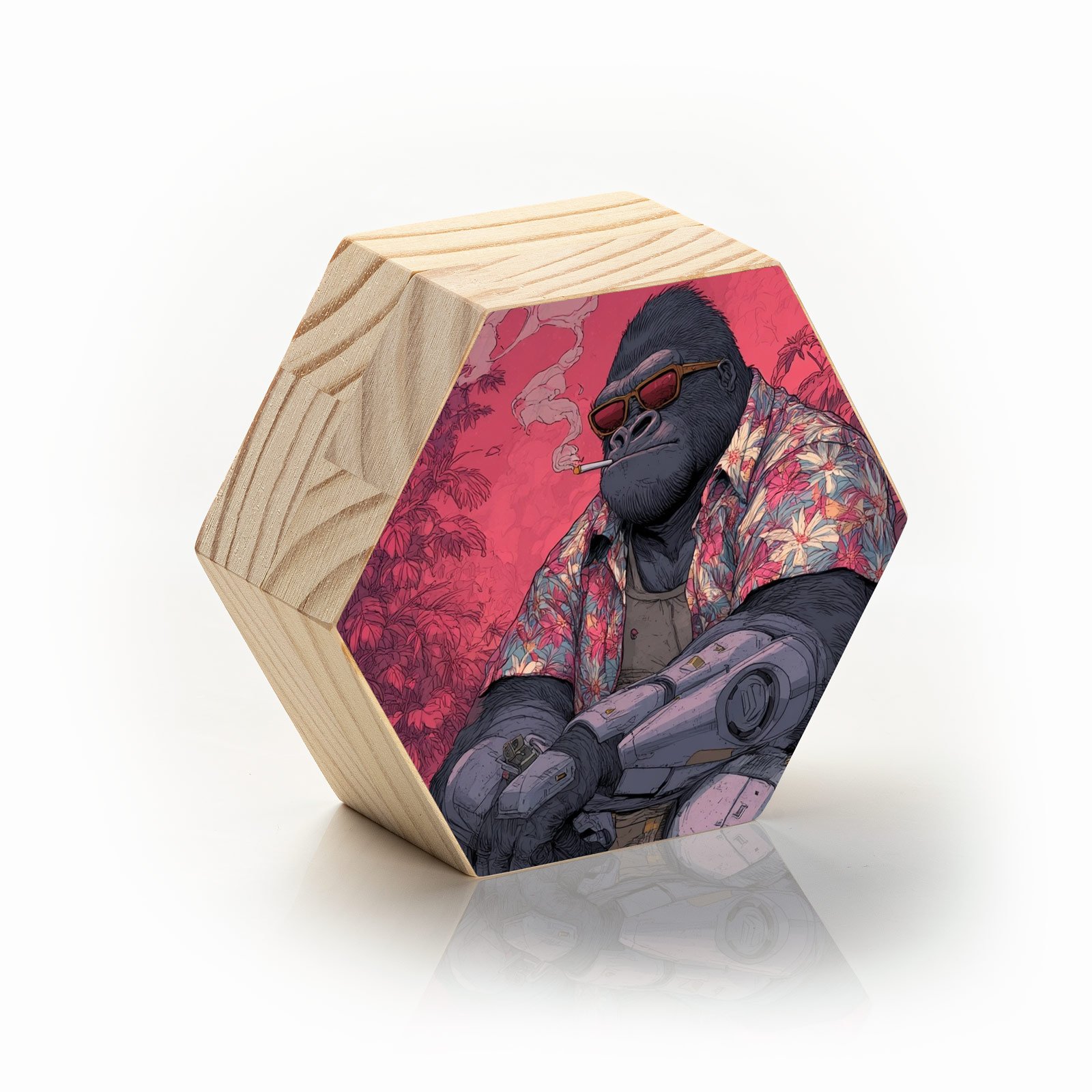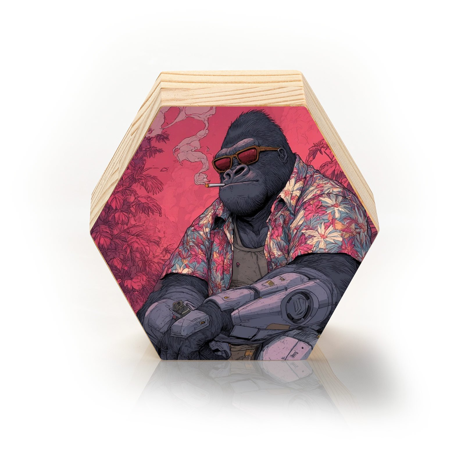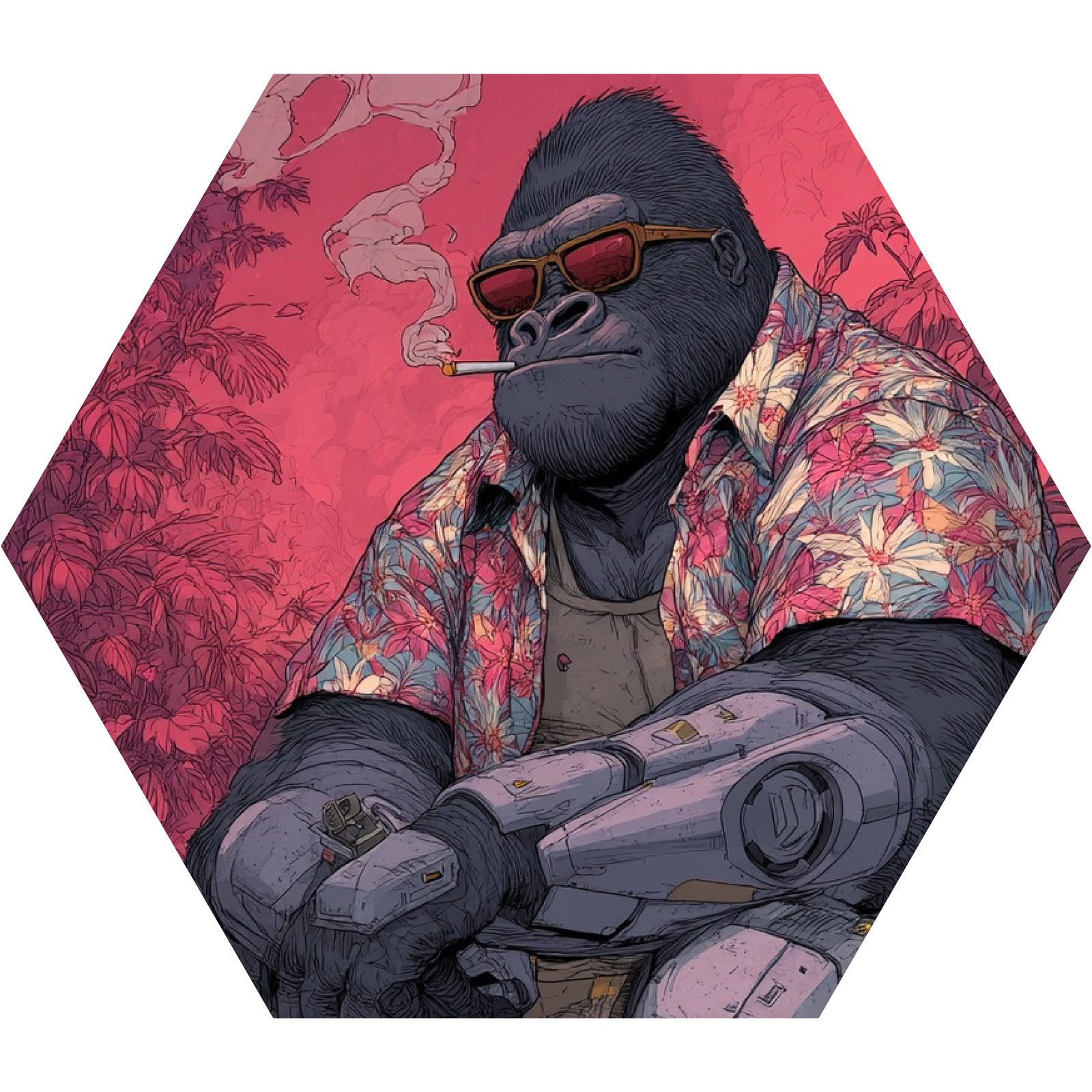 Camisa florida, charuto aceso, olhar sereno e um braço biônico: o gorila mais estiloso da selva acaba de chegar. “Instinto Tropical” da Linha Hezag, mistura força, relax e futurismo em uma obra que transborda atitude.