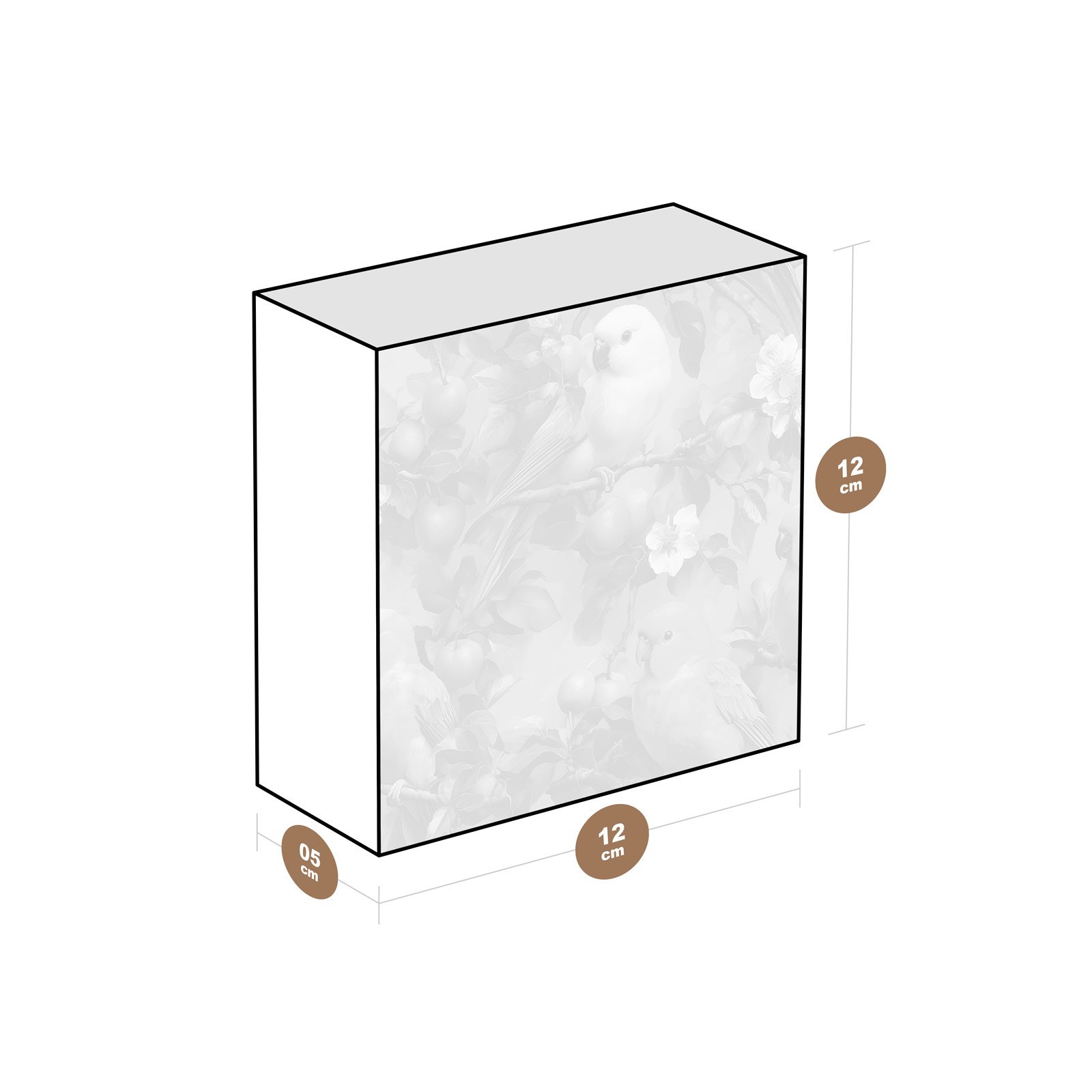 - Dimensões: 12 cm (largura) x 12 cm (altura) x 6 cm (profundidade);