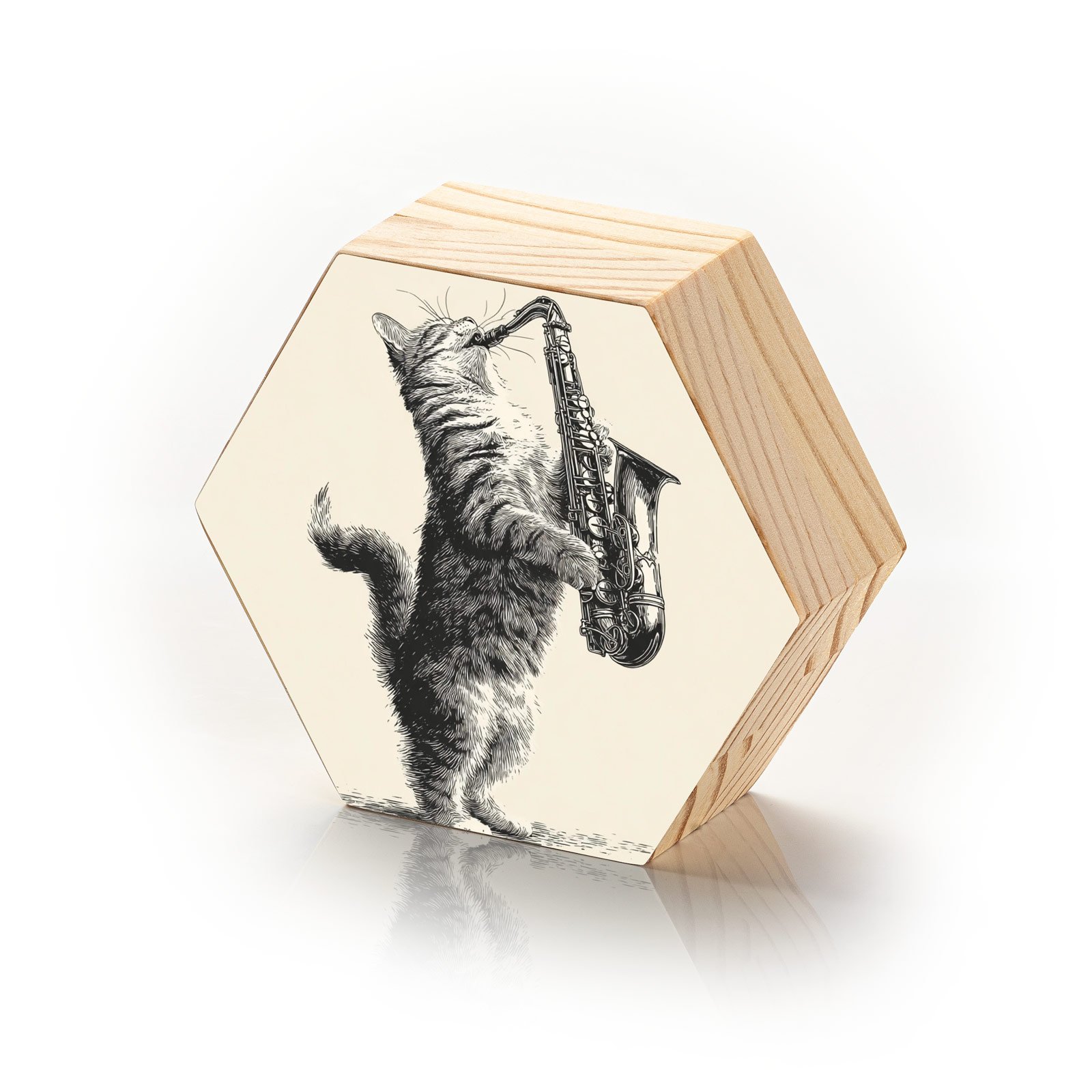 Improviso é arte, e arte é liberdade. O Totem Decorativo “Jazz Felino” da Linha Hezag, retrata um instante de puro swing e irreverência: um gato em pé, em total entrega, toca seu saxofone como se o mundo fosse um palco só seu. A composição em preto e branco brinca com o inesperado e encanta pela originalidade.