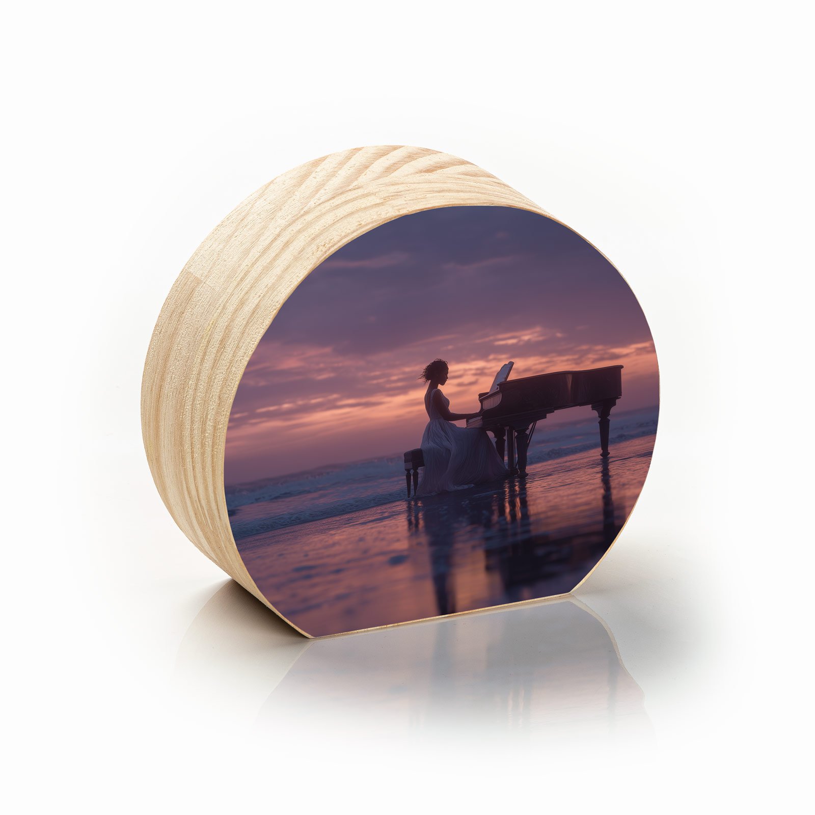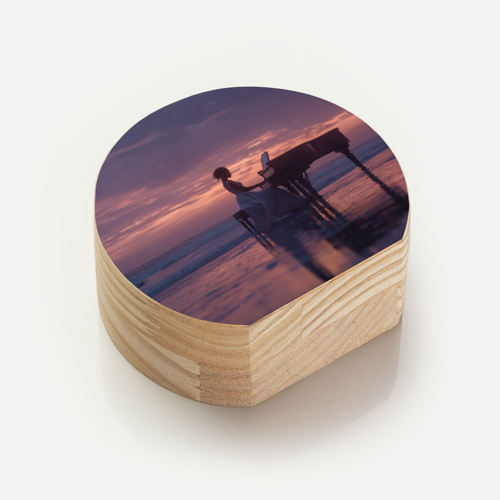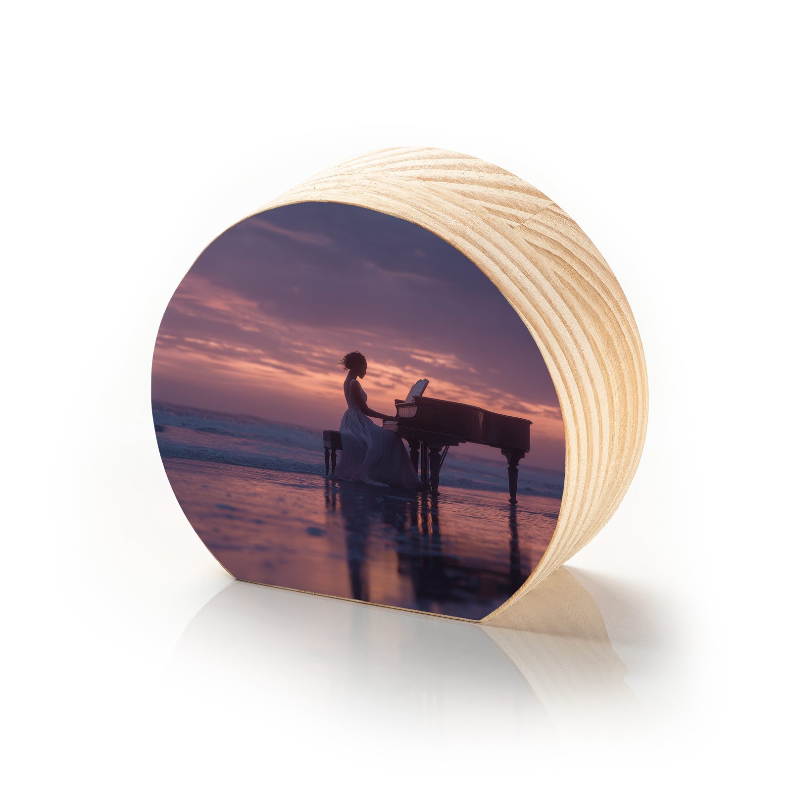Em meio ao encontro entre mar e céu, “Melodia do Horizonte” captura a imagem onírica de uma pianista tocando sobre as águas ao pôr do sol. A cena, envolta em tons de violeta e dourado, transmite serenidade e intensidade, como se cada nota ecoasse na imensidão do oceano e do tempo.
