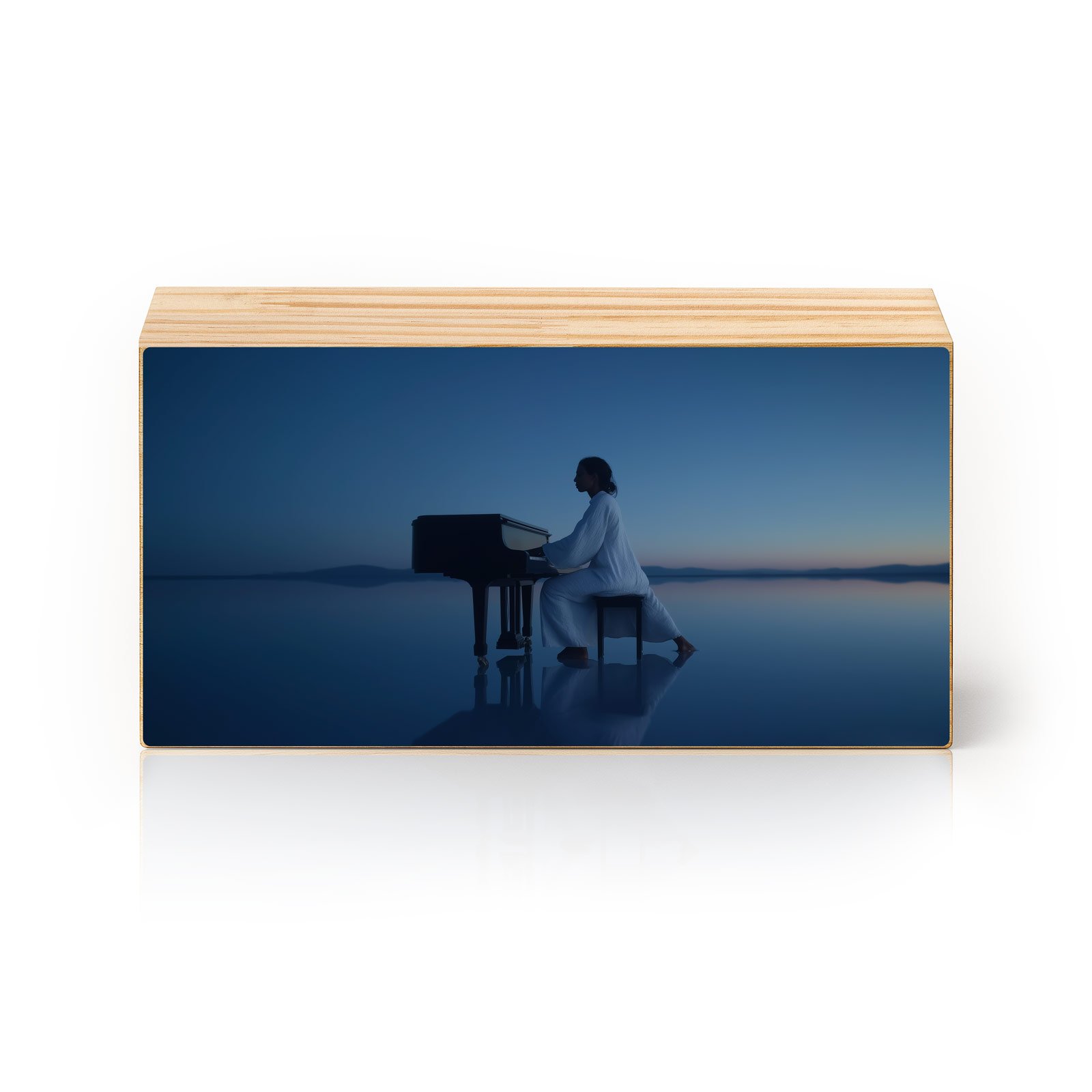 “Melodia do Infinito” é uma obra que celebra a conexão entre música, silêncio e horizonte. A figura serena do pianista em trajes claros, refletida nas águas tranquilas ao pôr do sol, simboliza a harmonia entre o humano e o eterno. Uma poesia visual que transforma notas musicais em ecos de contemplação.