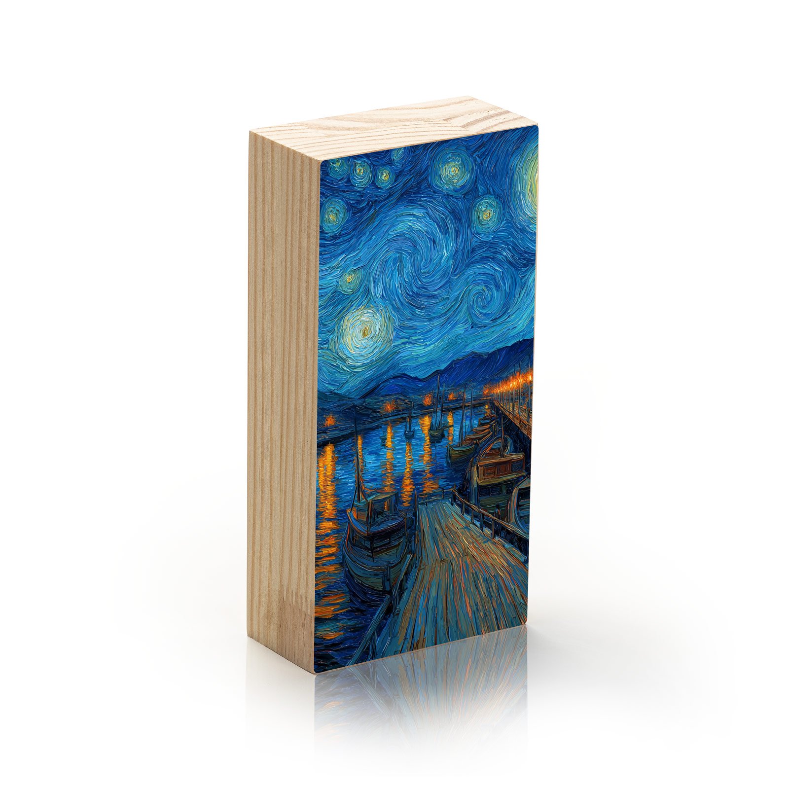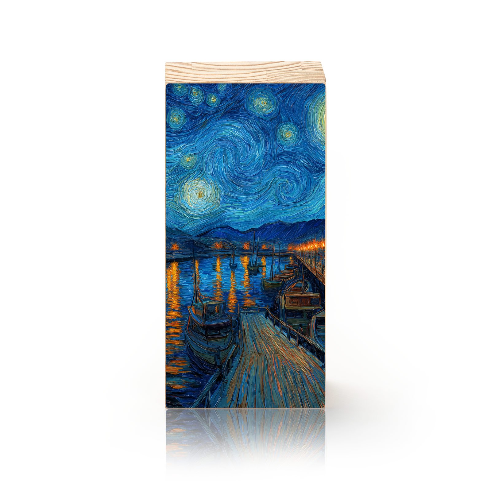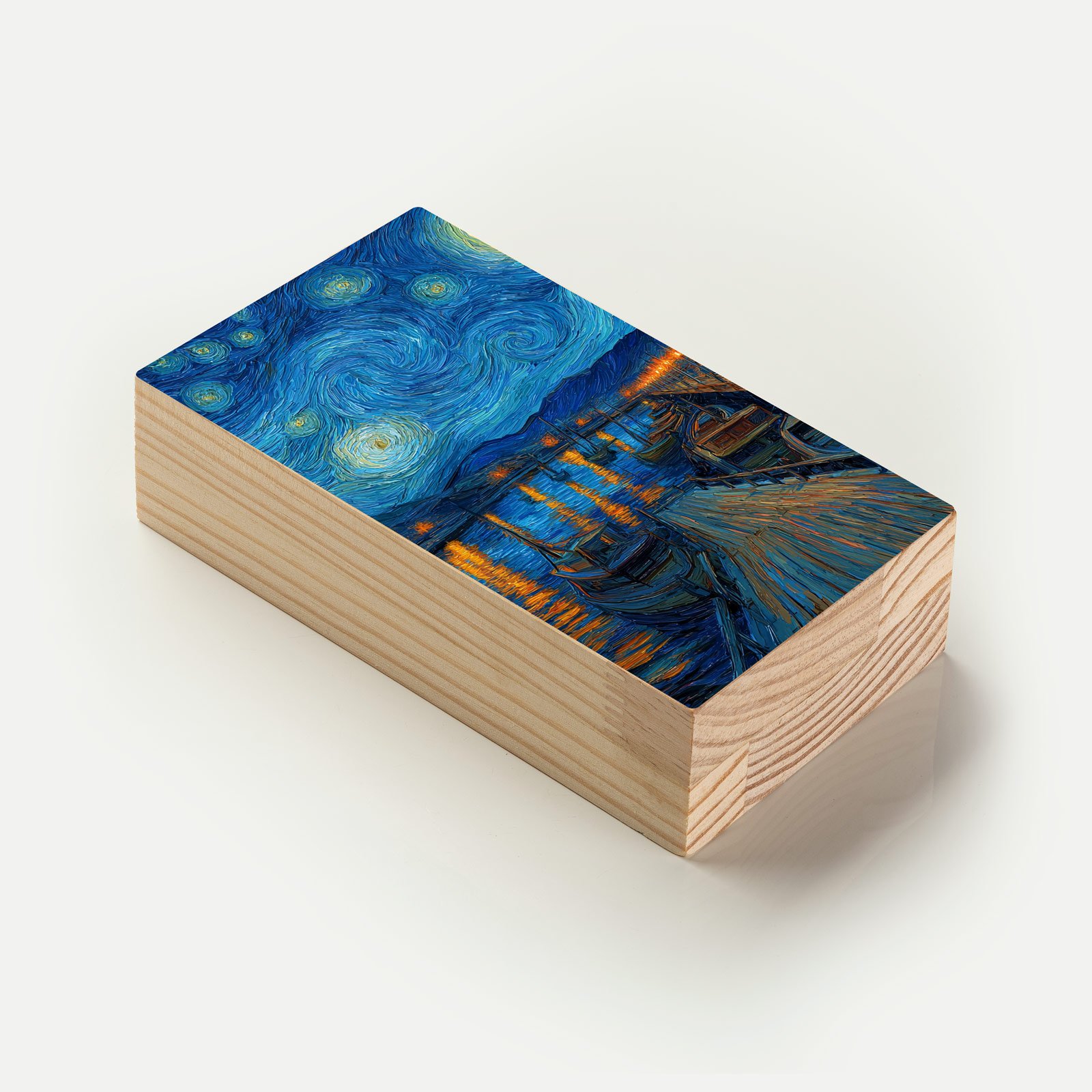 Com pinceladas intensas e carregadas de emoção, “Noite de Luzes” recria a atmosfera mágica da noite estrelada sobre o cais, em uma homenagem atemporal ao estilo inconfundível de Van Gogh. As espirais do céu e os reflexos dourados sobre a água evocam movimento, energia e contemplação.