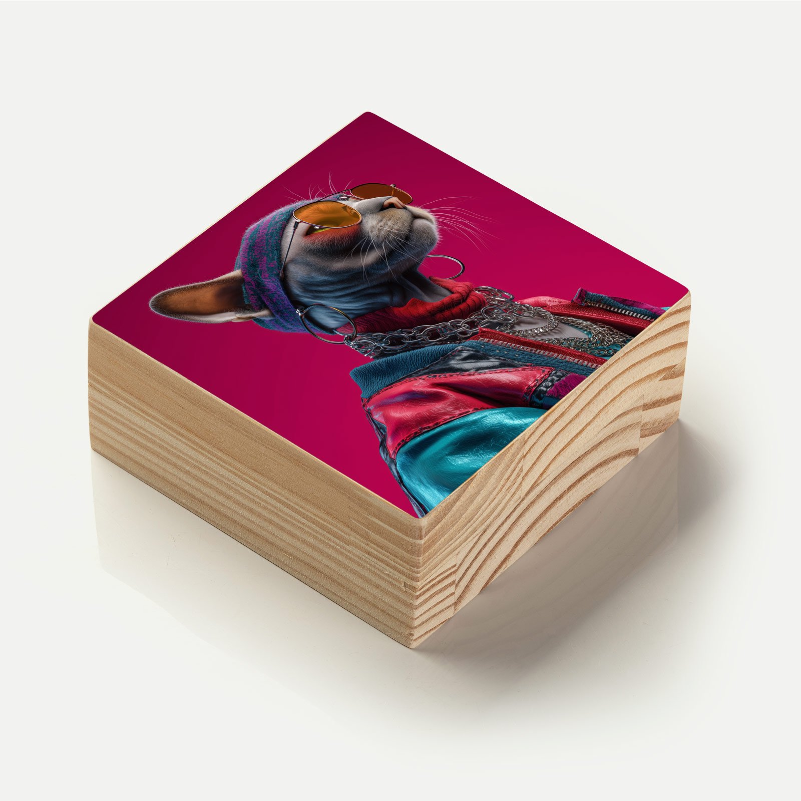 O “O Gato Urbano” é uma explosão de estilo e irreverência. Representado como um sphynx moderno, cheio de atitude, o felino veste jaqueta colorida, colares de corrente, óculos escuros e gorro streetwear. É uma obra que une moda, cultura urbana e a personalidade destemida dos gatos em uma composição vibrante e cheia de energia.