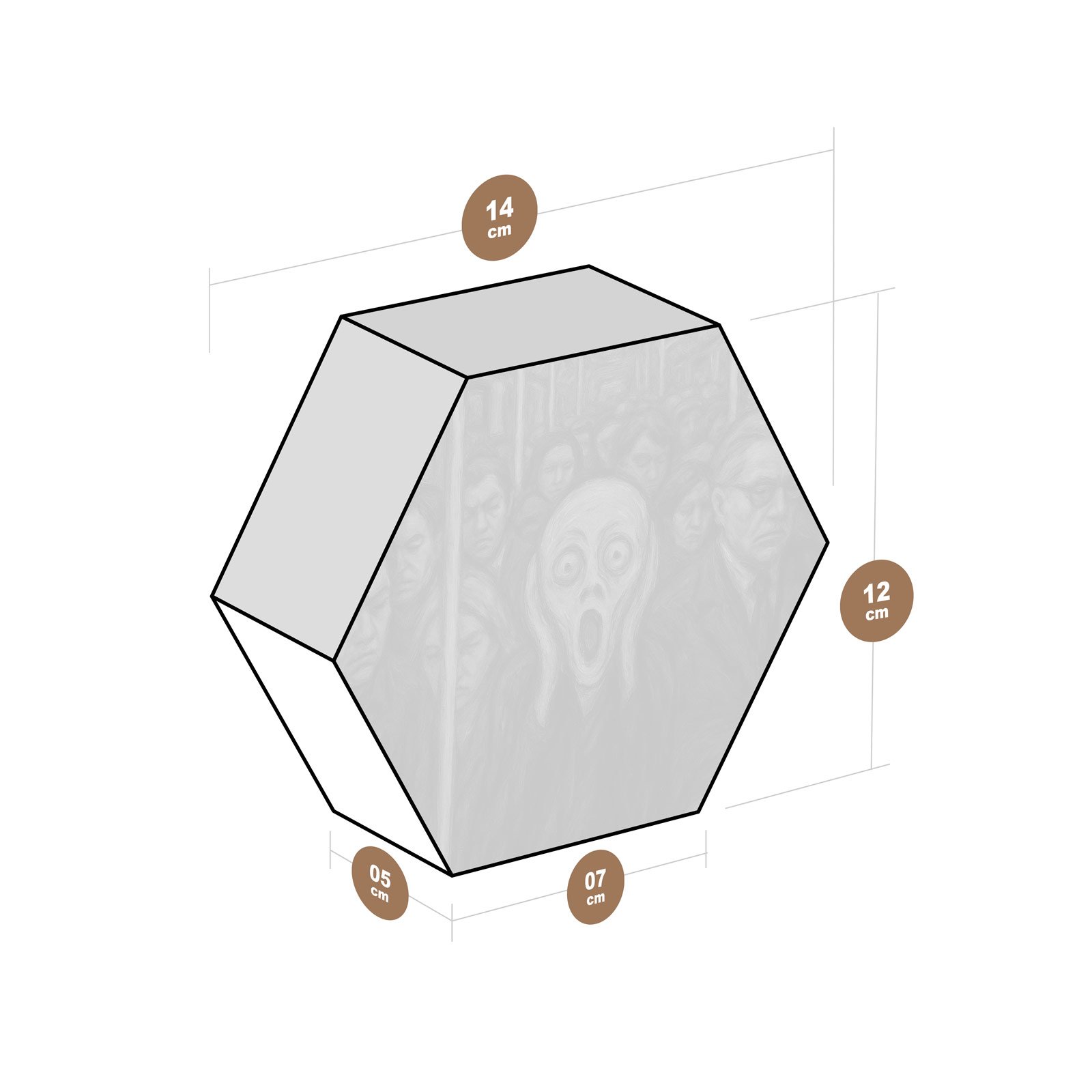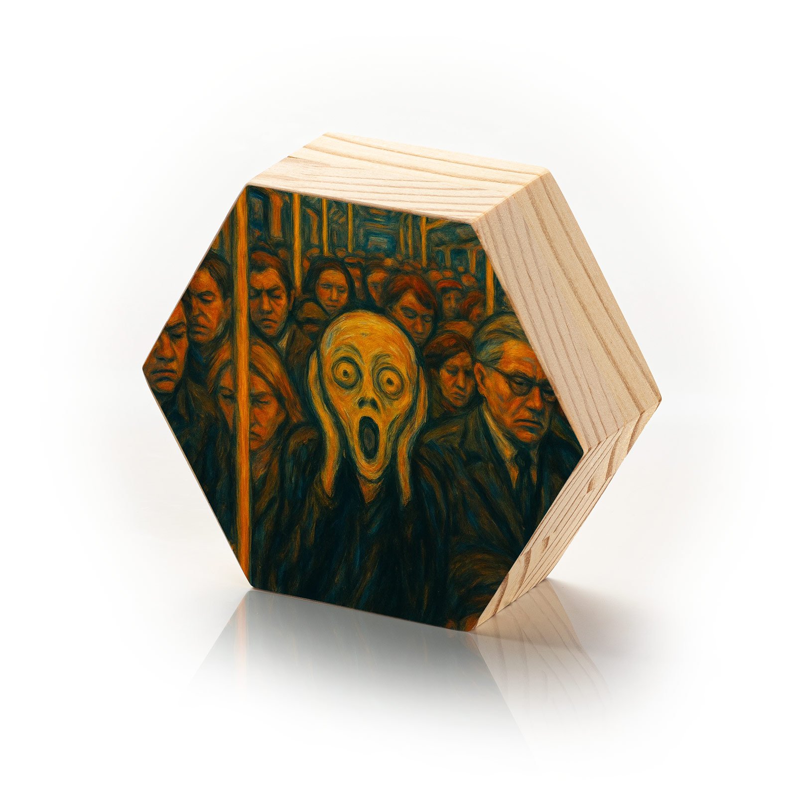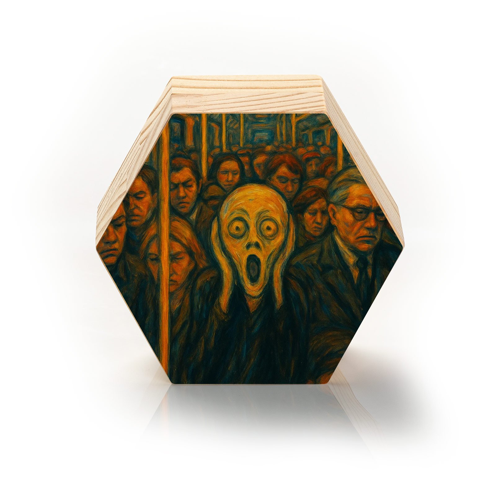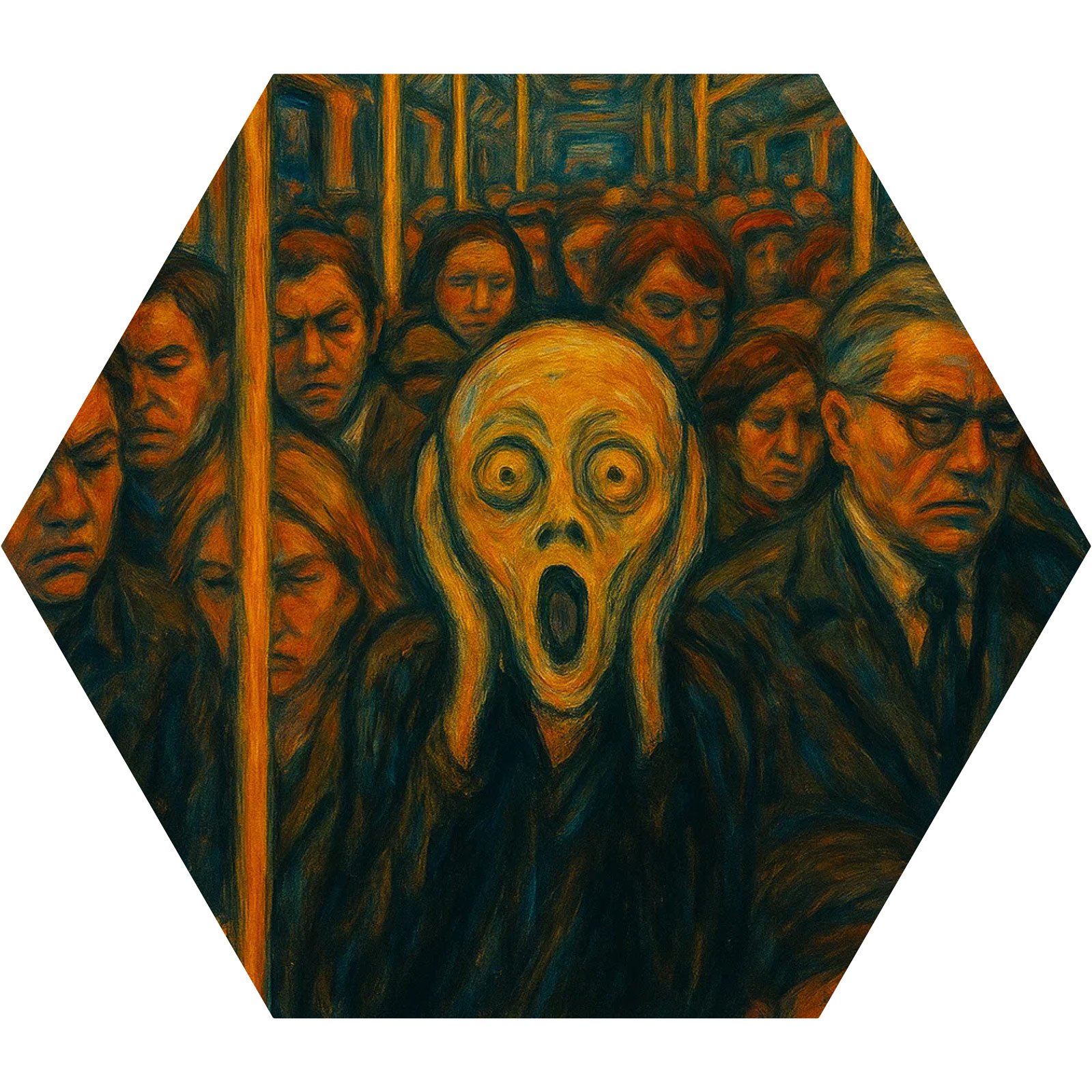 Um grito em meio ao silêncio urbano. O Totem Decorativo “O Grito do Cotidiano” da Linha Hezag reinterpreta a icônica obra de Edvard Munch em um cenário moderno, onde a figura central expressa, com intensidade, o peso invisível da rotina e da ansiedade contemporânea. Cercado por rostos apáticos em um vagão lotado, o grito se torna símbolo da alma que ainda resiste.