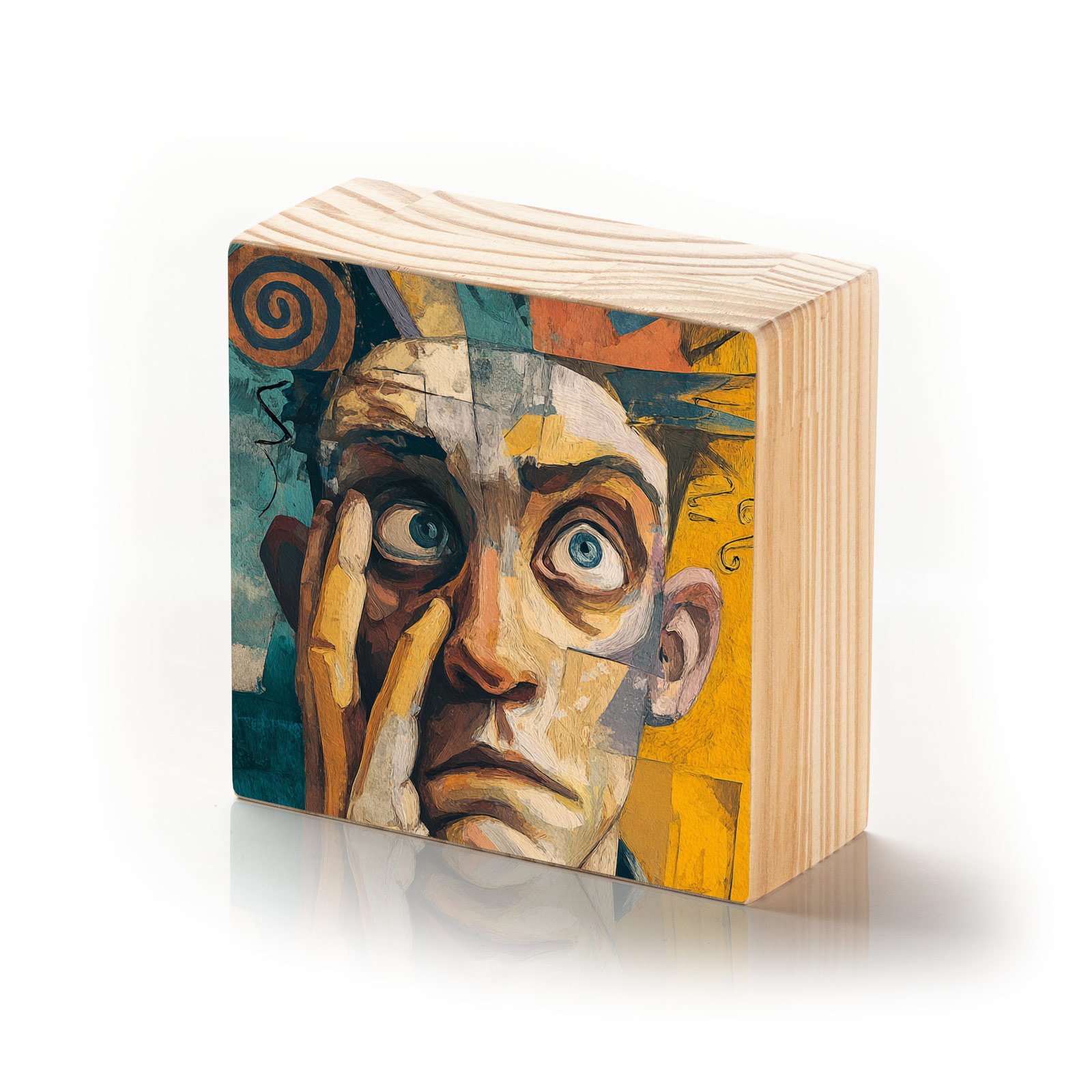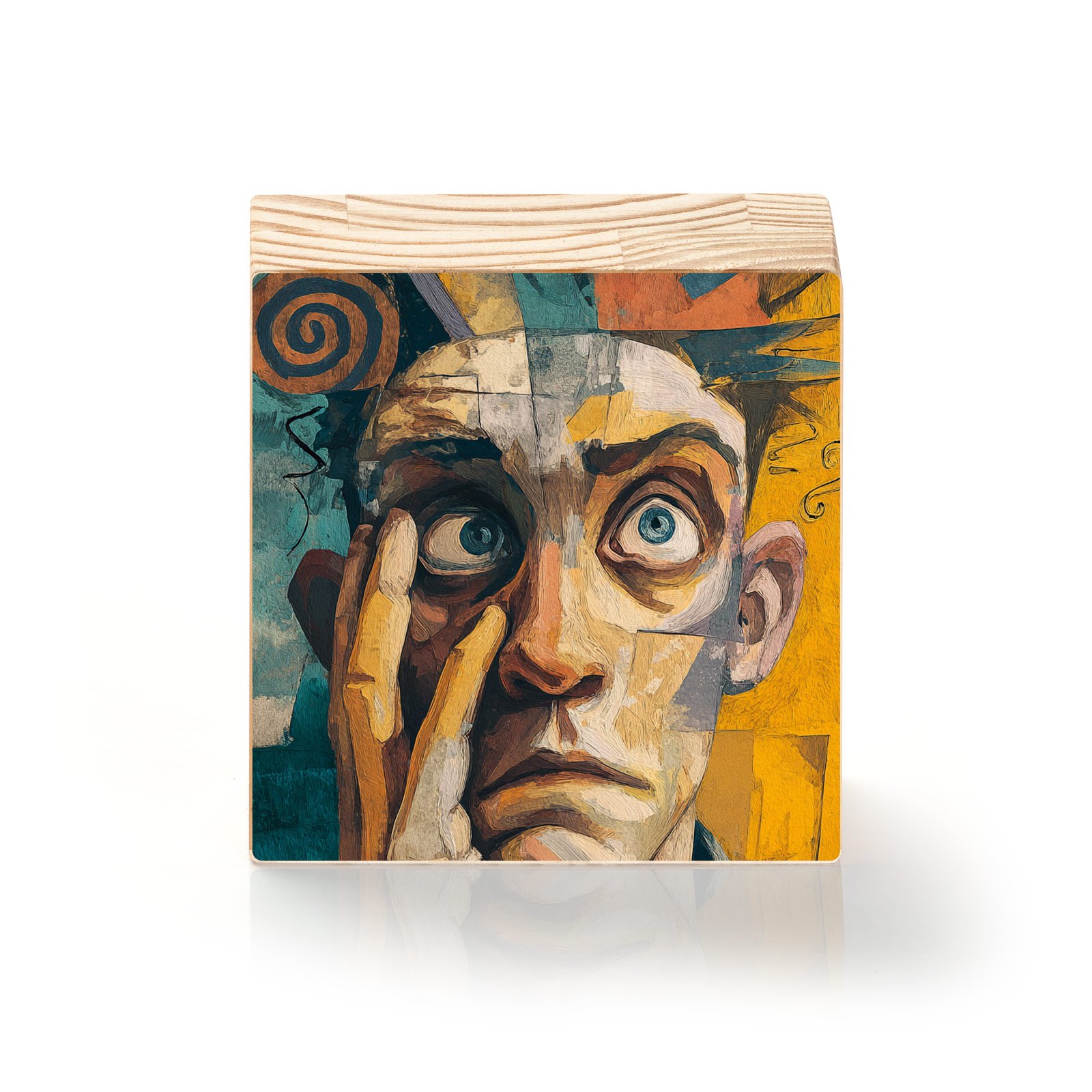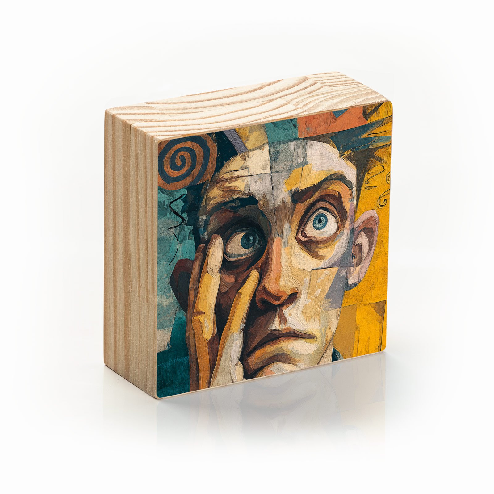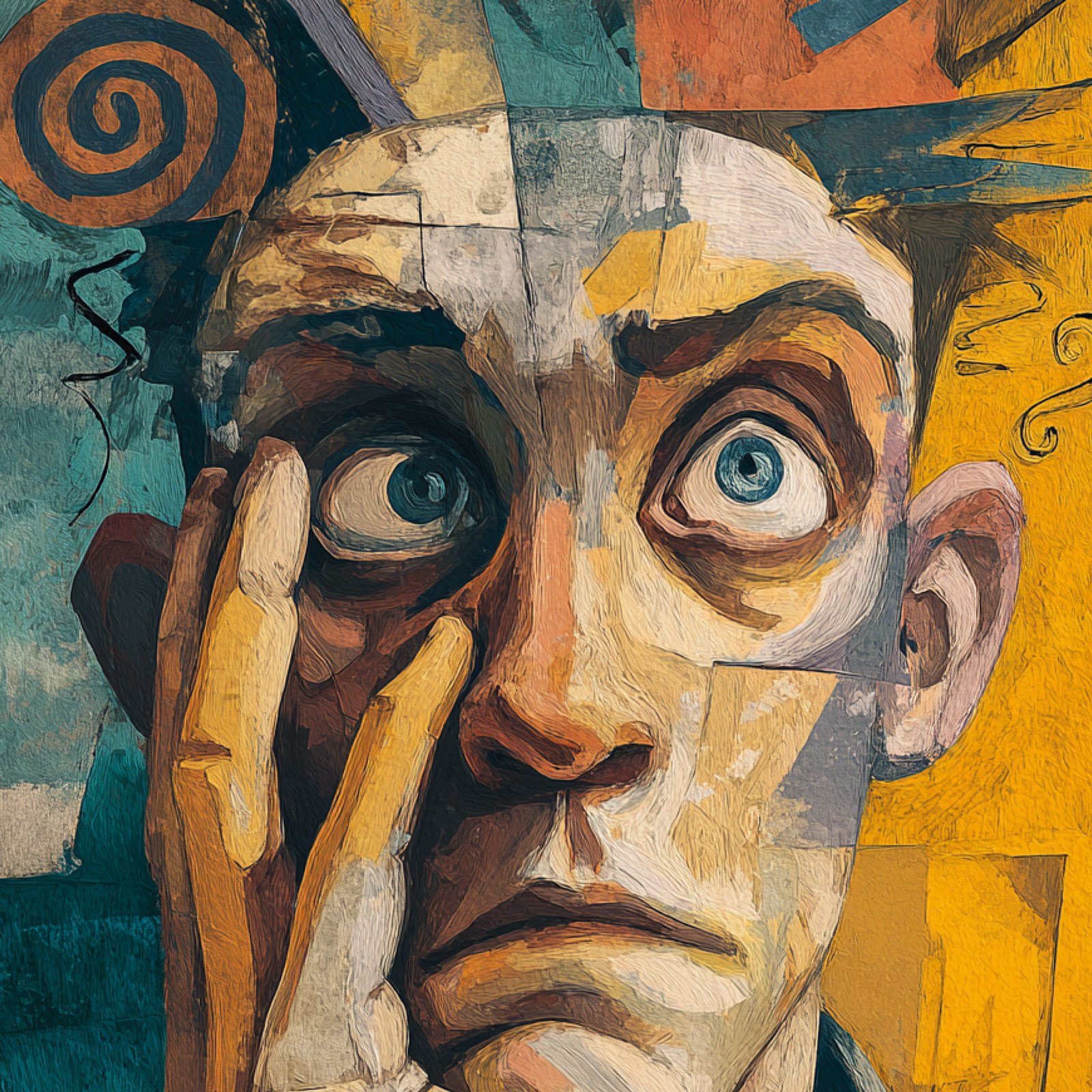 Um retrato intenso que mistura traços cubistas e pinceladas vibrantes. “O Grito Interno” traduz angústia, perplexidade e reflexão em uma só imagem — um convite à contemplação da mente humana e suas camadas de sentimentos.