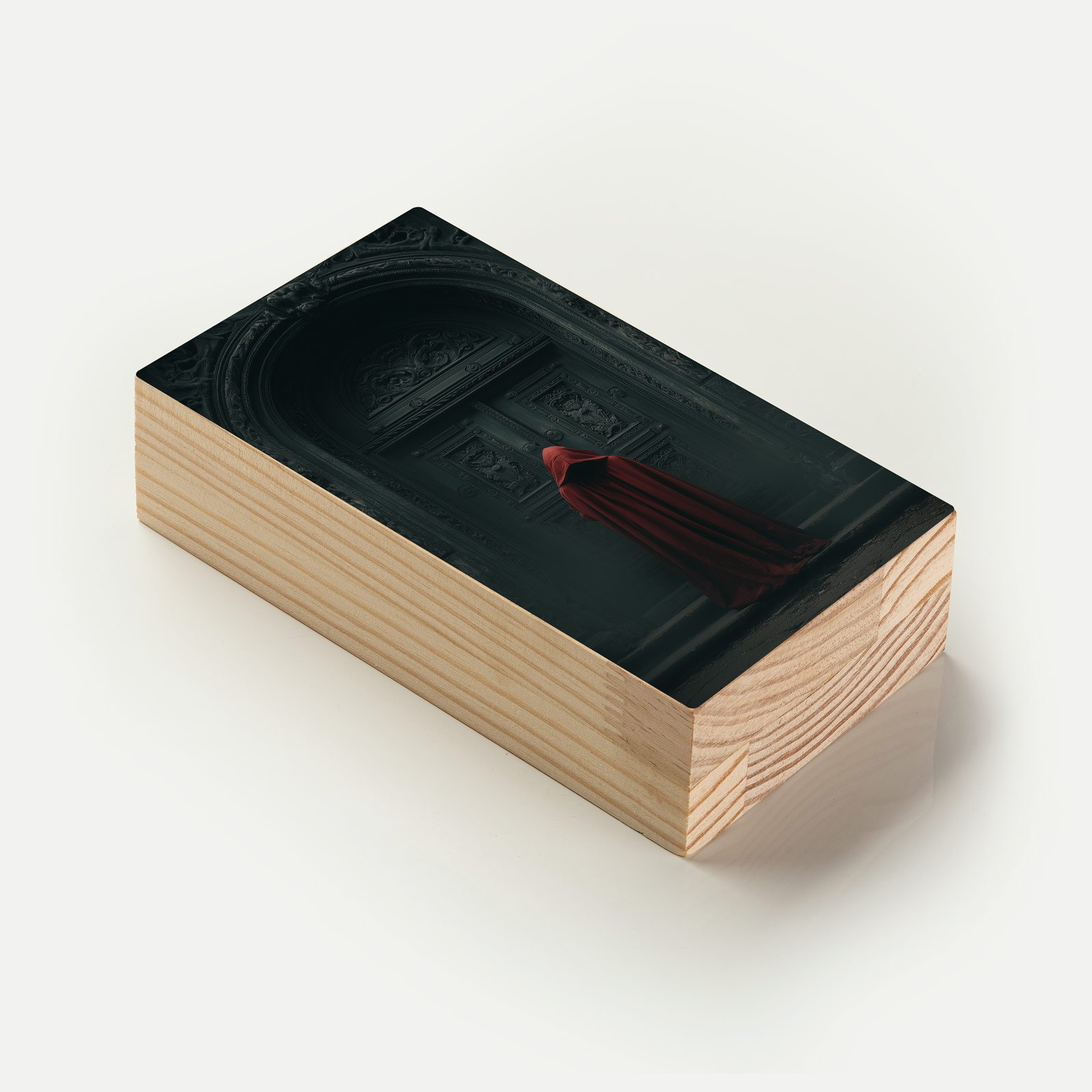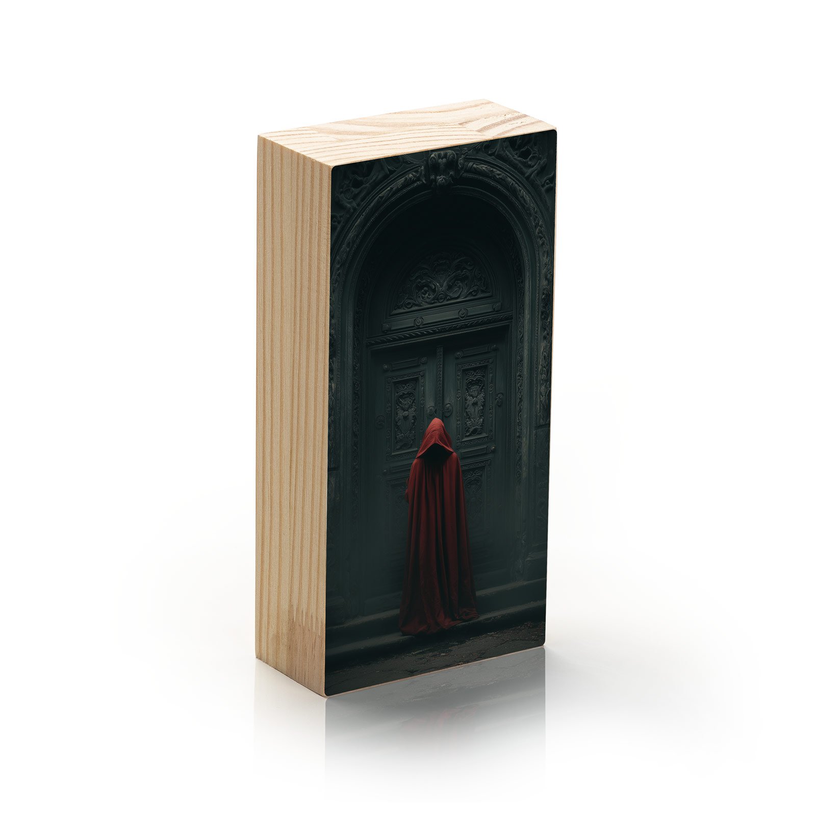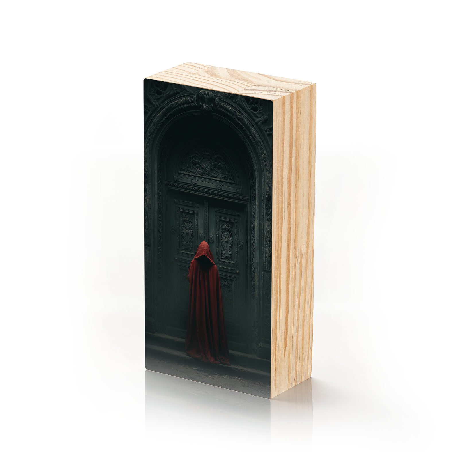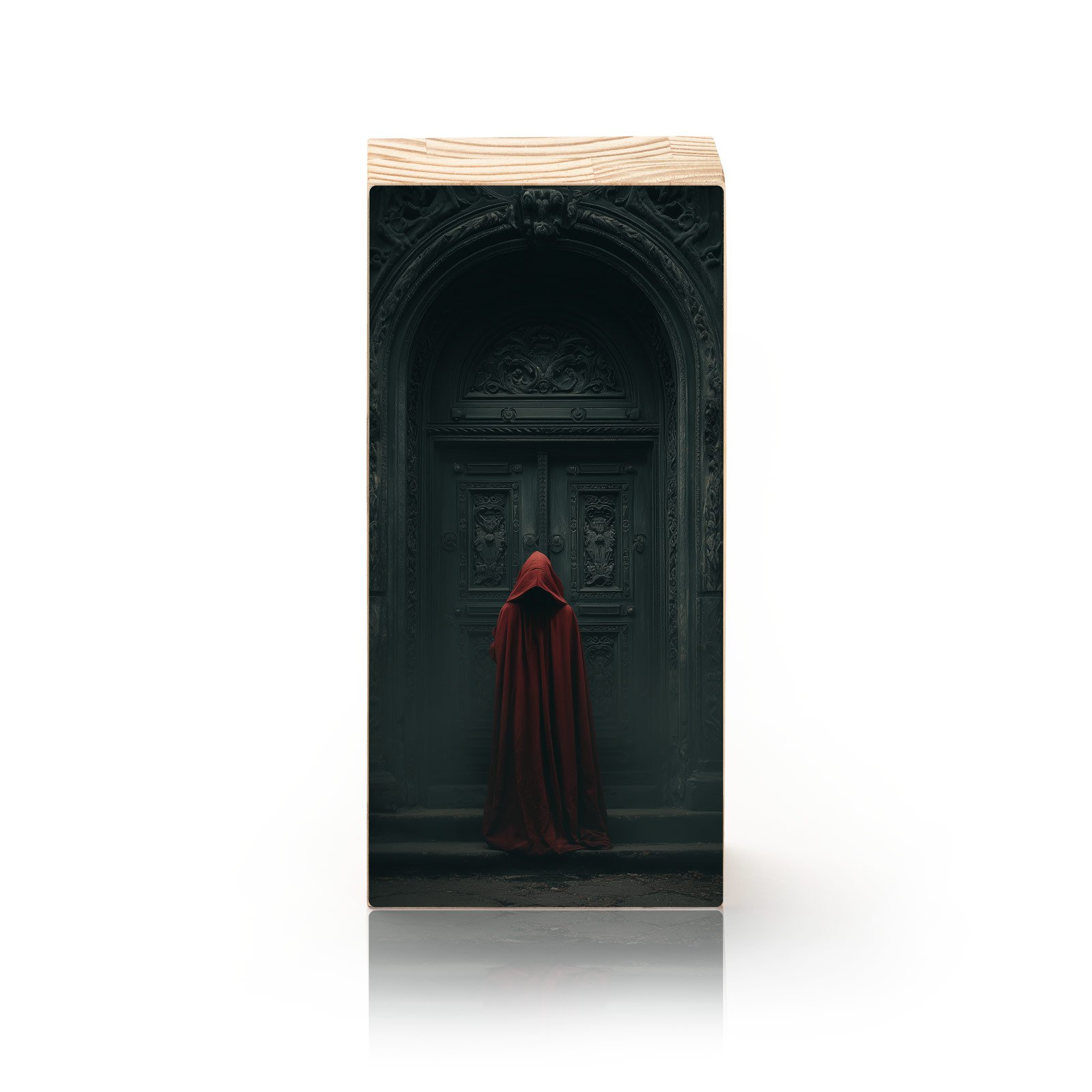 Silencioso diante de portas antigas, “O Guardião do Umbral” veste um manto vermelho profundo que contrasta com a escuridão do entorno. Sua presença sugere mistério e poder, como se fosse o último elo entre o mundo conhecido e segredos guardados além do olhar humano.