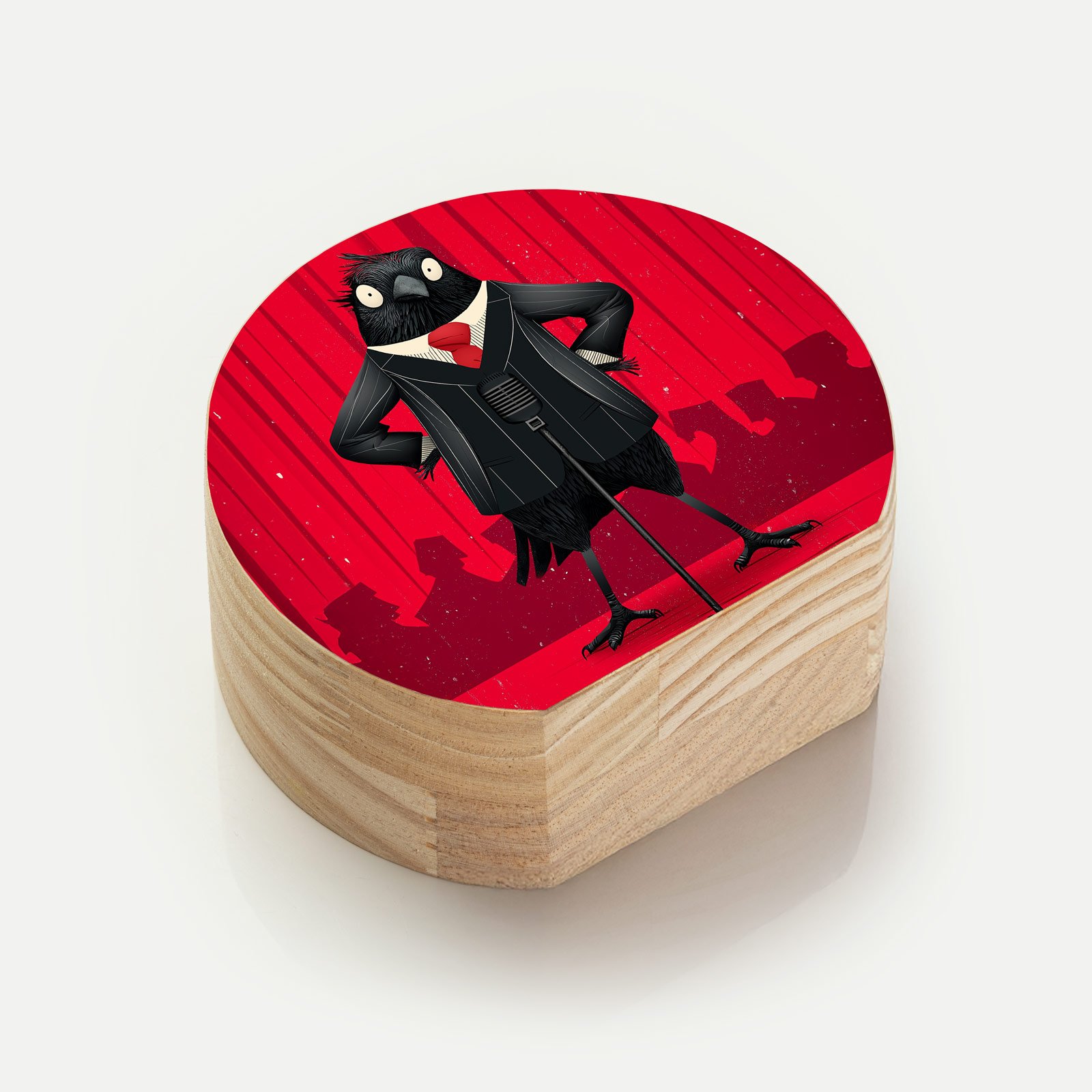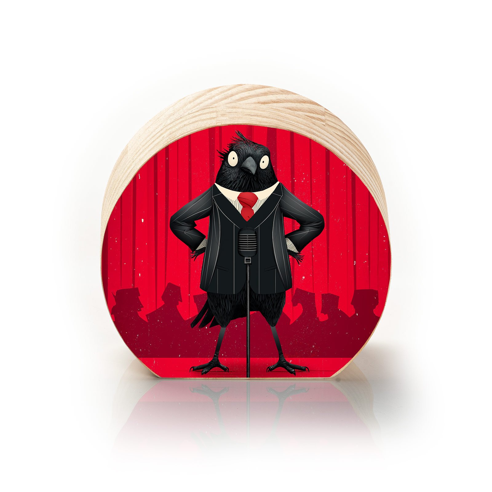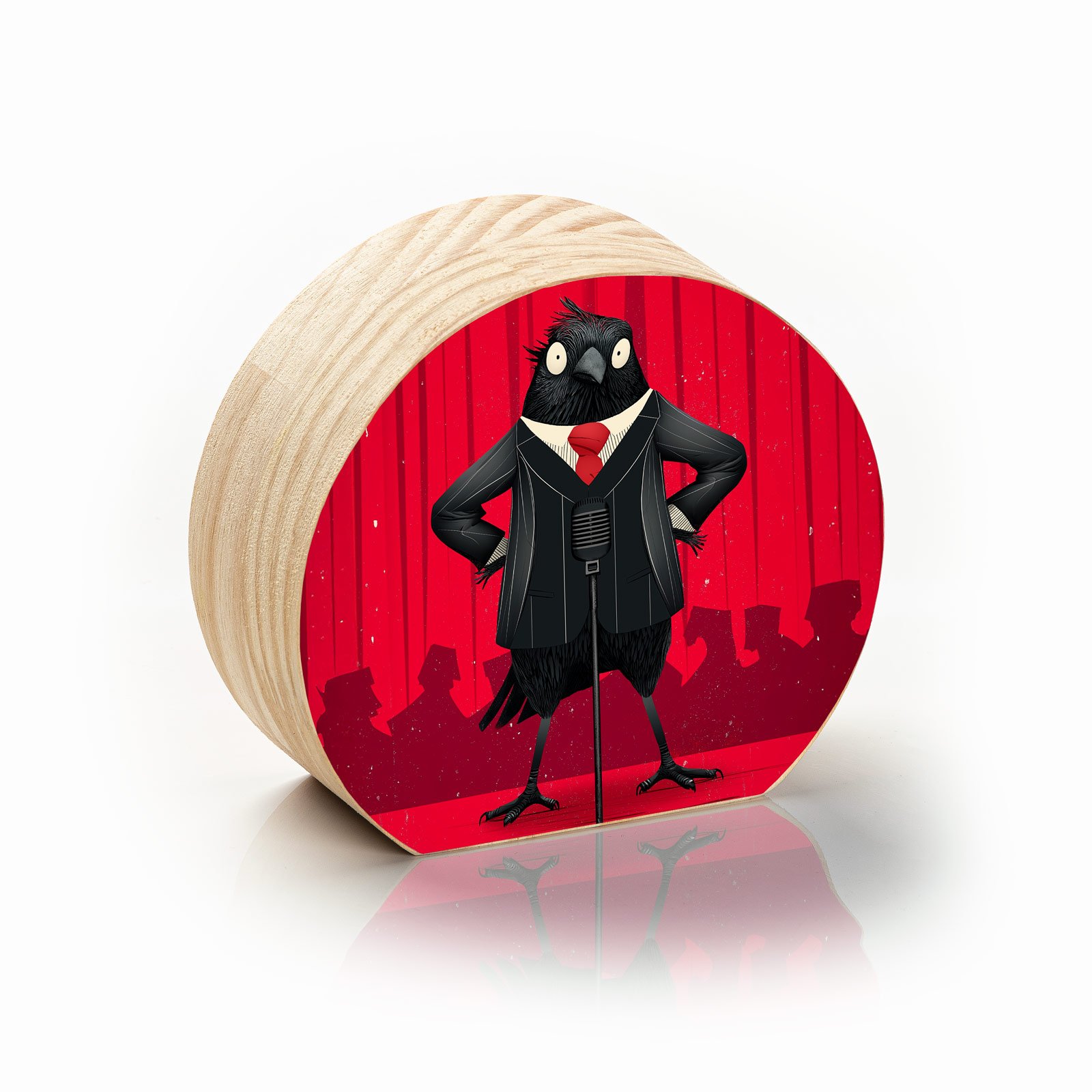 Com traços caricatos e atmosfera teatral, “O Orador” retrata um corvo imponente, vestido em terno e gravata, pronto para discursar diante de uma plateia invisível. Sua postura firme e olhar intenso revelam tanto a seriedade quanto o humor ácido de uma figura que poderia estar entre o poder e a sátira.