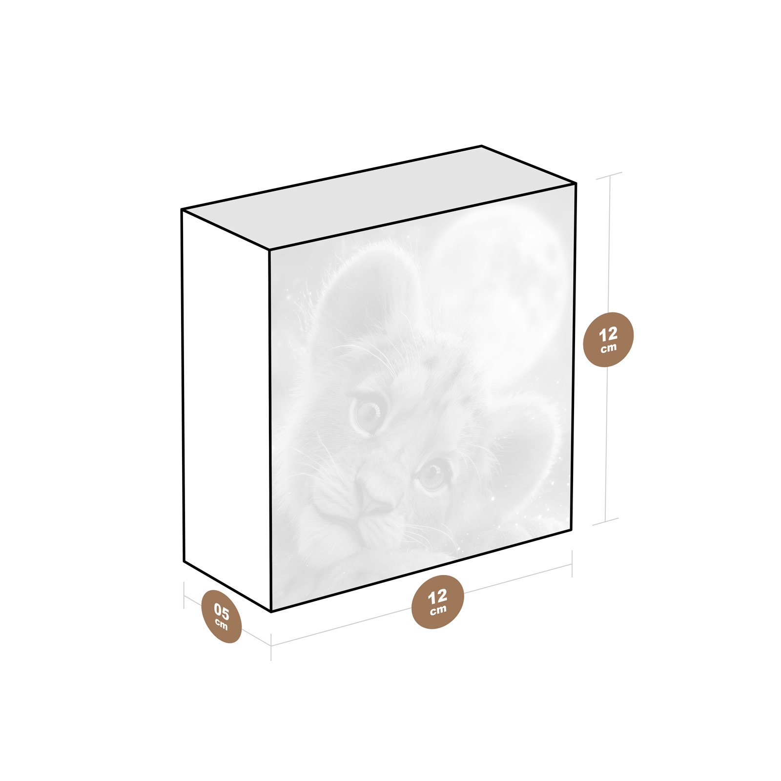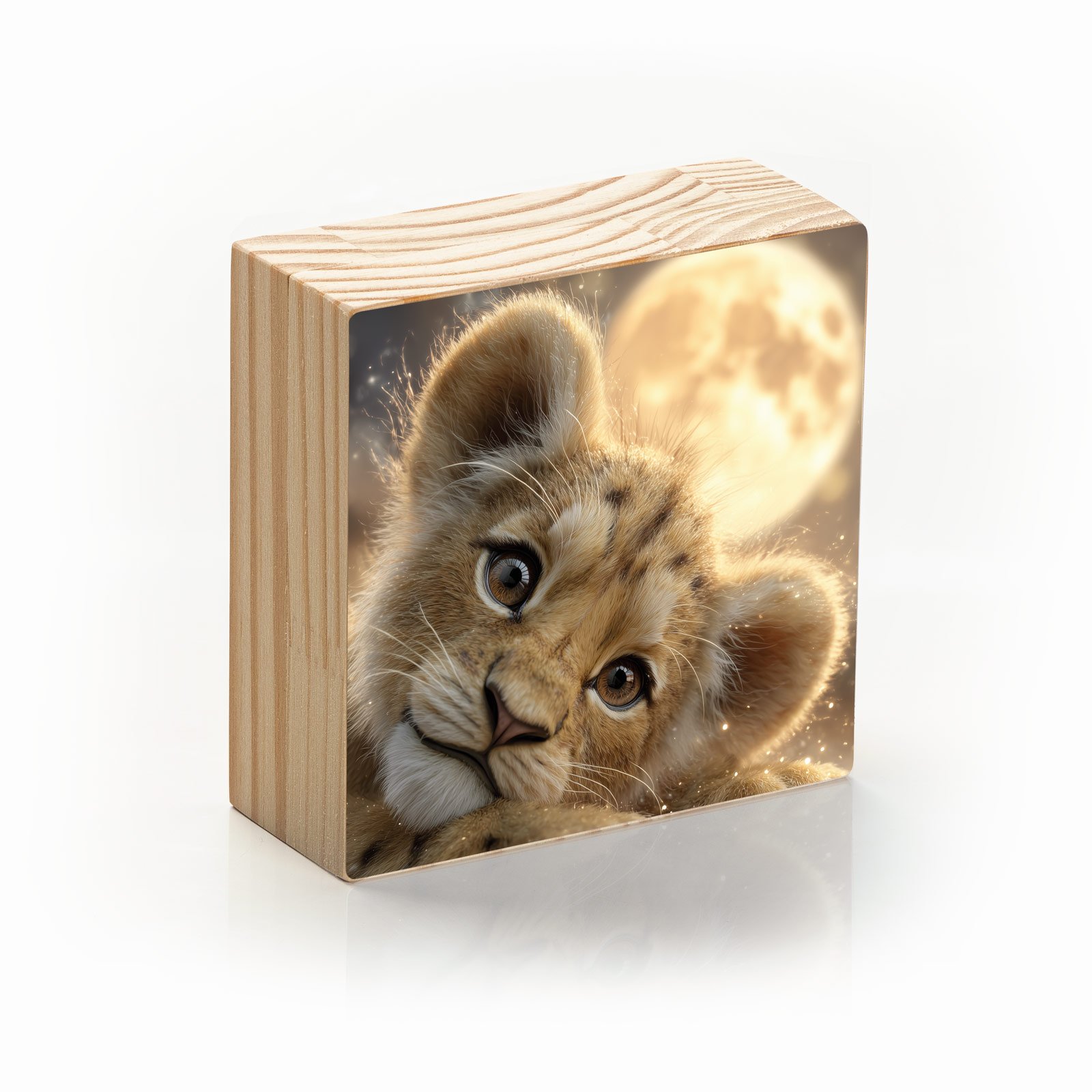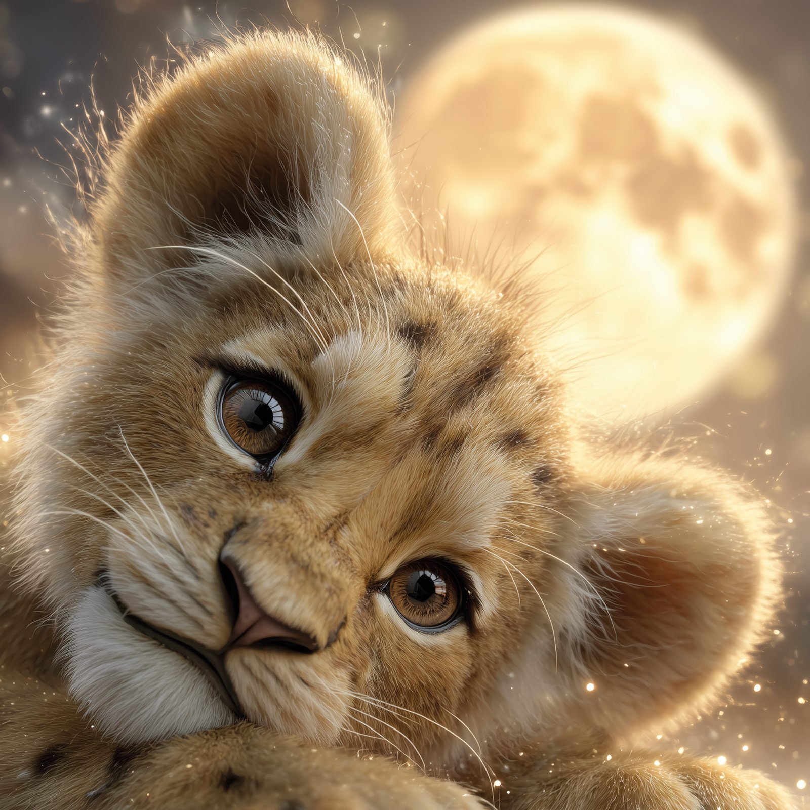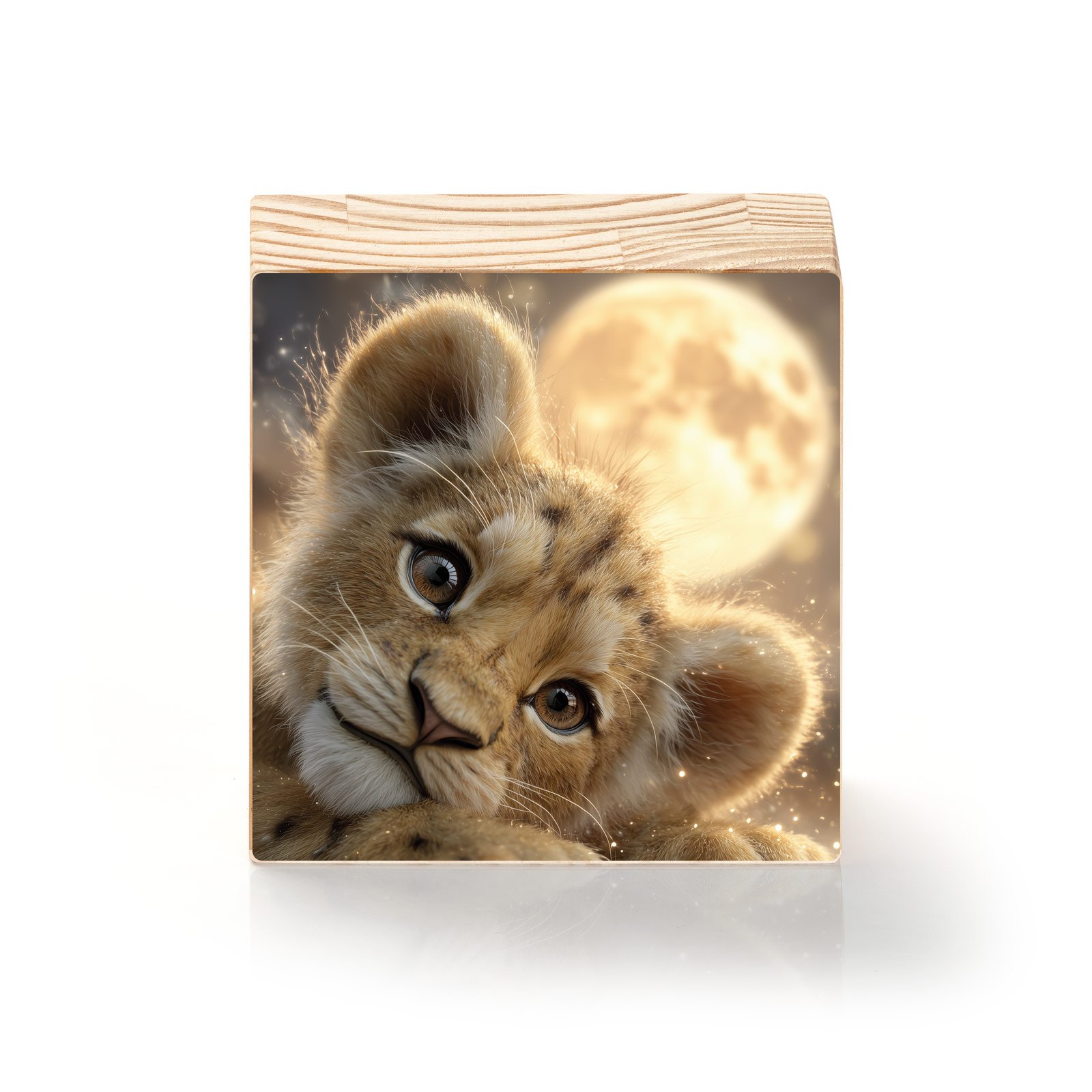 A ternura de um filhote de leão repousando sob a luz da lua cheia inspira aconchego e esperança. “Olhar da Lua” é um totem que simboliza inocência, sonhos e a força que nasce da pureza. Uma peça que desperta a magia da natureza em sua forma mais doce.