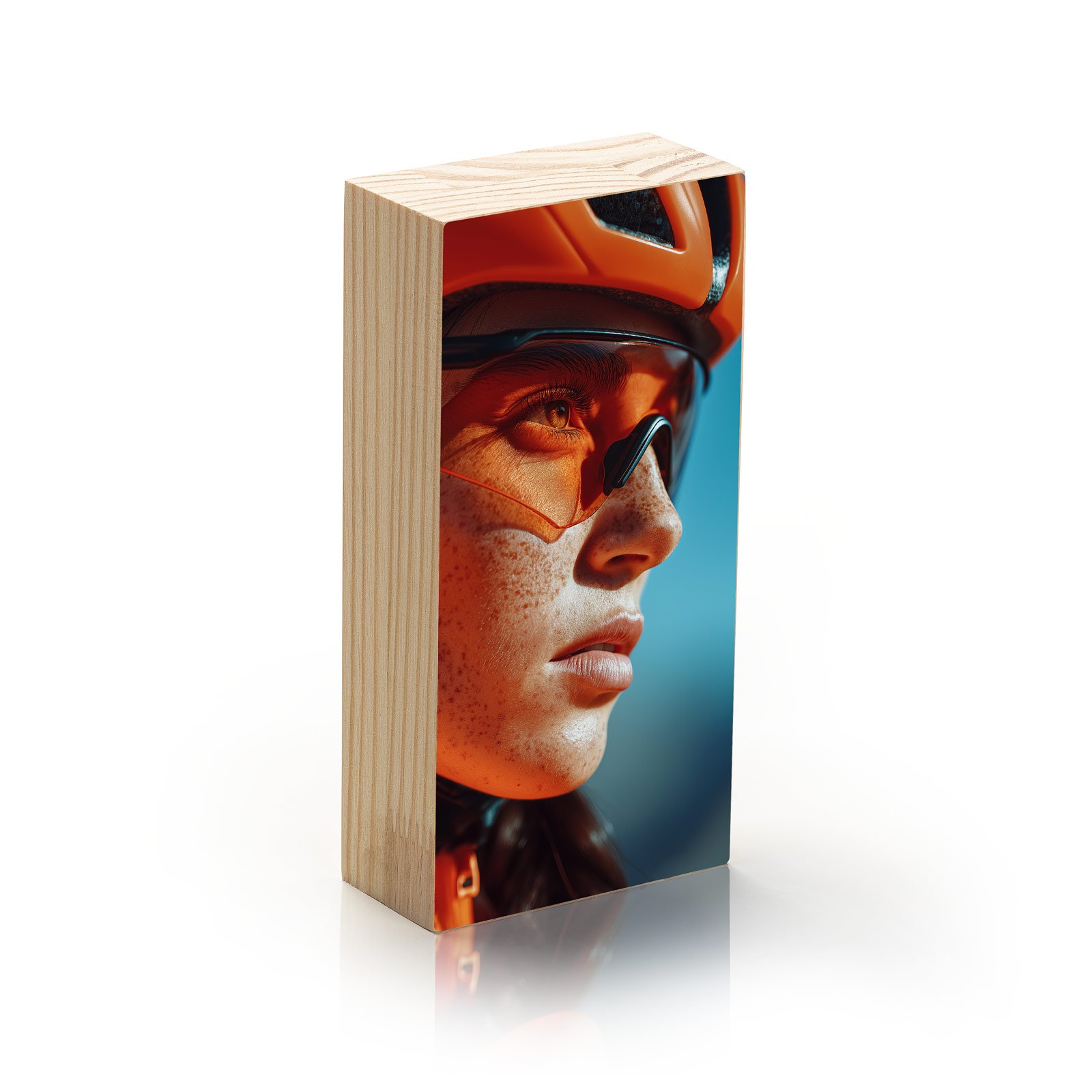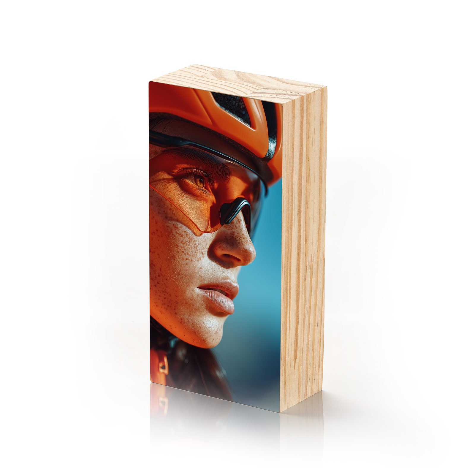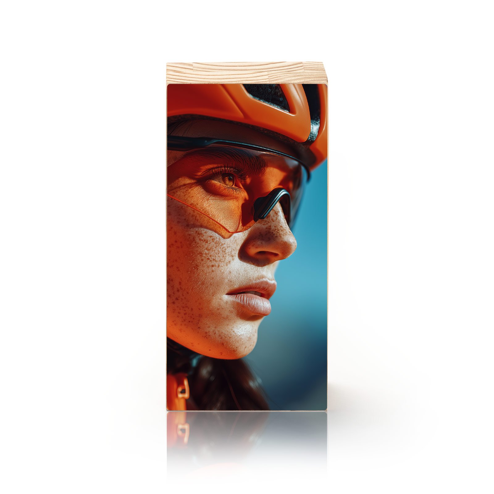 Em tons vibrantes de laranja e azul, “Olhos de Velocidade” captura o instante de concentração absoluta de uma ciclista. O reflexo da luz nos óculos transmite garra, superação e preparo para o próximo desafio. Uma peça que inspira movimento e energia, perfeita para ambientes que valorizam força, foco e atitude.