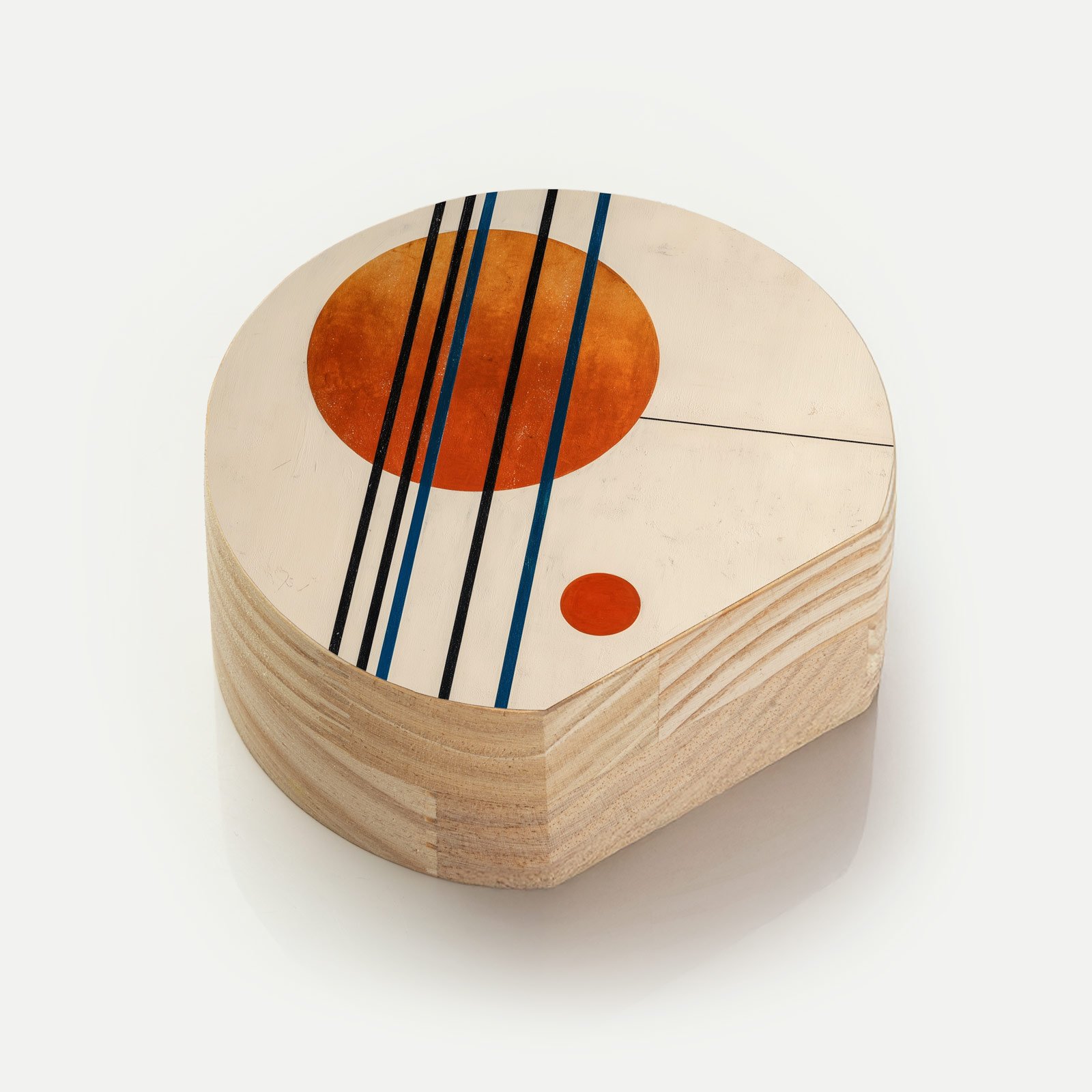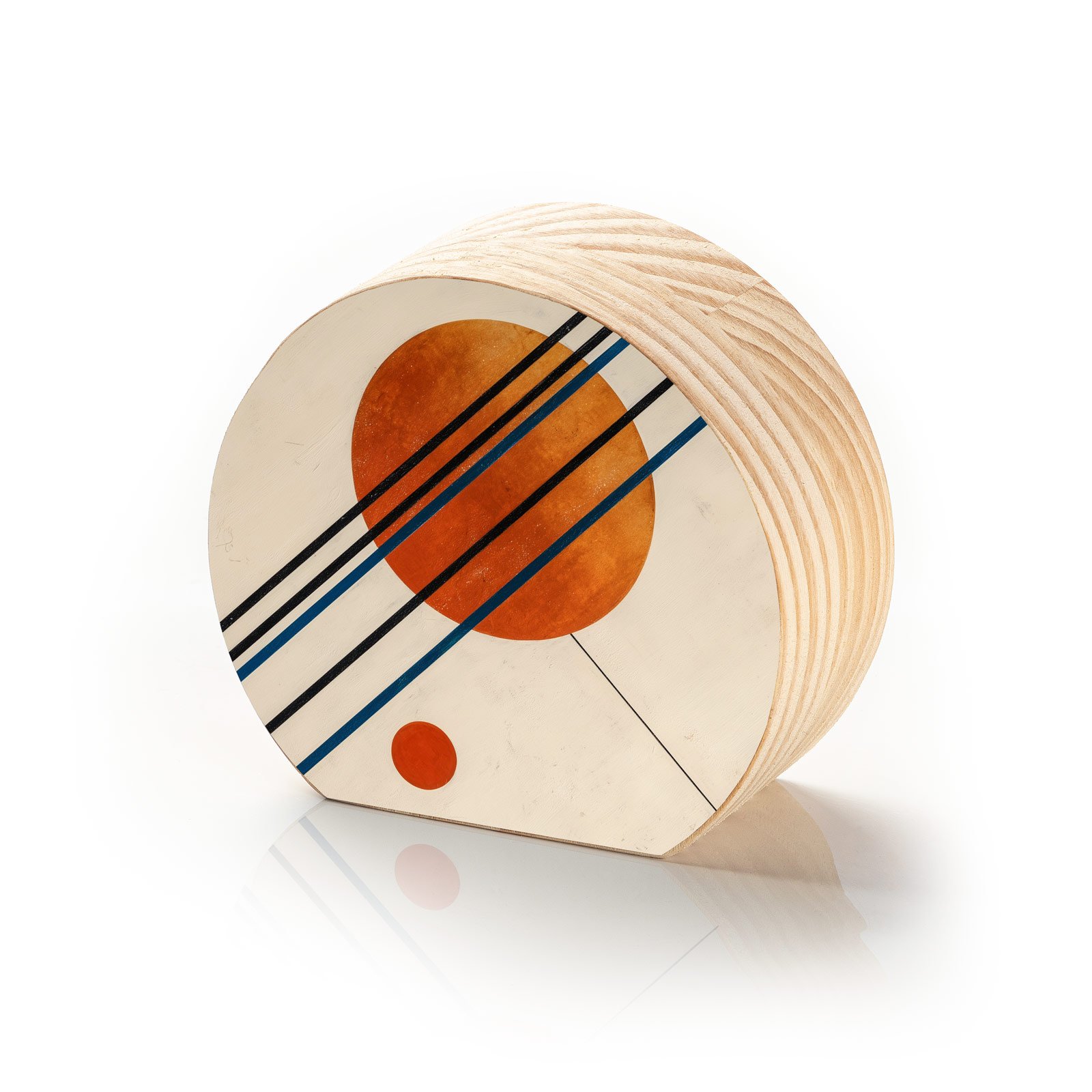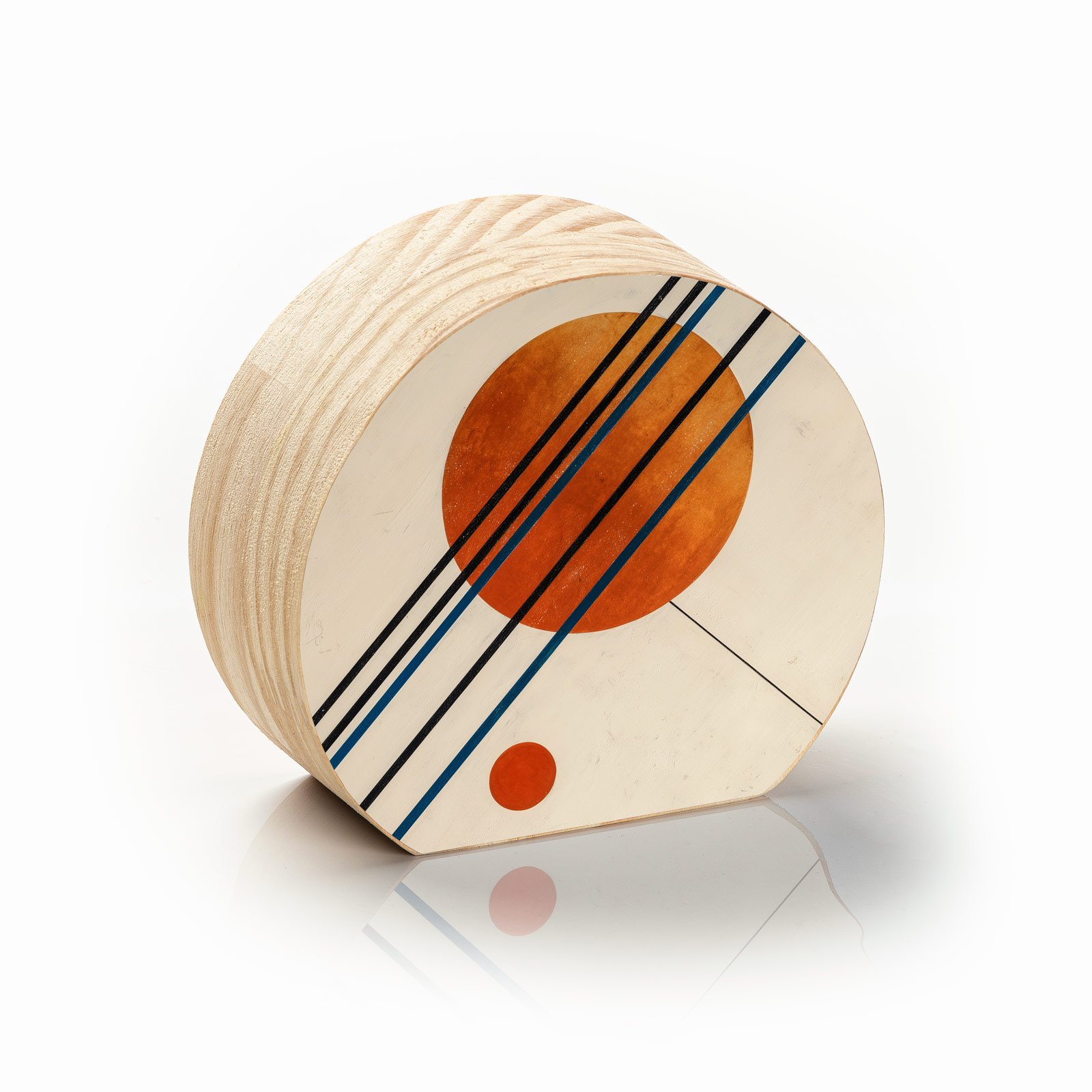“Órbita Linear” da Linha Luna, é um exercício de precisão e equilíbrio visual. Círculos solares contrastam com linhas rígidas que cortam o espaço em diagonais perfeitas. A obra sugere movimento contínuo, como se os astros e suas trajetórias pudessem ser capturados em um instante geométrico e eterno.