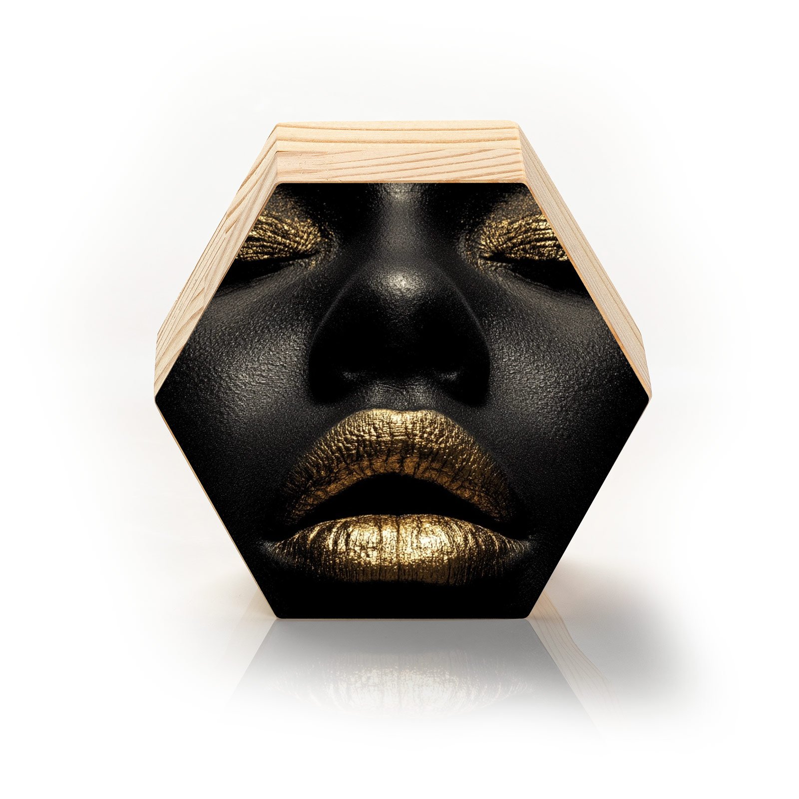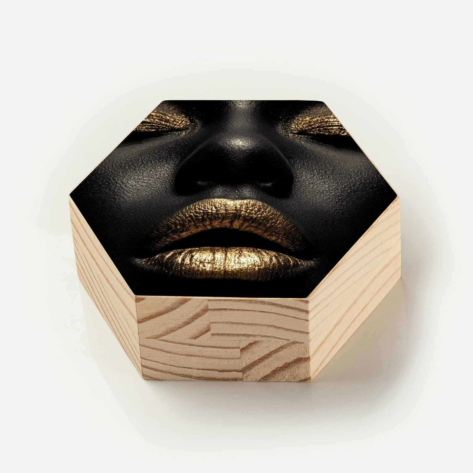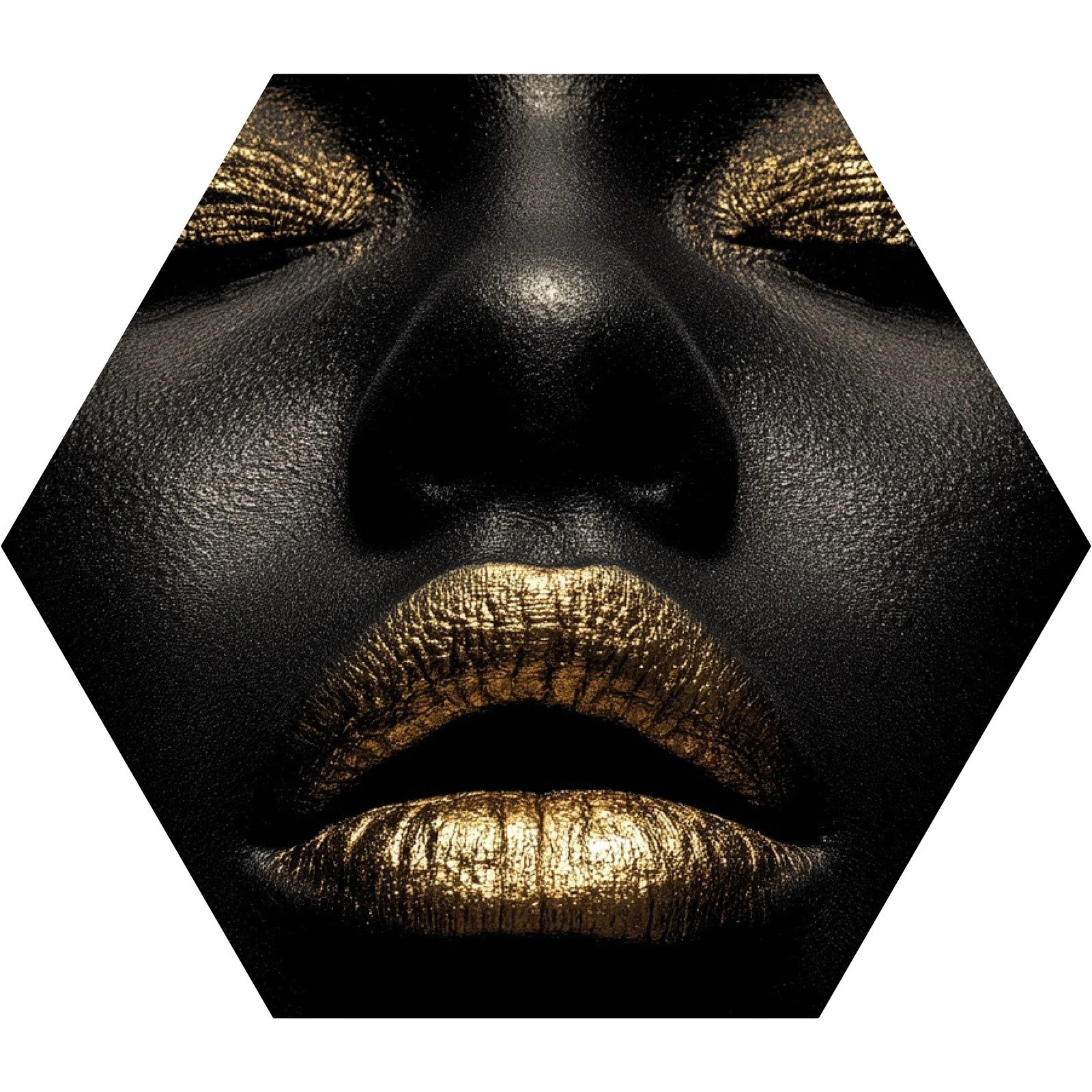 Silêncio que grita. O totem “Ouro Silenciado” da Linha Hezag, é uma declaração visual de força, elegância e resistência. Um rosto esculpido em sombras profundas, com olhos cerrados e lábios selados em ouro: um símbolo da potência que habita o não dito, do luxo que emerge do silêncio.