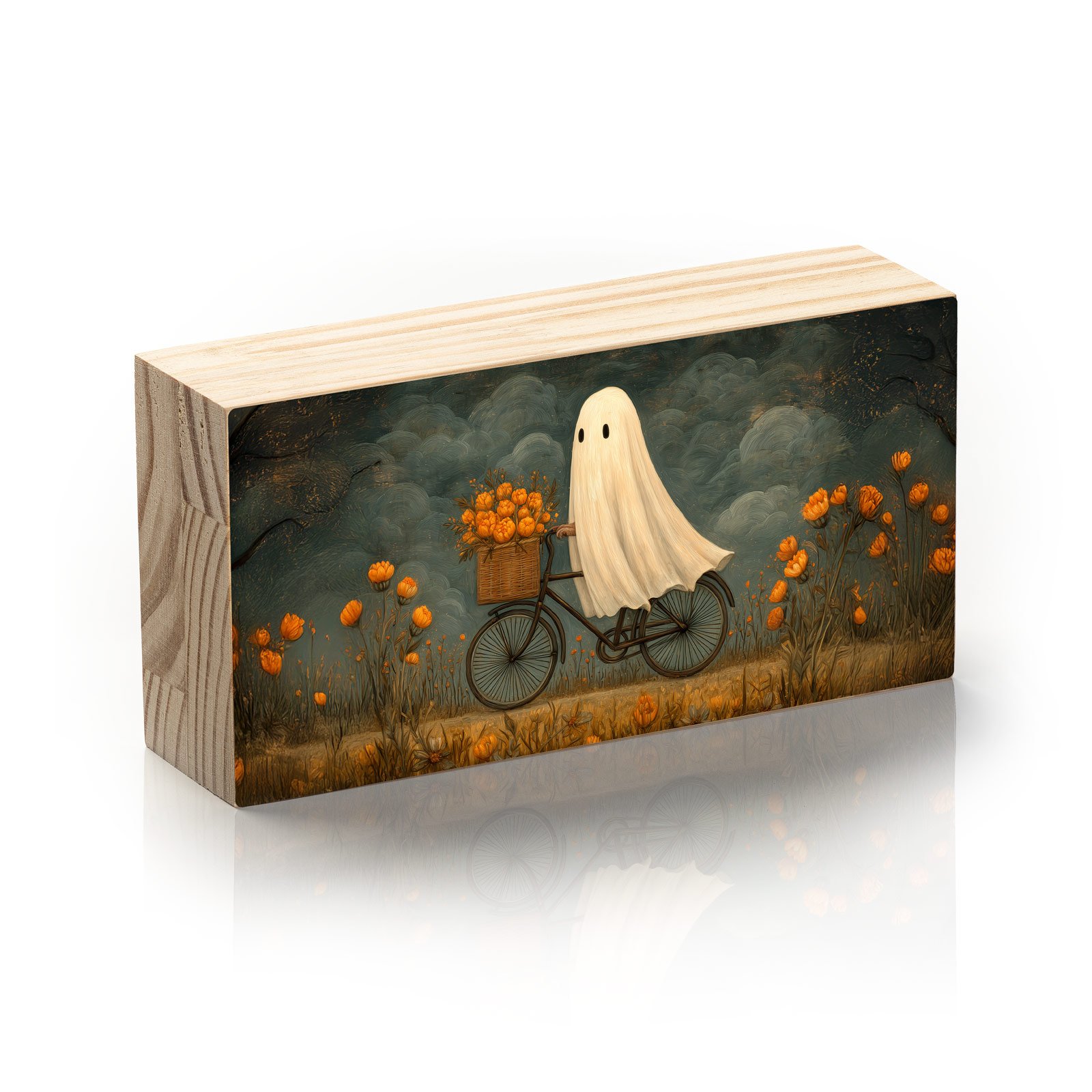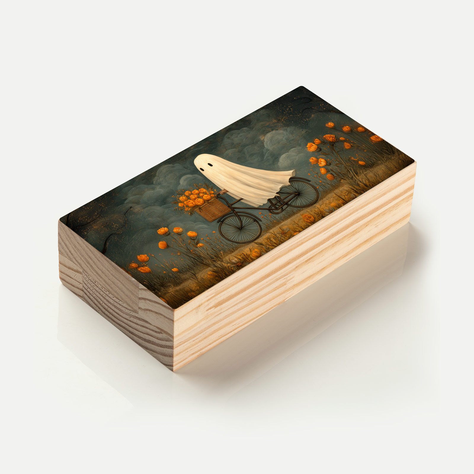 Entre tons sombrios e floridos, “Passeio Fantasma” traz a leveza poética de uma cena insólita: um pequeno fantasma deslizando de bicicleta por um campo dourado de flores. A delicadeza da composição equilibra o lúdico e o melancólico, transformando o sobrenatural em ternura e contemplação.